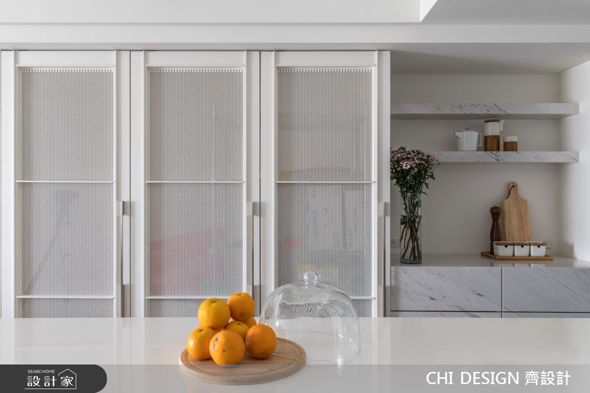 覺得北歐風過於簡約,又認為工業風太重口味了嗎?試著以素雅白色系為基底,輔以鐵件吊燈、櫃架、木質感及植栽作巧妙搭配,把北歐風與工業風作出最黃金比例的平衡!一起來看看設計師如何詮釋嶄新的北歐居家! 首先設計師以開放式格局作為公共場域規劃,無牆隔設計除了節省空間之外,同時也營造出寬廣通透的視覺效果,二來也方便全家人溝通聊天,不管家人坐在客餐廳何處,皆能愜意閒聊、形塑溫馨家庭氣氛。潔淨純白色調的中島吧台區也讓整體空間多了沉穩寧靜的極簡調性,呈現晶亮而俐落的時尚感;電視牆上的沁涼淡藍與淺色木地板營造放鬆情韻,搭配落地窗充沛盈滿日光,呼應著大自然的愜意氣息。 此外,設計師的一大巧思便是鐵件的運用與輕盈的綠意點綴,無論是客廳電視牆的立地式大型植栽龜背芋,用餐區旁的餐桌上的百萬心、鐵件置物架上的常春藤等,櫃架上還展示著屋主精心收藏的海賊王公仔,搭配暖木質感與實木家具,進而舒緩地平衡黑鐵的生冷性格,形成北歐風 + 輕工業風的多元姿態,也讓溫馨品味的居家環境增添多重層次的設計意象。進入臥房,鐵件玻璃隔間延續客餐廳的核心主軸,讓空間更有接續感與連貫性,同時也有舒適恬然的空間氛圍。 小編的最愛 以淡色系為主軸的居家空間充滿紓壓放鬆的氛圍,最喜歡大理石餐具櫃的素雅細緻感!