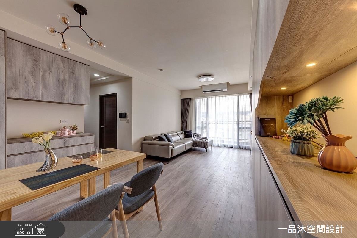 一品沐空間設計以乳膠漆、石英磚/拋光石英磚、系統板材、灰色玻璃、采鏡板的搭配應用,呈現現代簡約風居家氛圍,將此間27坪、三房、單層、新成屋(5年以下)打造成舒適愜意的家庭空間,完成2位大人、1位小孩全家人的夢想之居。