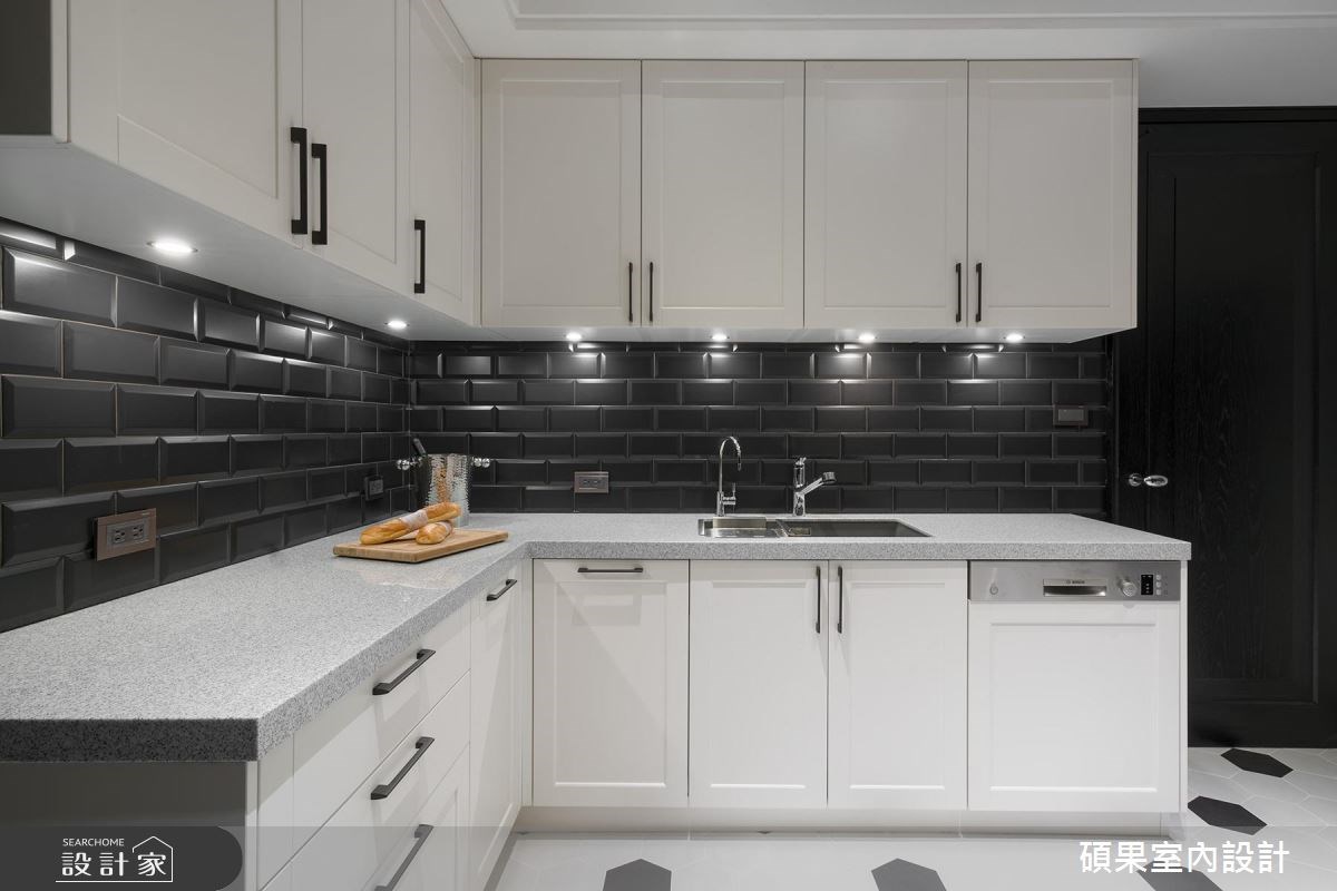 來自碩果室內設計的40坪美式風住宅案,屋主一家人共有2位大人、1位小孩、1位長輩,是一間單層中古屋(5~15年)的三房格局,設計師藉由建材以乳膠漆、花磚、超耐磨木地板、系統板材、賽麗石、線板、噴漆的搭配應用,實現一家人的理想生活。