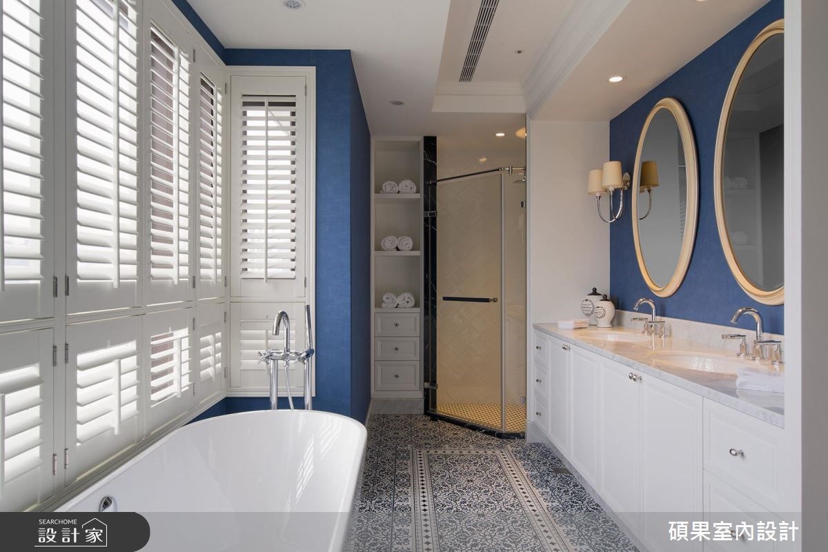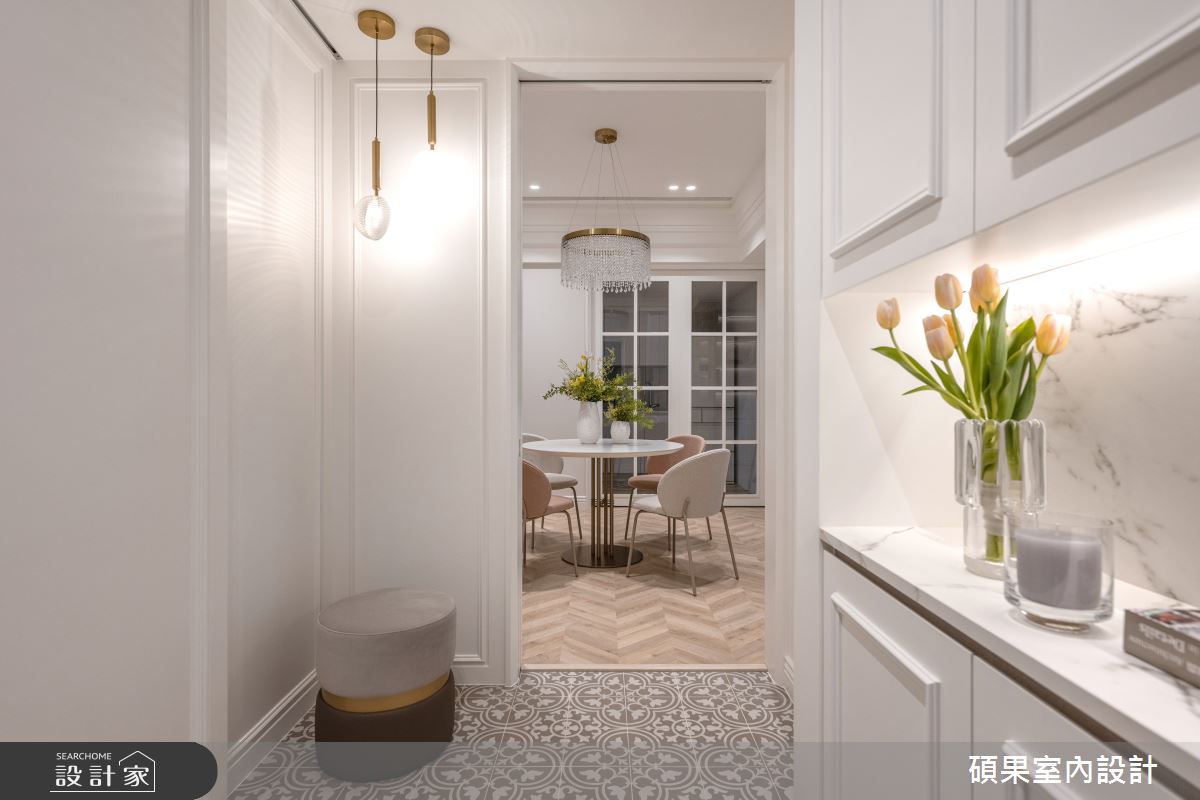 由碩果室內設計精心規劃的25坪兩房住宅空間,家庭成員一共有2位大人、2位長輩。因應屋主需求,設計師運用美式風作為主軸,搭配花磚、磁磚、木百葉、賽麗石、線板、噴漆,打造全家人的夢想家居。