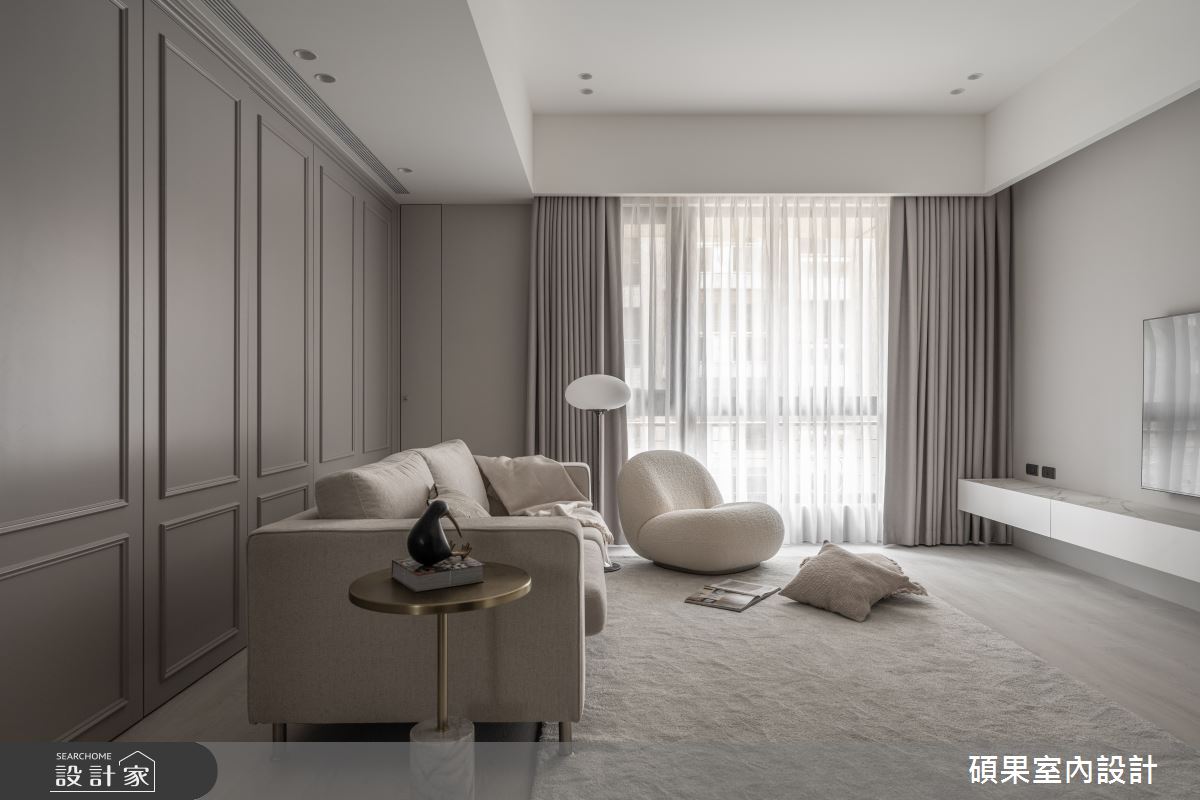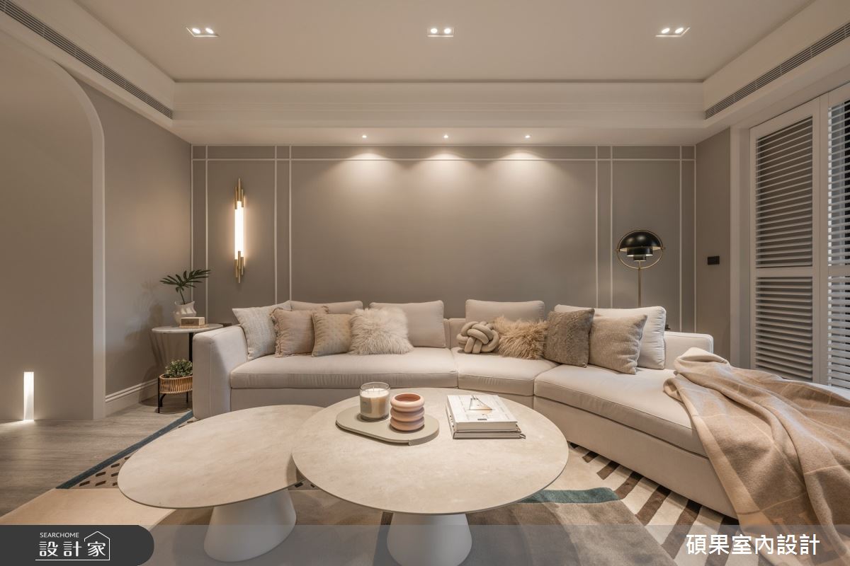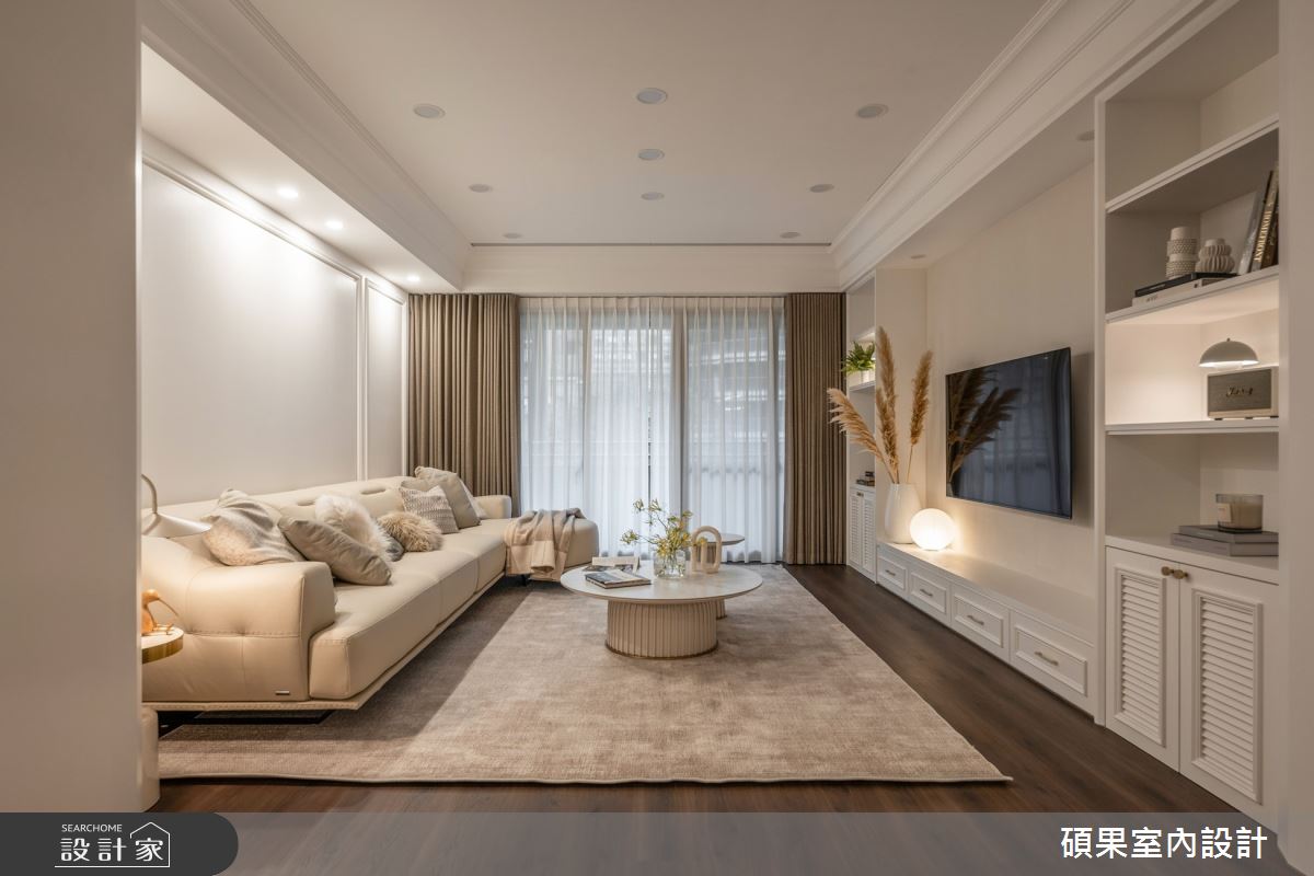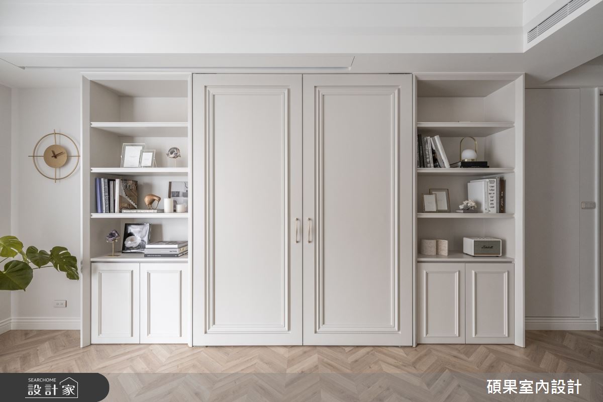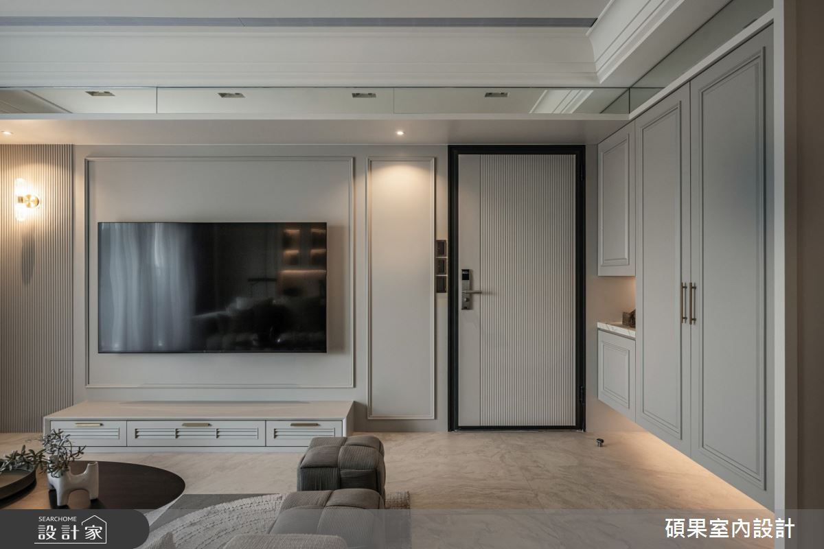 碩果室內設計以油漆、乳膠漆、壁紙、系統板材、木百葉、線板、噴漆、陶板的搭配應用,呈現美式風居家氛圍,將此間40坪、三房、單層、新成屋(5年以下)打造成舒適愜意的家庭空間,完成2位大人全家人的夢想之居。