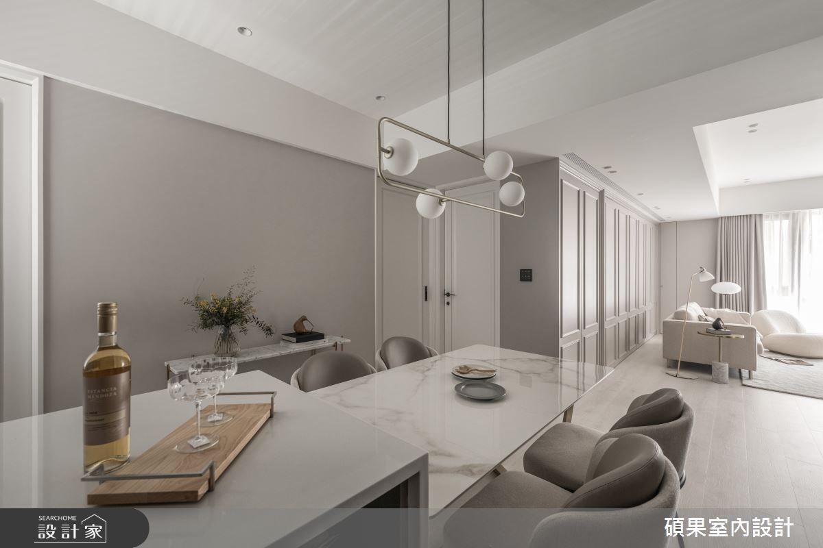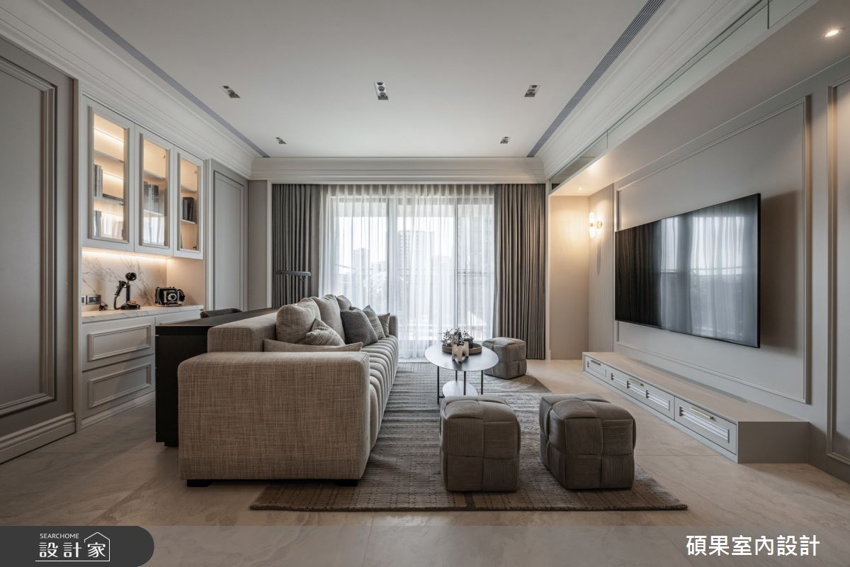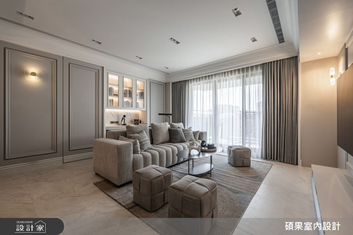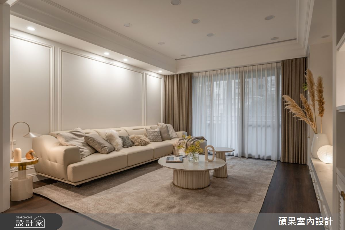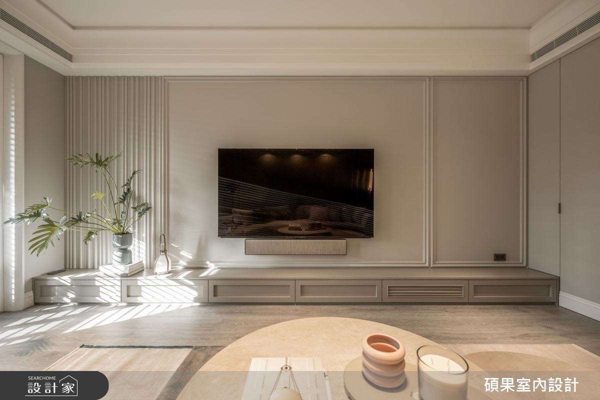 碩果室內設計以油漆、乳膠漆、壁紙、系統板材、木百葉、線板、噴漆、陶板的搭配應用,呈現美式風居家氛圍,將此間40坪、三房、單層、新成屋(5年以下)打造成舒適愜意的家庭空間,完成2位大人全家人的夢想之居。