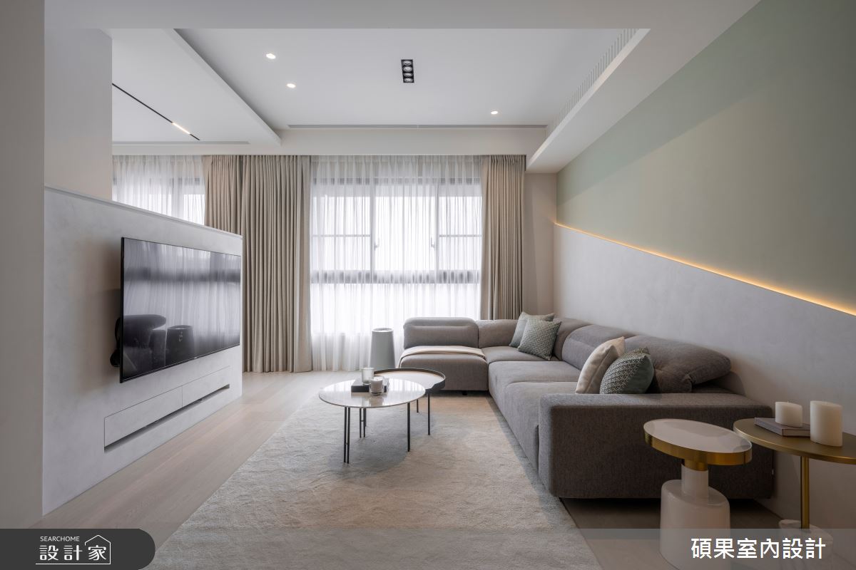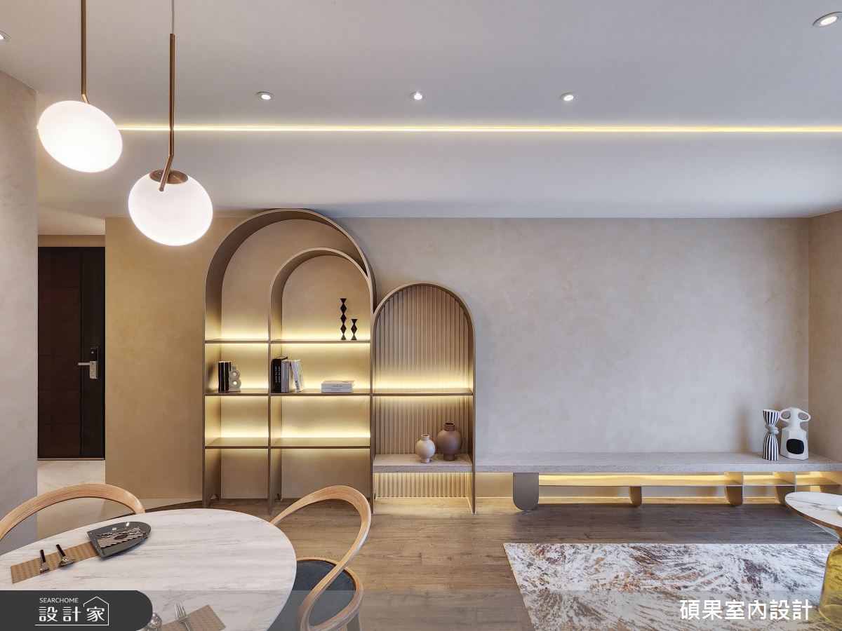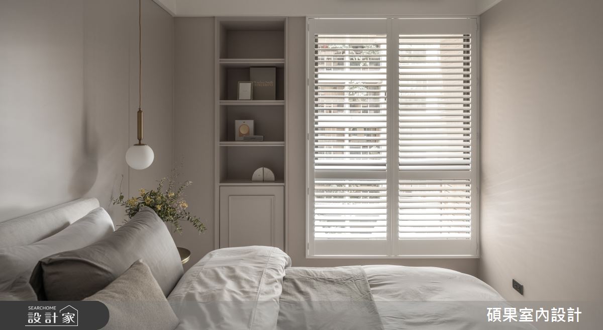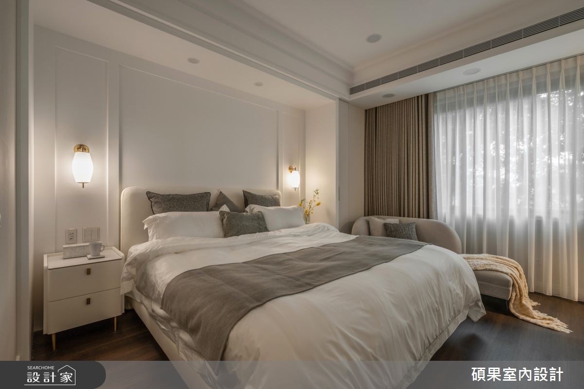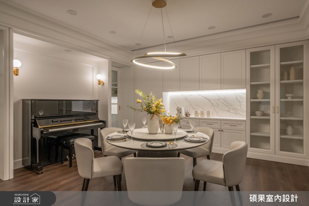 碩果室內設計以油漆、乳膠漆、壁紙、系統板材、木百葉、線板、噴漆、陶板的搭配應用,呈現美式風居家氛圍,將此間40坪、三房、單層、新成屋(5年以下)打造成舒適愜意的家庭空間,完成2位大人全家人的夢想之居。