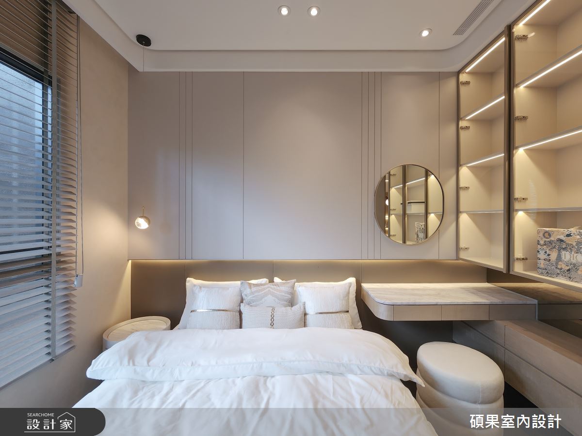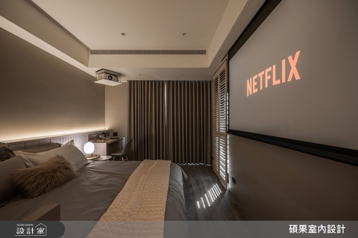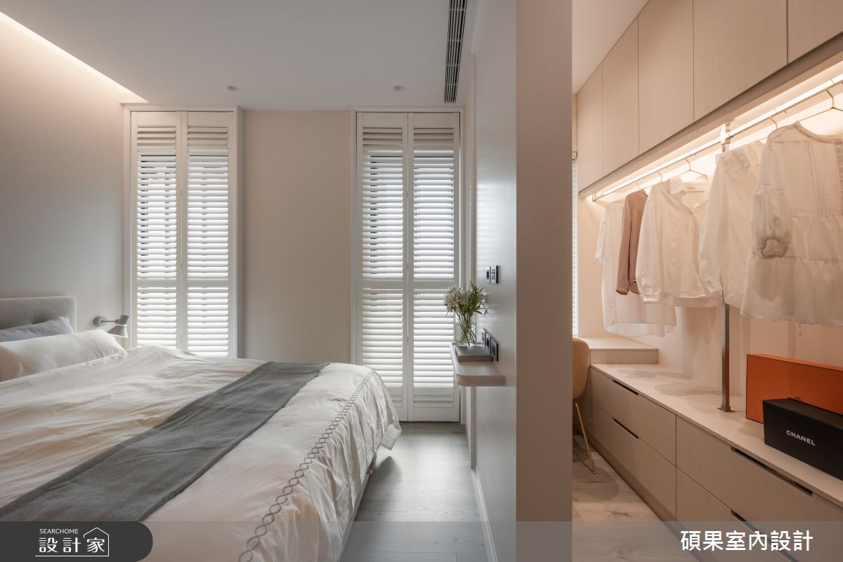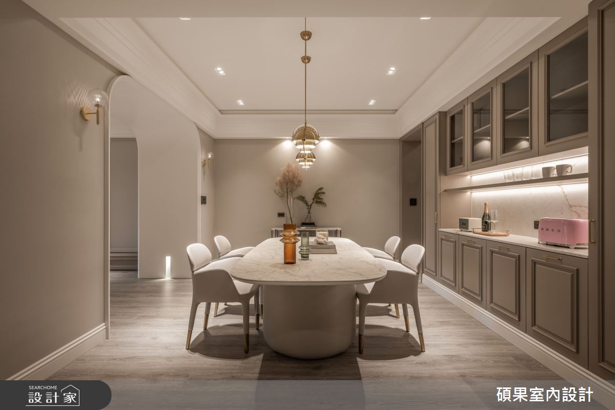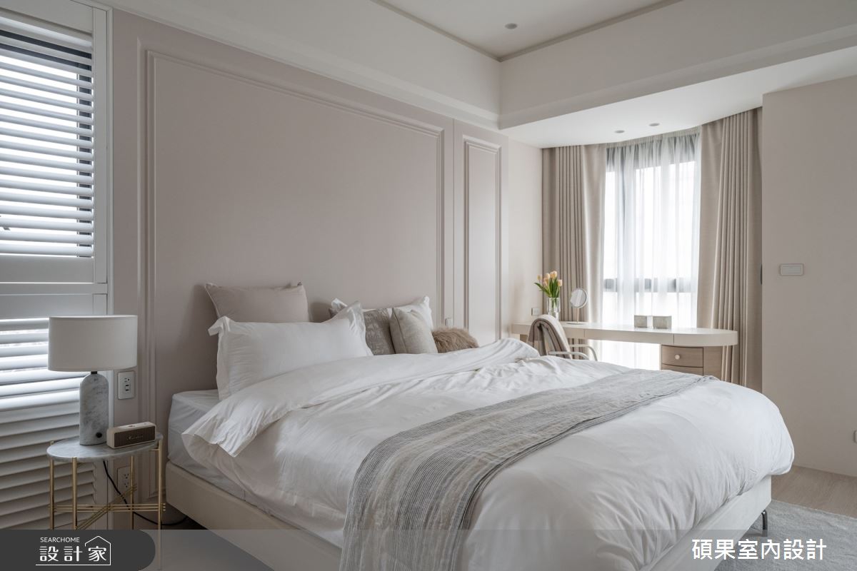 碩果室內設計以油漆、乳膠漆、壁紙、系統板材、木百葉、線板、噴漆、陶板的搭配應用,呈現美式風居家氛圍,將此間40坪、三房、單層、新成屋(5年以下)打造成舒適愜意的家庭空間,完成2位大人全家人的夢想之居。