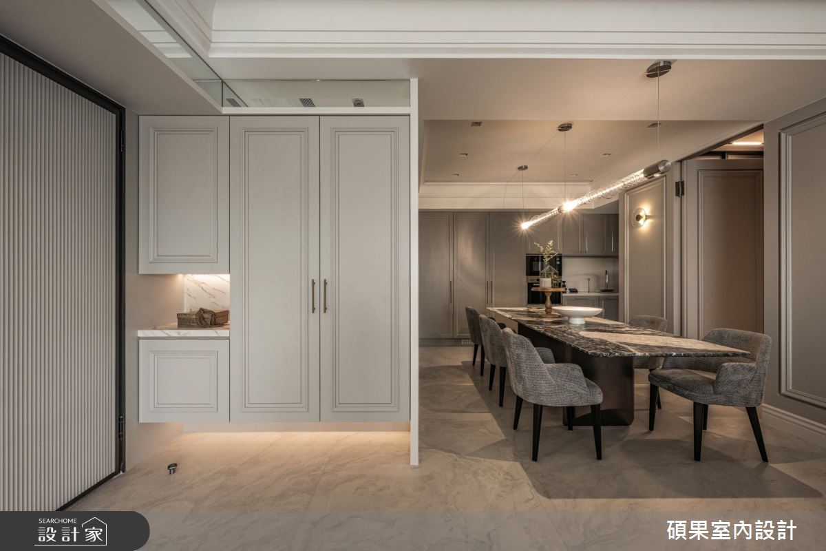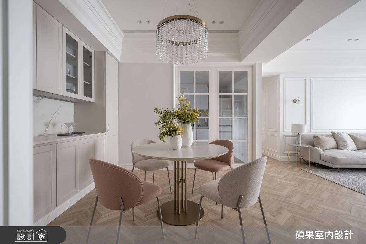 由碩果室內設計精心規劃的44坪三房住宅空間,家庭成員一共有2位大人。因應屋主需求,設計師運用美式風作為主軸,搭配超耐磨木地板、系統板材、磁磚、線板、噴漆、無毒水性噴漆,打造全家人的夢想家居。
