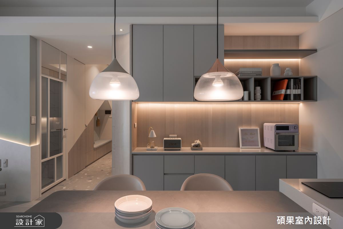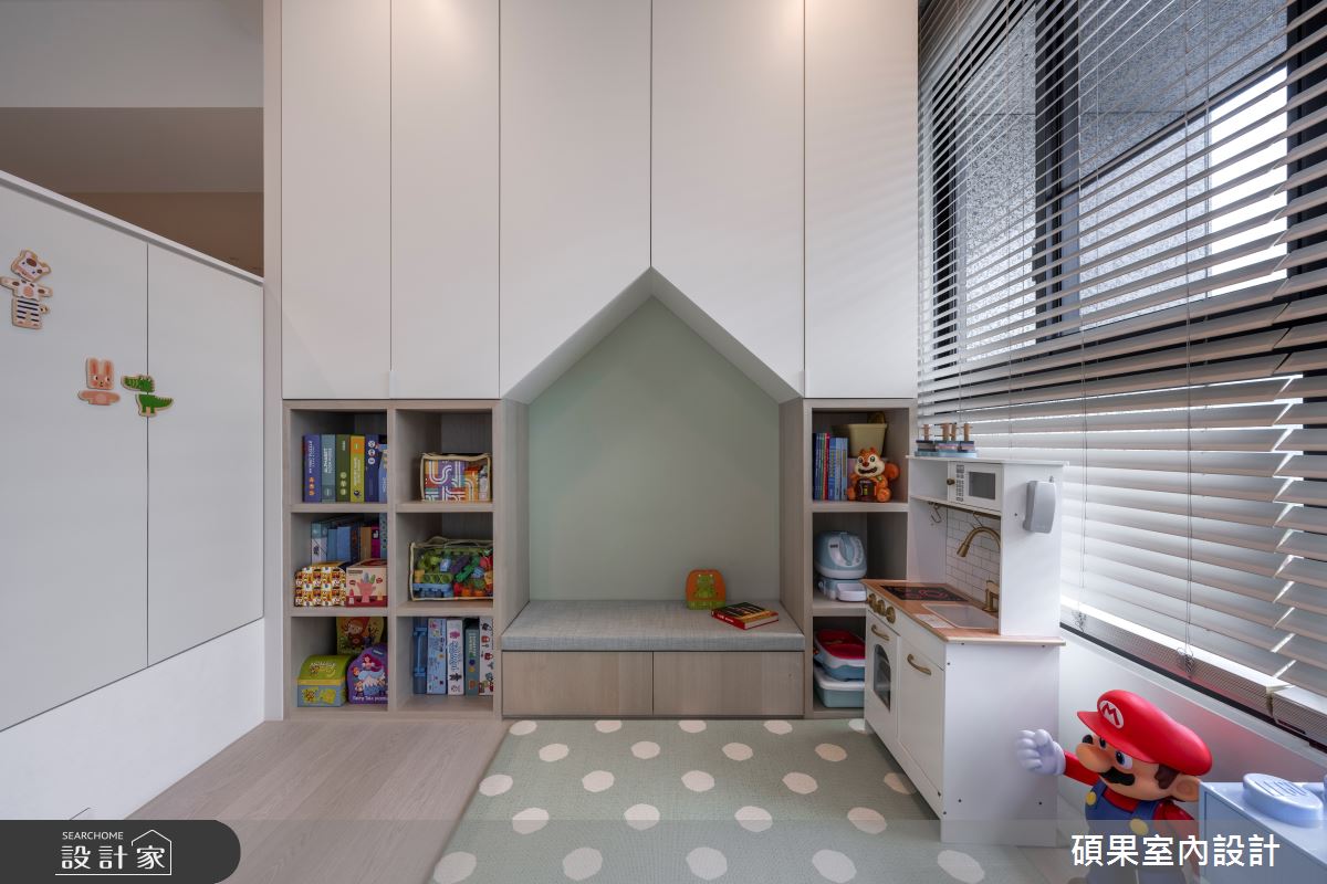 來自碩果室內設計的34坪北歐風住宅案,屋主一家人共有2位大人、2位小孩,是一間單層新成屋(5年以下)的四房格局,設計師藉由建材以花磚、超耐磨木地板、石英磚/拋光石英磚、木作貼皮、系統板材、木百葉、軌道燈、礦物塗料的搭配應用,實現一家人的理想生活。