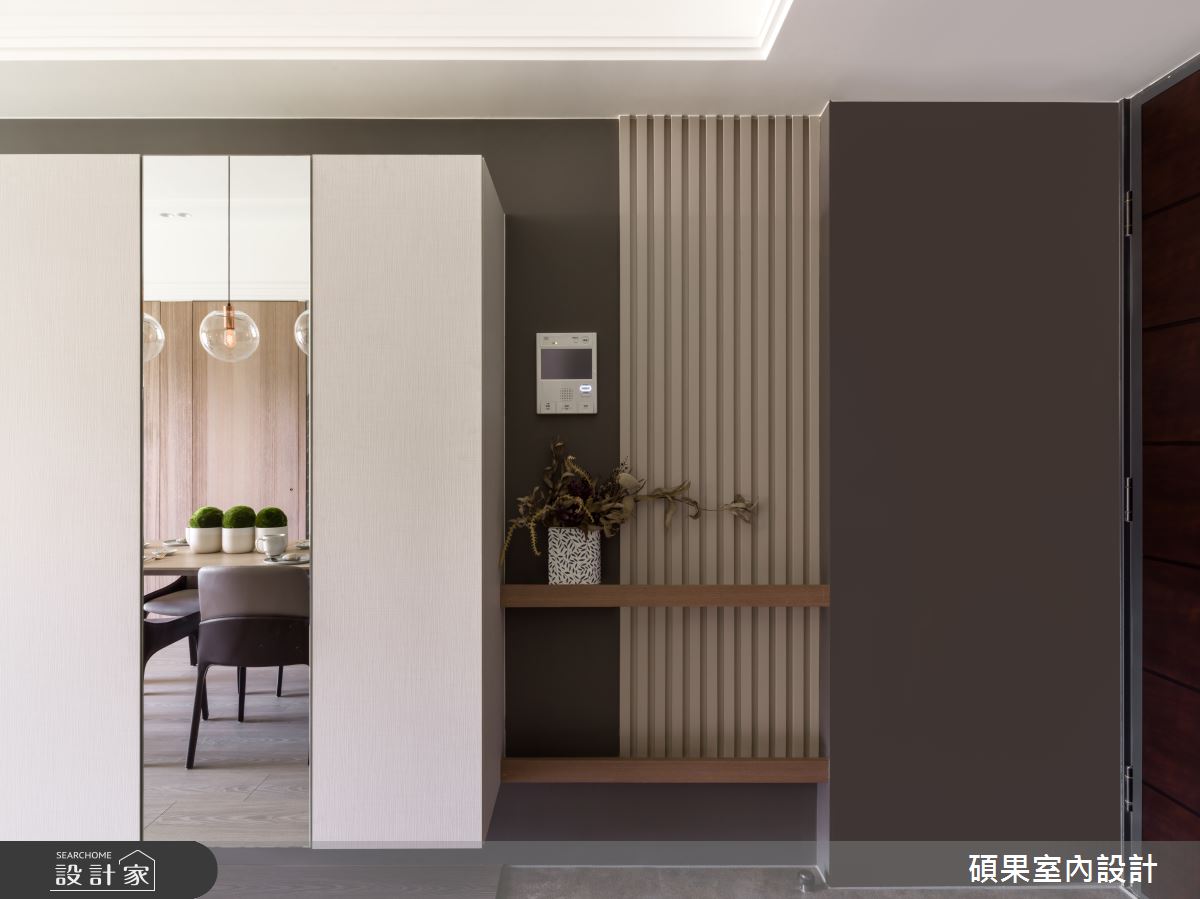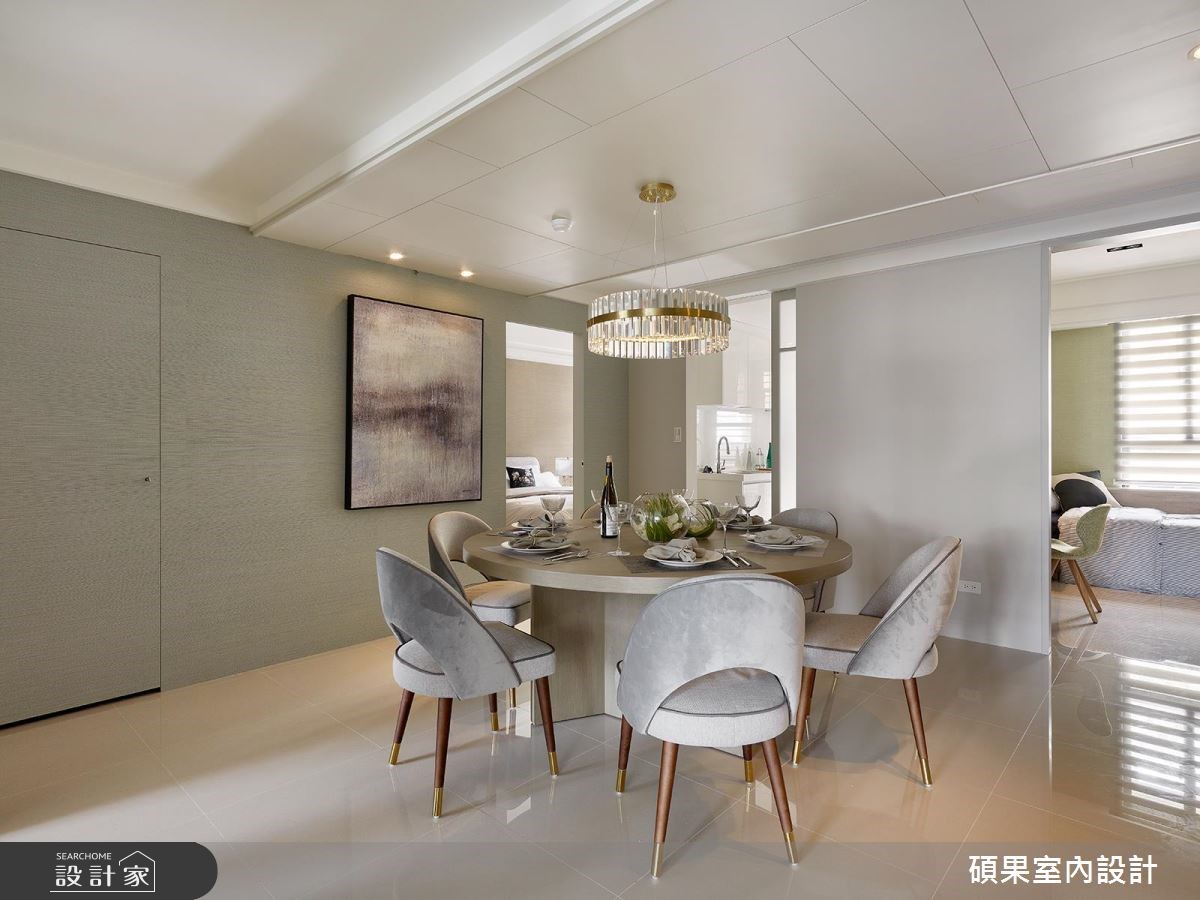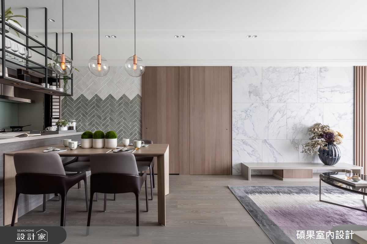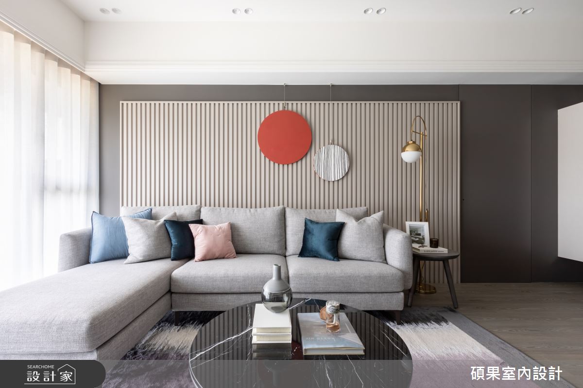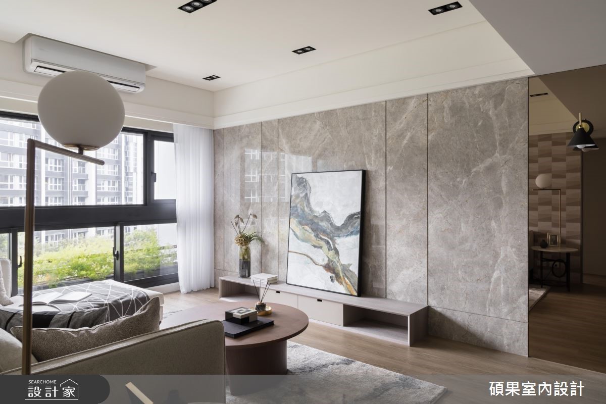 32 坪採光優秀的現代風住宅,以耐看有氣質大地色鋪陳空間,不僅為格局方正舒適的公領域視覺加分,適度的異材質相互搭配,傳遞出滿室的優雅氣氛。 公共空間格局方正且開放式手法,無限拉開視野幅度,客廳區以咖啡色階的色塊牆帶出設計主軸,L 型大沙發、香檳色大理石電視牆,依序透過色階的層次美學,創造簡約但不繁複的現代居家。餐廳空間木質櫃體、大地色門片,挹注用餐時光溫潤質感,並藉由金屬燈具呼應優雅氣質風格。私領域分別運用不同顏色寢具,帶出臥房主人個性,床頭結合櫃體賦予完整的收納機能。