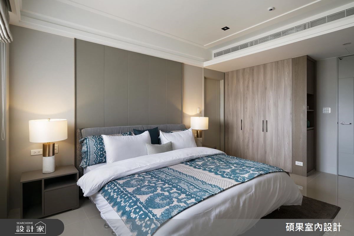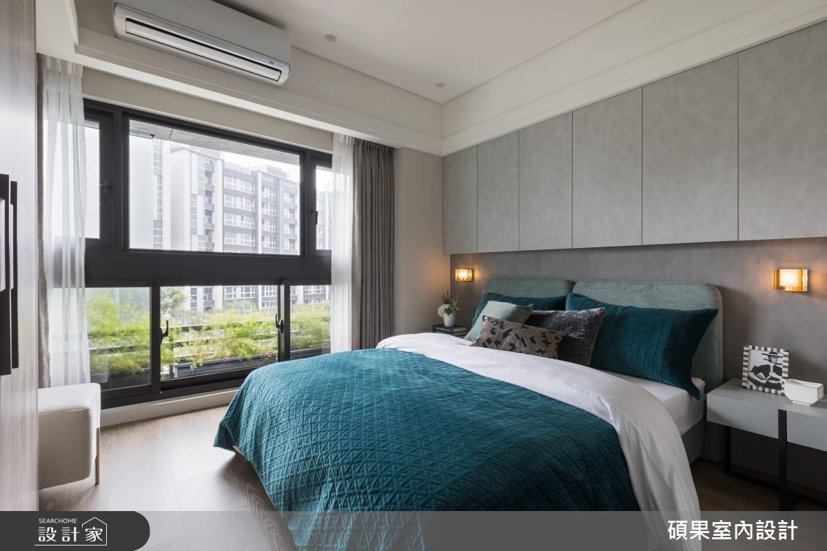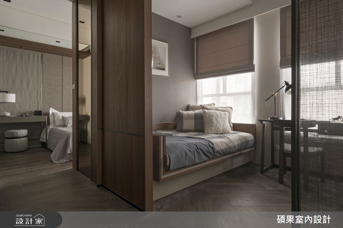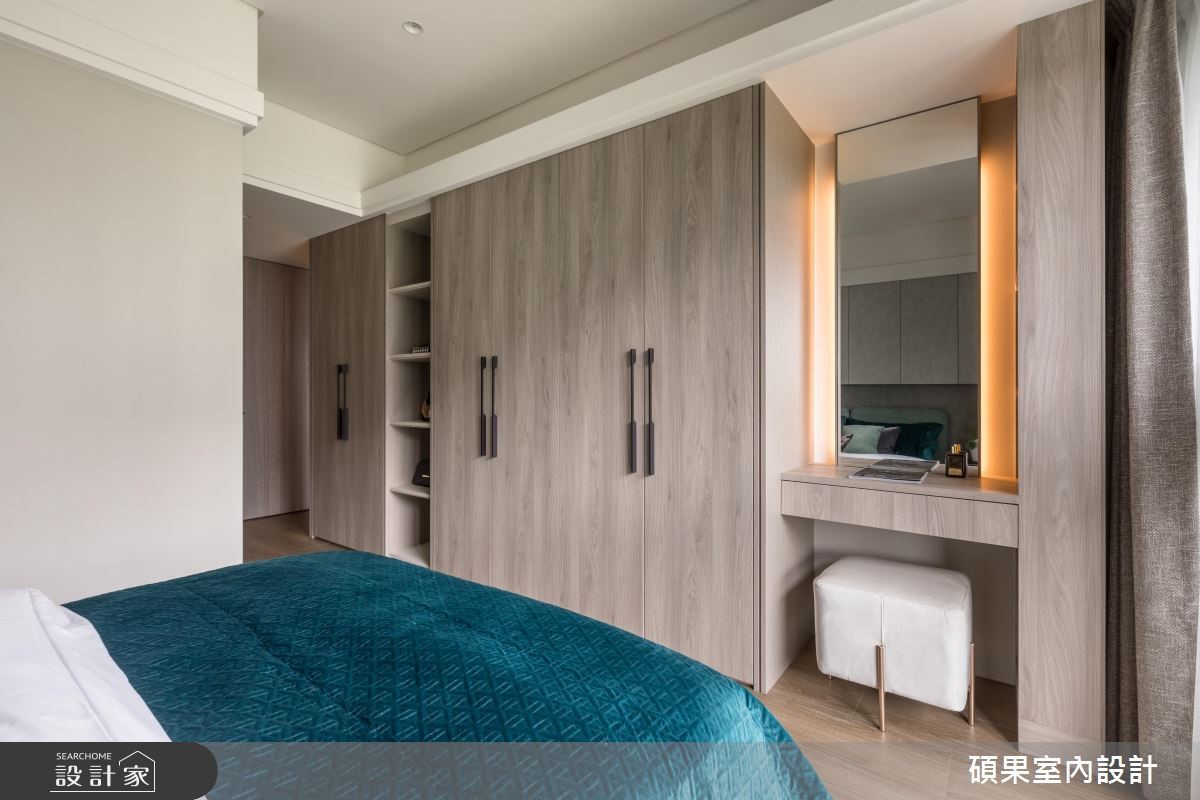 32 坪採光優秀的現代風住宅,以耐看有氣質大地色鋪陳空間,不僅為格局方正舒適的公領域視覺加分,適度的異材質相互搭配,傳遞出滿室的優雅氣氛。 公共空間格局方正且開放式手法,無限拉開視野幅度,客廳區以咖啡色階的色塊牆帶出設計主軸,L 型大沙發、香檳色大理石電視牆,依序透過色階的層次美學,創造簡約但不繁複的現代居家。餐廳空間木質櫃體、大地色門片,挹注用餐時光溫潤質感,並藉由金屬燈具呼應優雅氣質風格。私領域分別運用不同顏色寢具,帶出臥房主人個性,床頭結合櫃體賦予完整的收納機能。