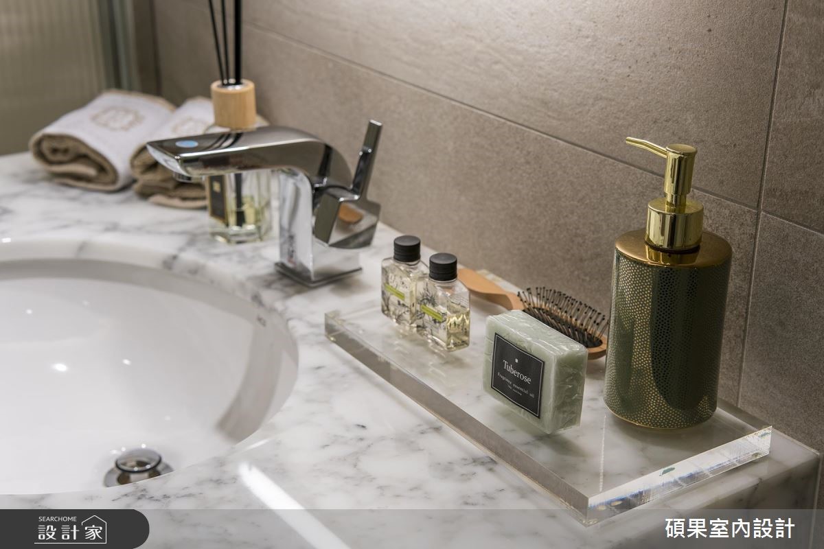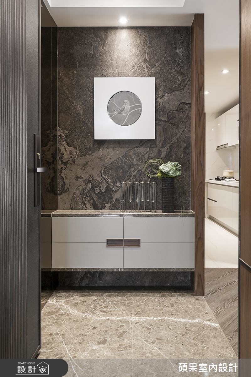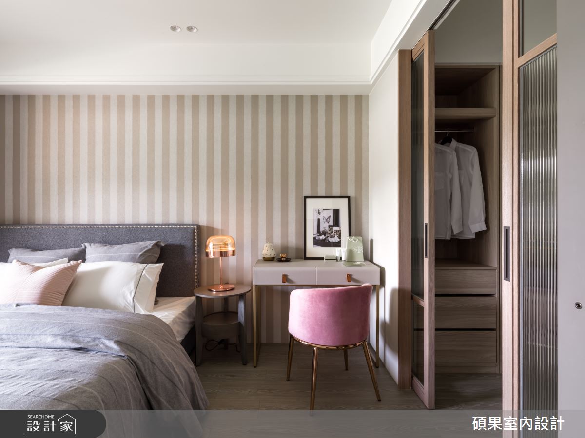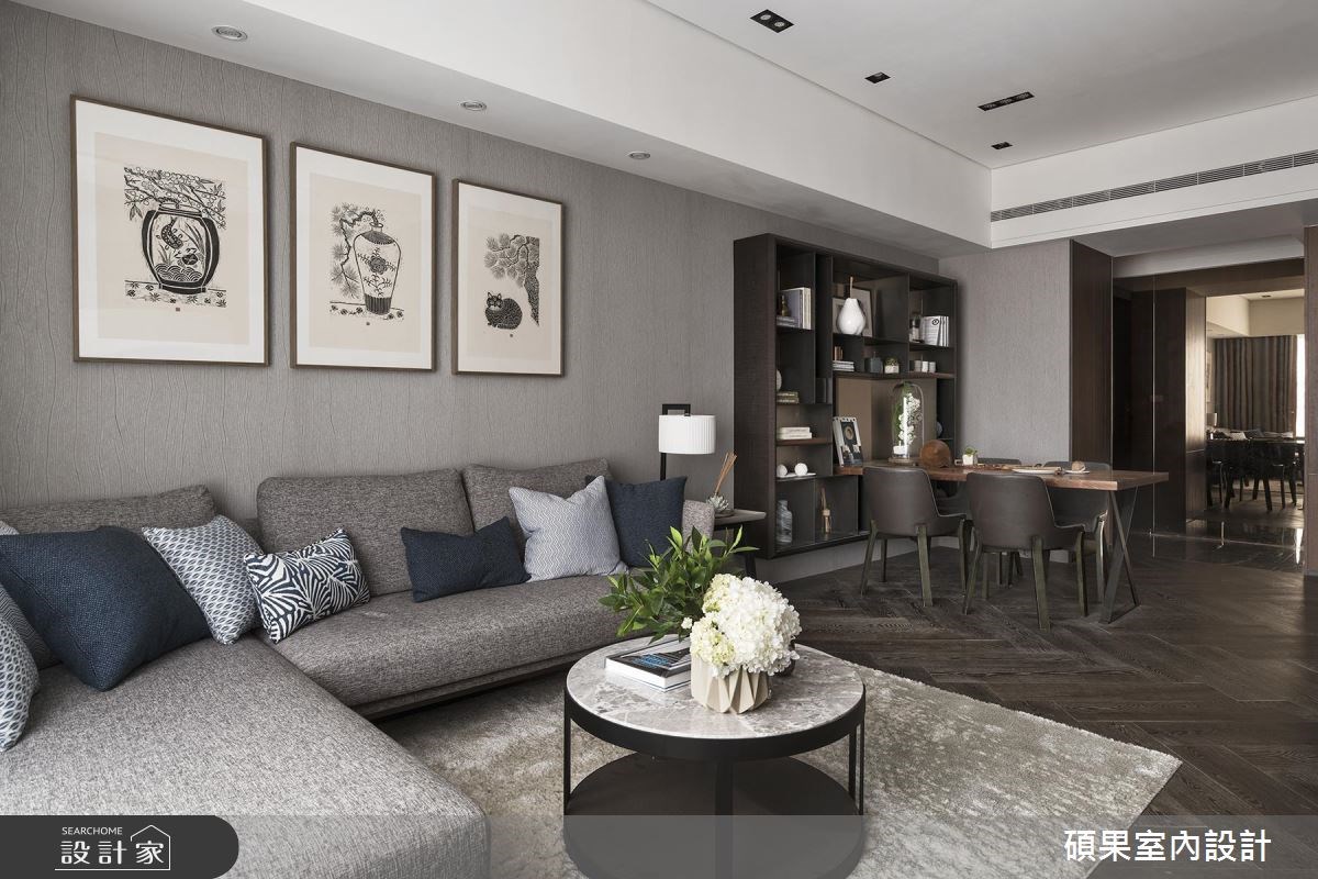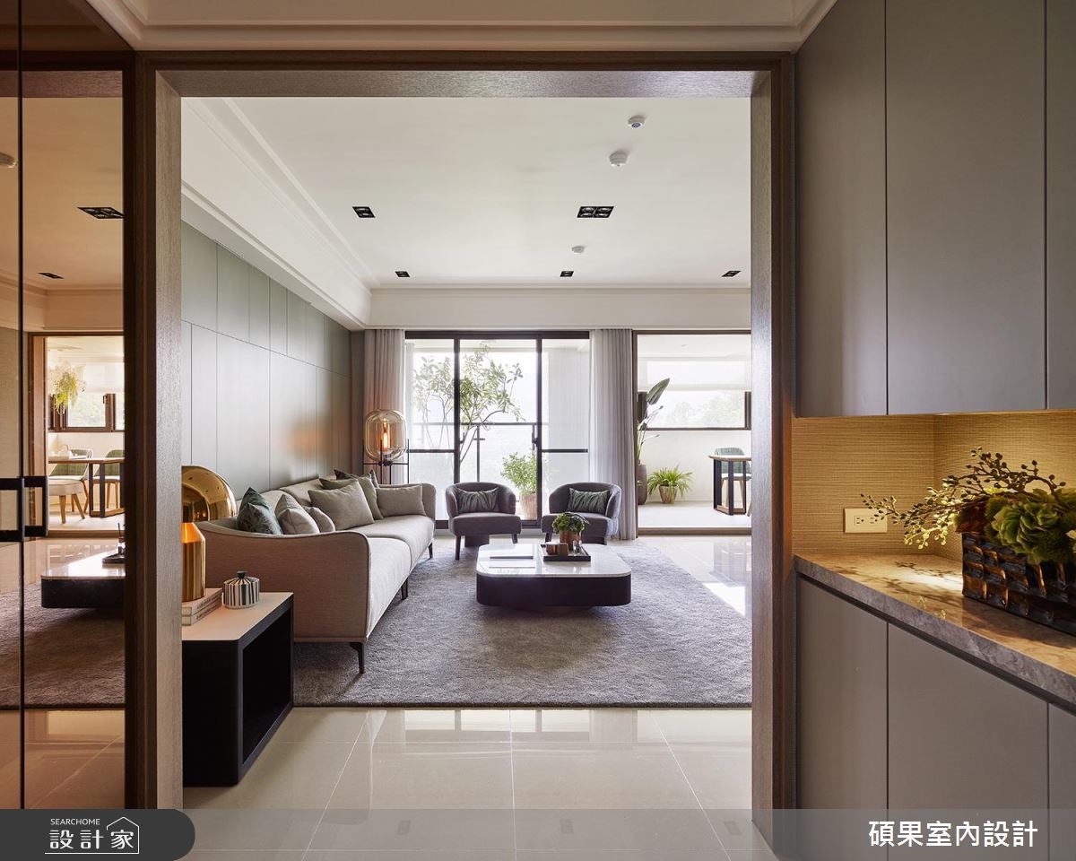 32 坪採光優秀的現代風住宅,以耐看有氣質大地色鋪陳空間,不僅為格局方正舒適的公領域視覺加分,適度的異材質相互搭配,傳遞出滿室的優雅氣氛。 公共空間格局方正且開放式手法,無限拉開視野幅度,客廳區以咖啡色階的色塊牆帶出設計主軸,L 型大沙發、香檳色大理石電視牆,依序透過色階的層次美學,創造簡約但不繁複的現代居家。餐廳空間木質櫃體、大地色門片,挹注用餐時光溫潤質感,並藉由金屬燈具呼應優雅氣質風格。私領域分別運用不同顏色寢具,帶出臥房主人個性,床頭結合櫃體賦予完整的收納機能。