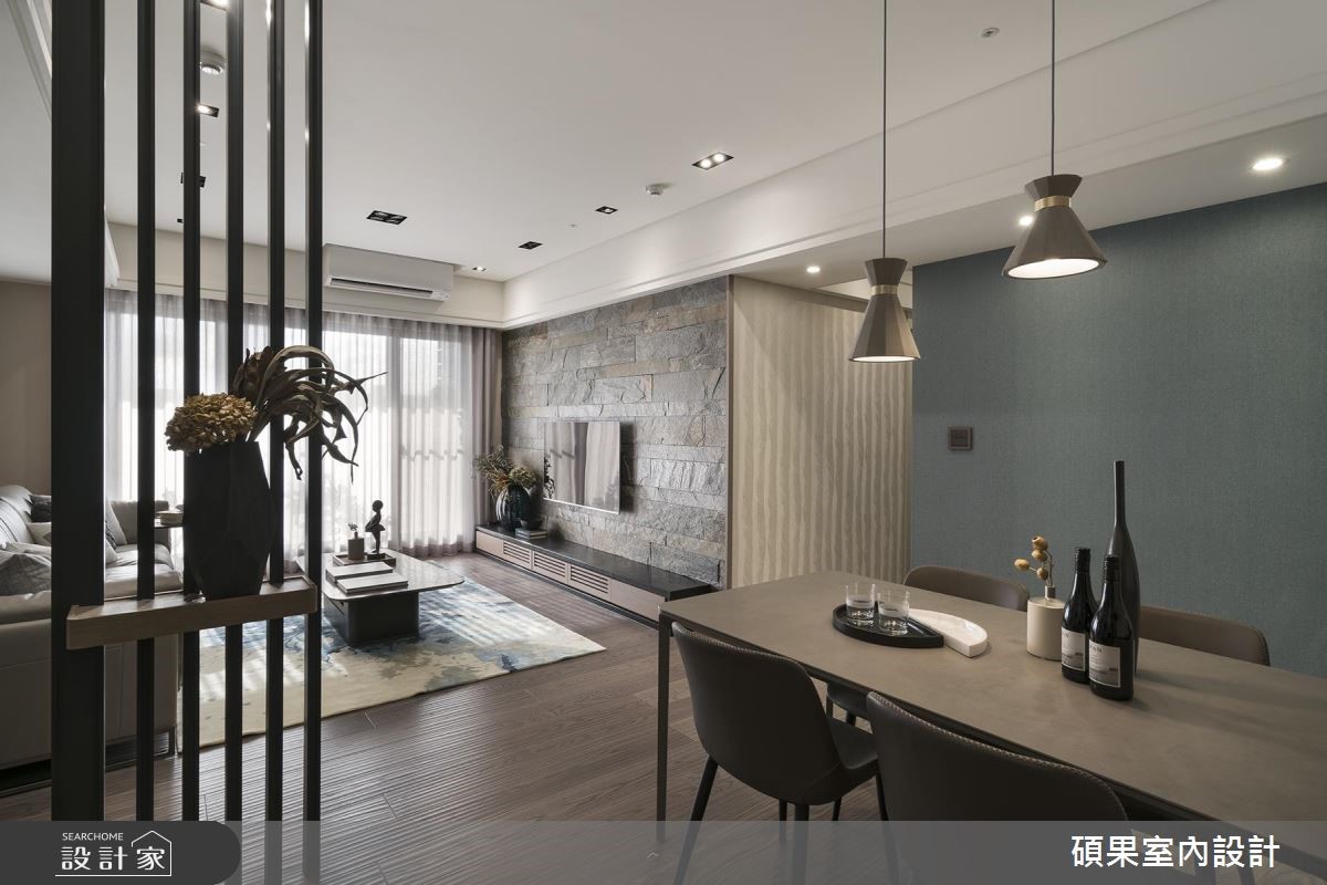 40坪現代風住宅,以木質及大地色牆面,營造沉著穩重生活氣氛,並透過簡單的材質轉換,創造簡約空間的層次美感。 開放的公領域地帶,以格柵屏風化解風水一眼穿底疑慮;長形格局藉由大面落地窗的安排,引入良好光線,即使空間底部的餐廳區,也擁有美好光影;立面收納櫃、沙發背牆、沙發色系,皆選擇相似的大地杏色,營造溫潤而有質感的氣氛,餐廳及客廳則利用,一抹灰綠牆面及文化石電視牆,型塑各領域特色及圍塑獨立空間感。主臥床頭牆選擇進口壁紙,與公領域大地色氣質相呼應,且規劃出完整的私領域動線,讓衛浴廊道變身更衣空間,妥善發揮各區塊機能,滿足兩人共享生活機能。