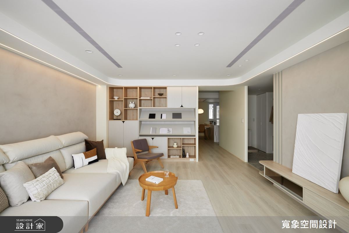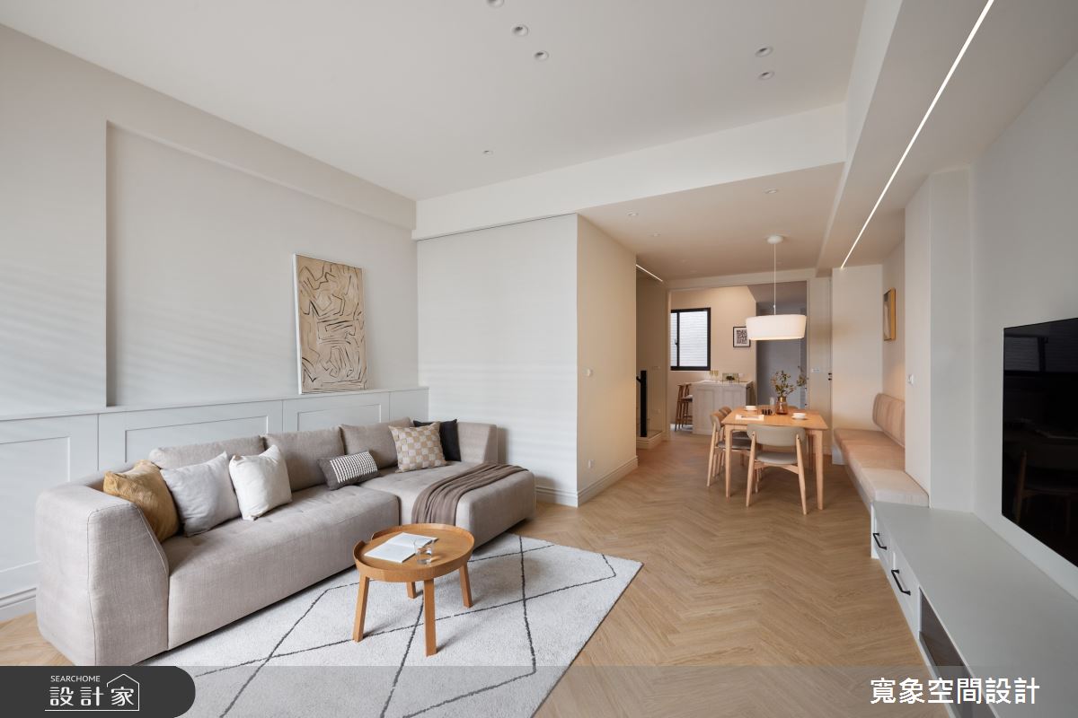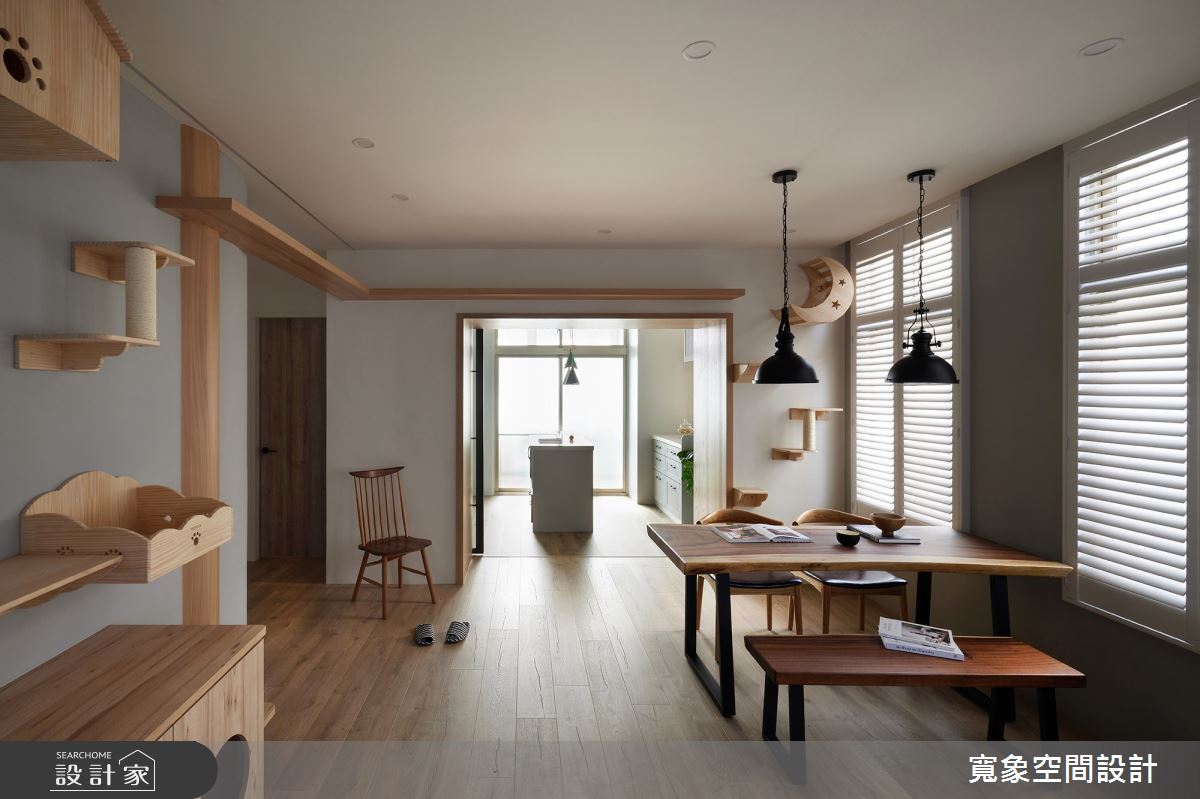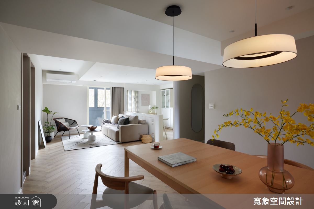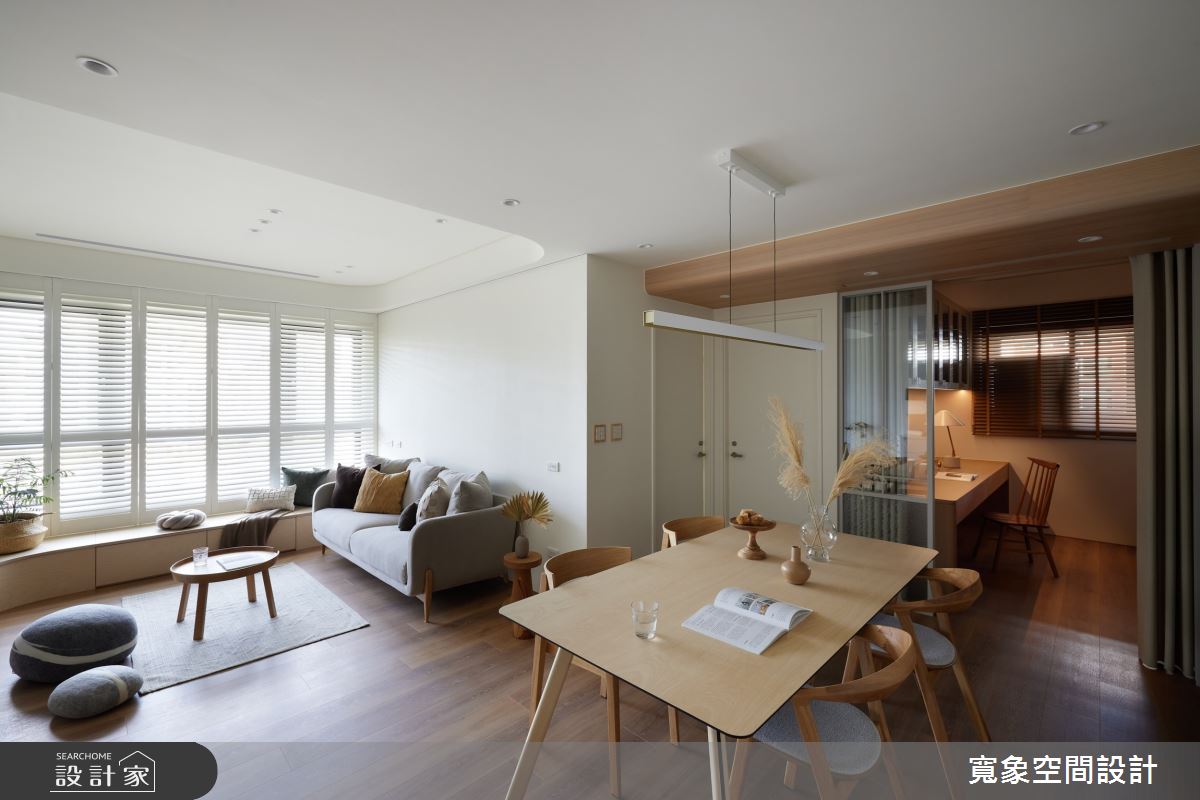 寬象空間設計以油漆、乳膠漆、超耐磨木地板、木地板、木紋磚、鐵件、烤玻、木作貼皮、烤漆、系統板材、磁磚、木百葉、繃布的搭配應用,呈現日式北歐風居家氛圍,將此間28坪、三房、單層、新成屋(5年以下)打造成舒適愜意的家庭空間,完成2位大人、1位小孩全家人的夢想之居。