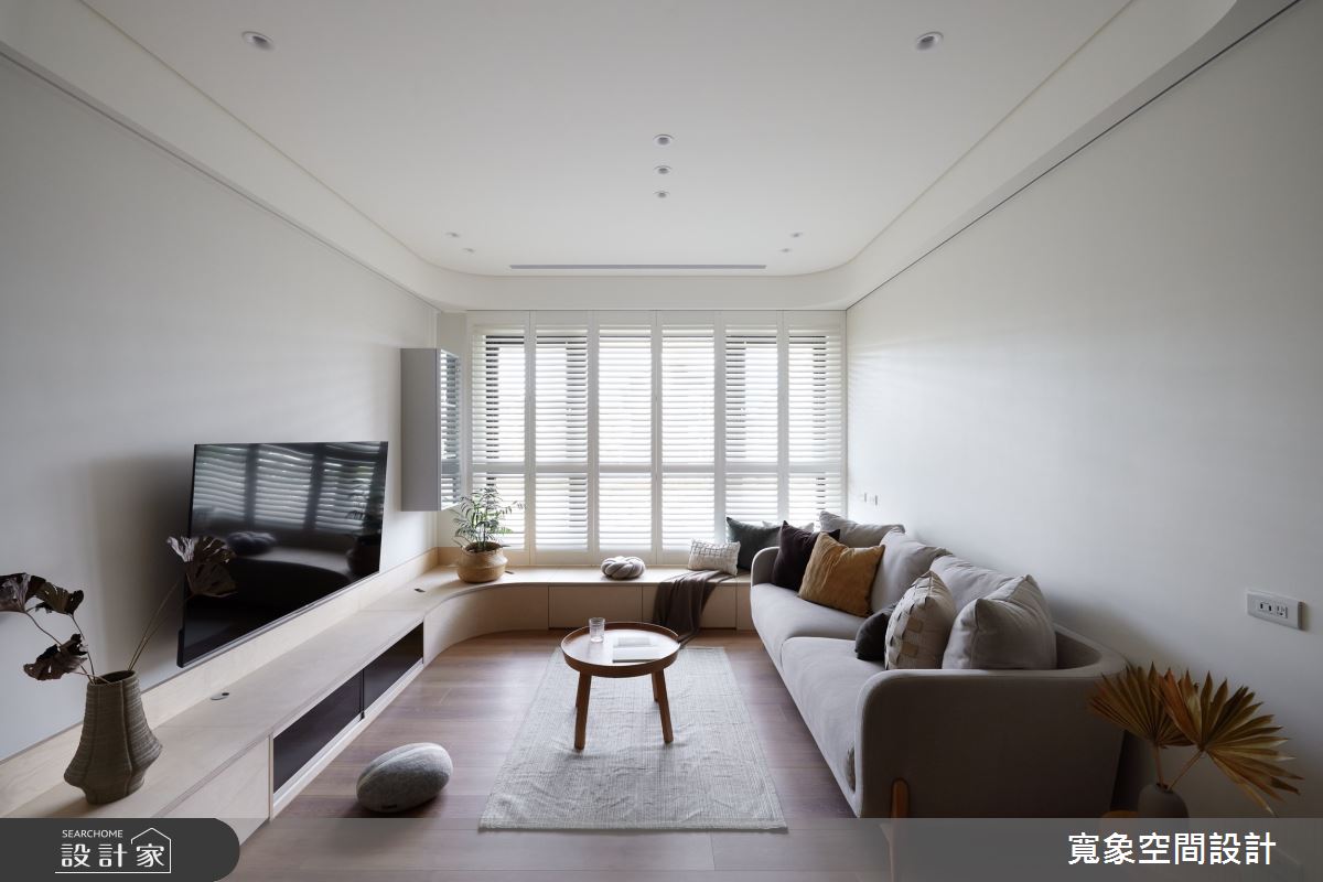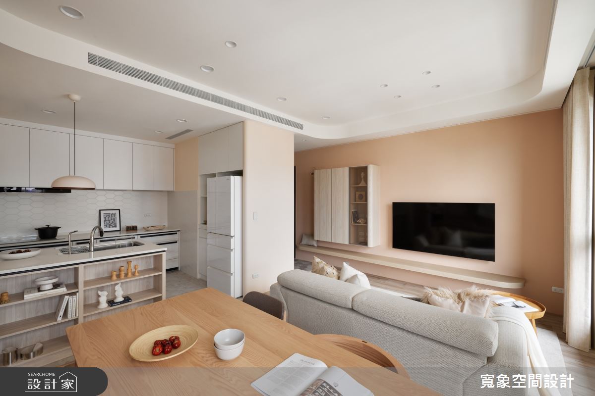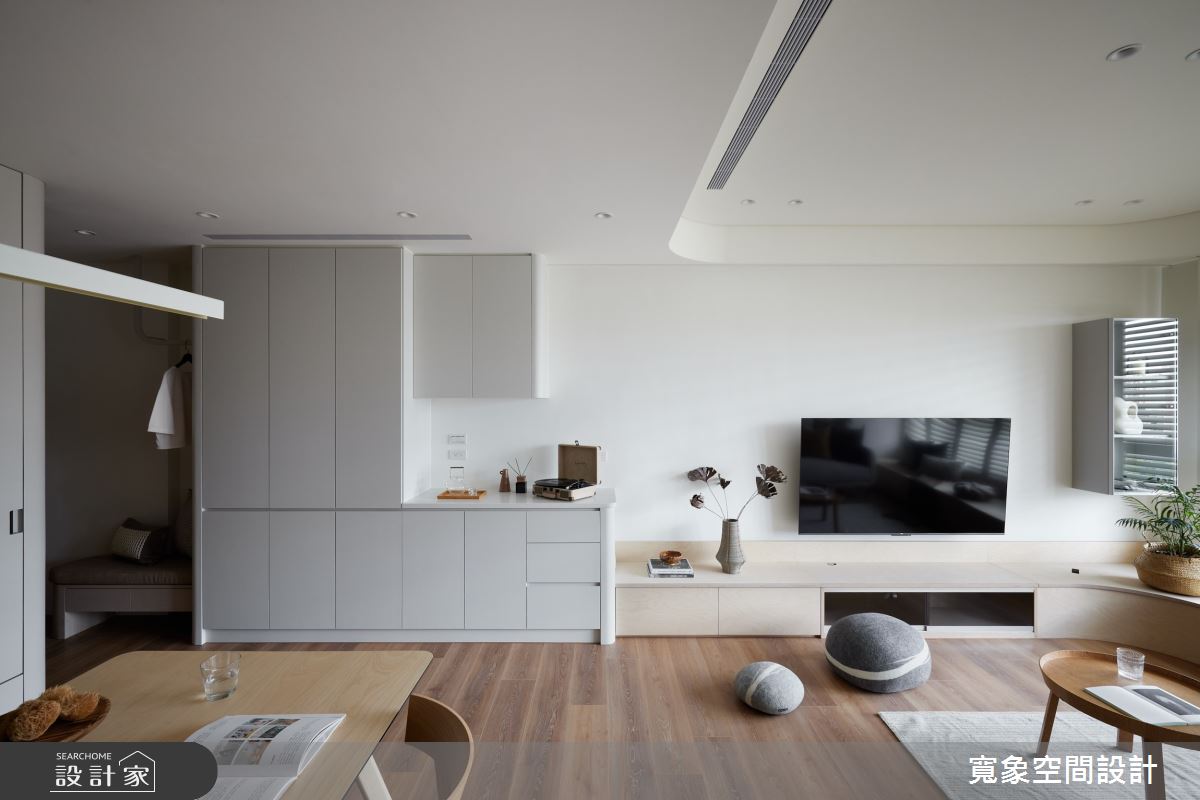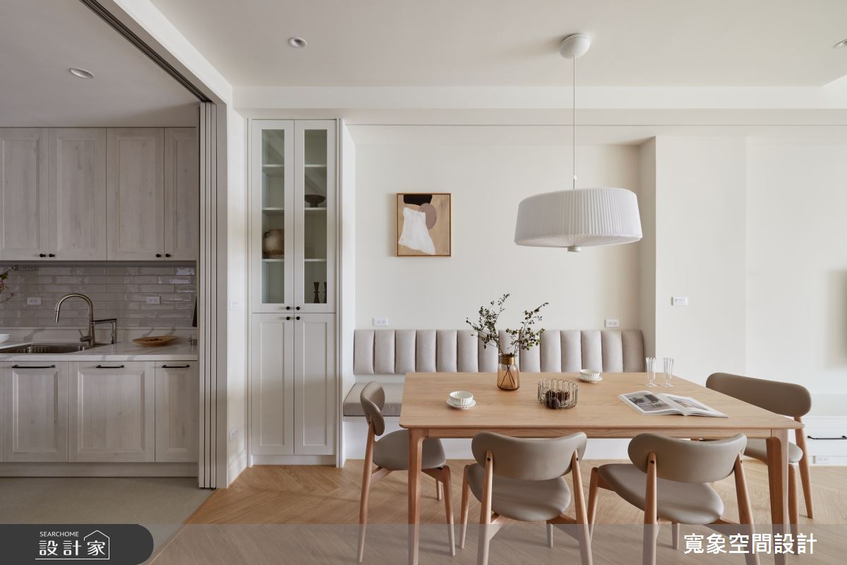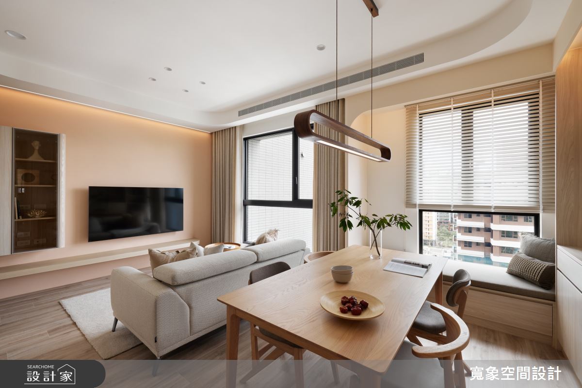 寬象空間設計以油漆、乳膠漆、超耐磨木地板、木地板、木紋磚、鐵件、烤玻、木作貼皮、烤漆、系統板材、磁磚、木百葉、繃布的搭配應用,呈現日式北歐風居家氛圍,將此間28坪、三房、單層、新成屋(5年以下)打造成舒適愜意的家庭空間,完成2位大人、1位小孩全家人的夢想之居。
