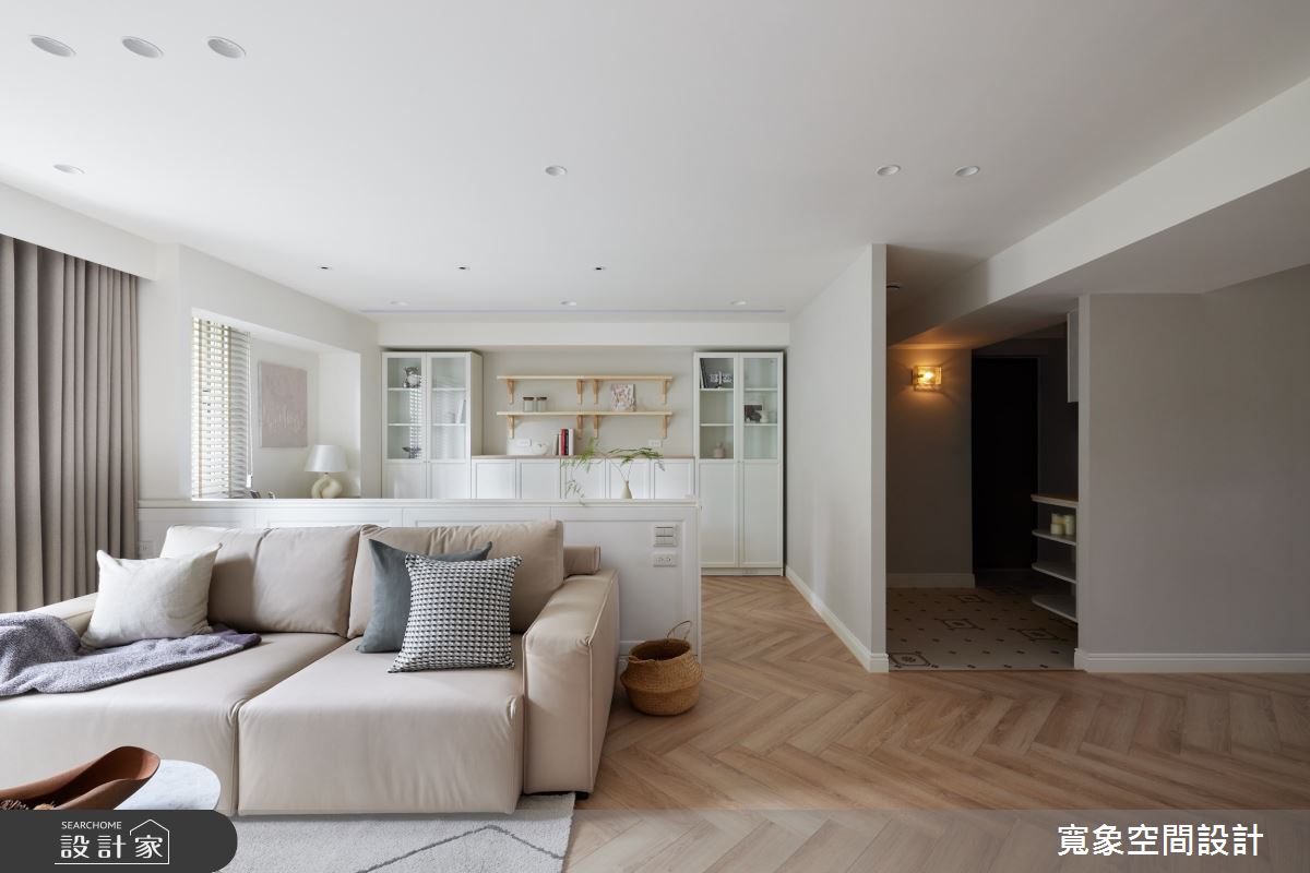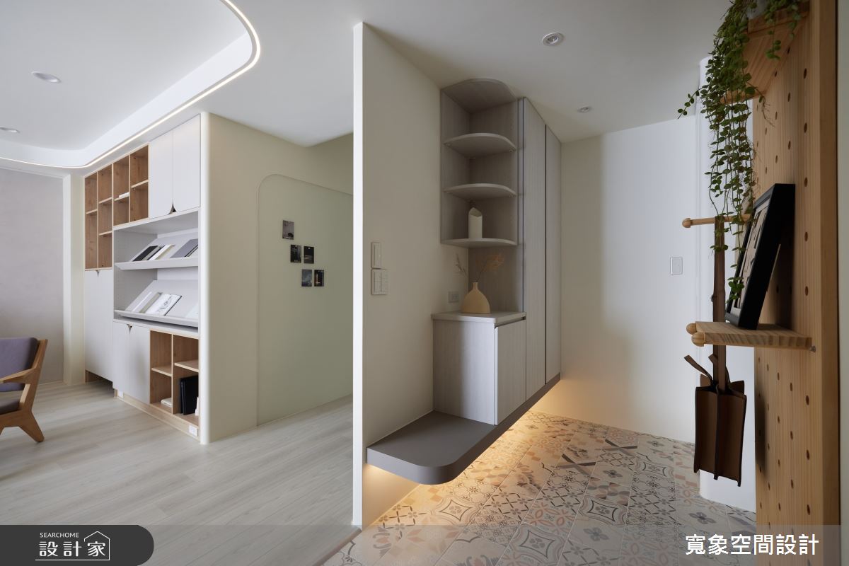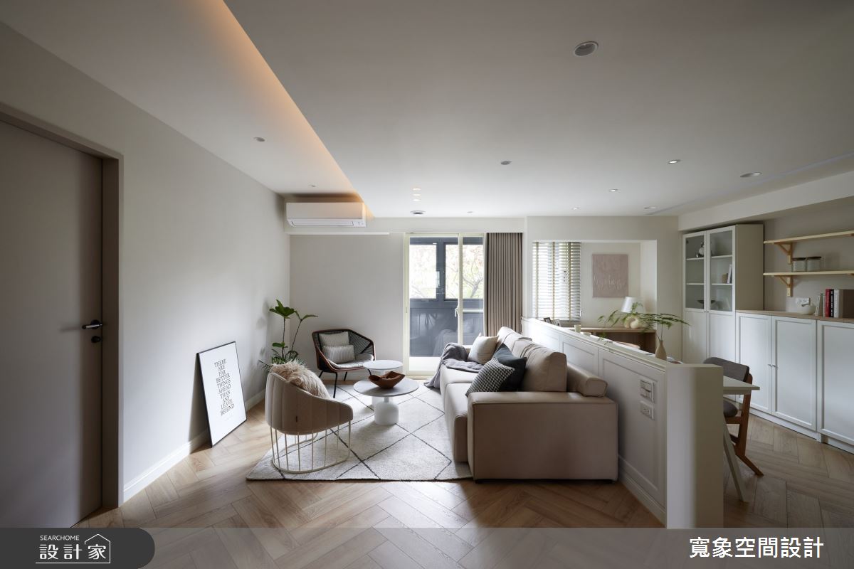 寬象空間設計以油漆、乳膠漆、六角磚/蜂巢磚、花磚、超耐磨木地板、鐵件、灰鏡、茶玻、烤玻、木作貼皮、系統板材、磁磚、木百葉、噴漆的搭配應用,呈現現代侘寂風居家氛圍,將此間22坪、三房、單層、新成屋(5年以下)打造成舒適愜意的家庭空間,完成2位大人、1位小孩全家人的夢想之居。