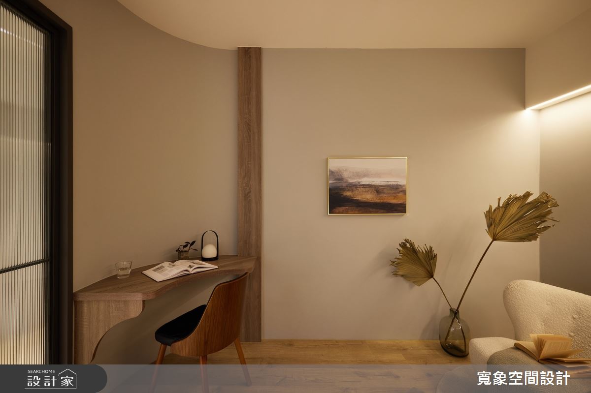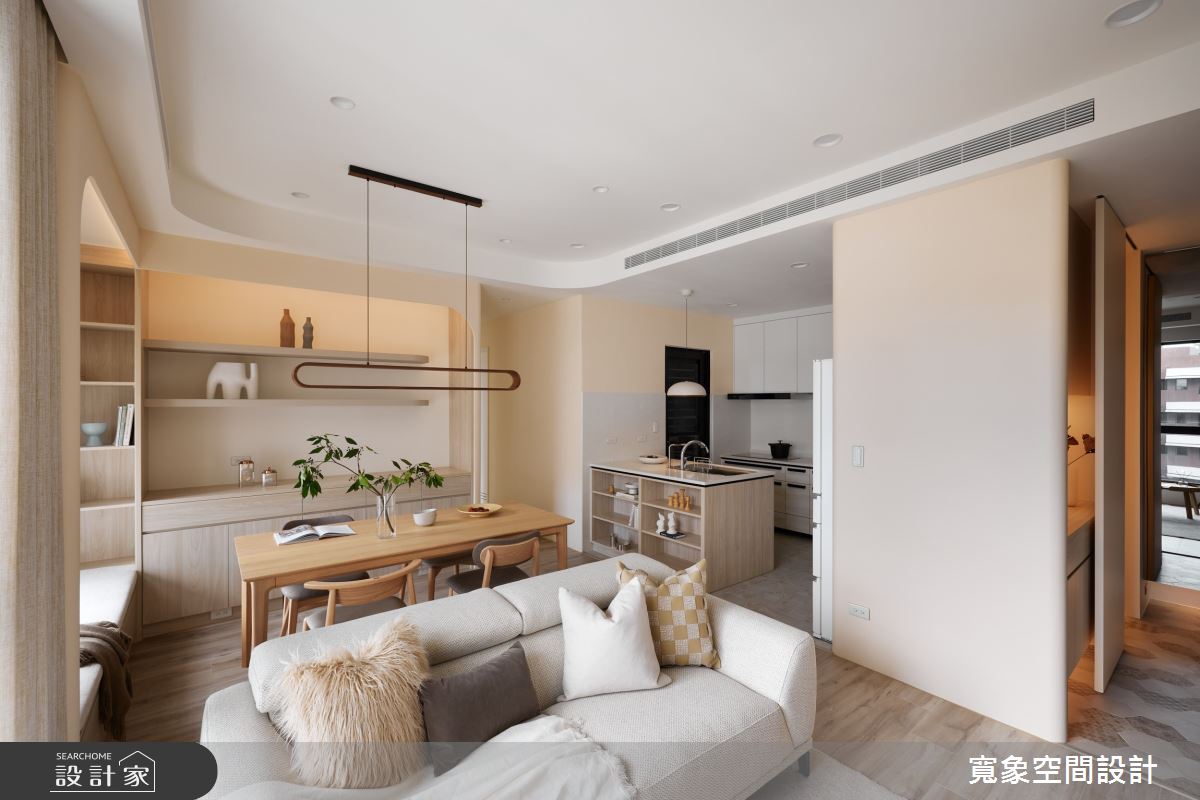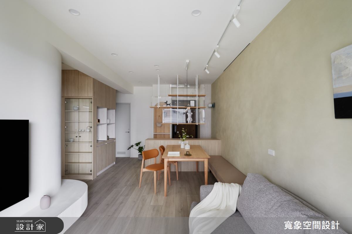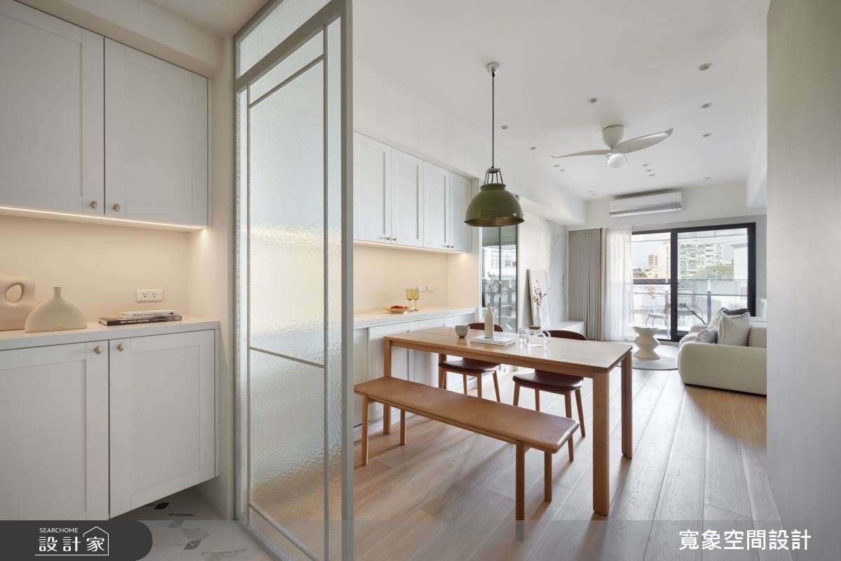 寬象空間設計以油漆、乳膠漆、六角磚/蜂巢磚、花磚、超耐磨木地板、鐵件、灰鏡、茶玻、烤玻、木作貼皮、系統板材、磁磚、木百葉、噴漆的搭配應用,呈現現代侘寂風居家氛圍,將此間22坪、三房、單層、新成屋(5年以下)打造成舒適愜意的家庭空間,完成2位大人、1位小孩全家人的夢想之居。