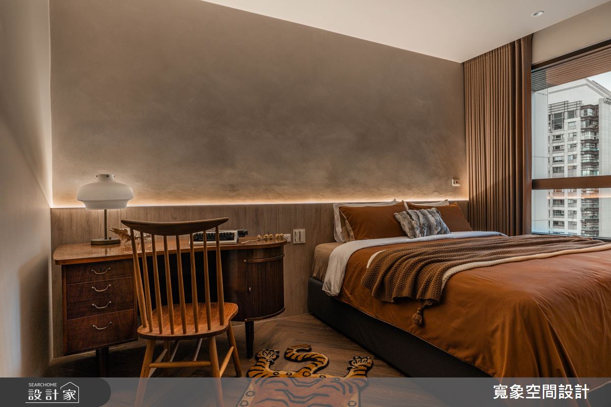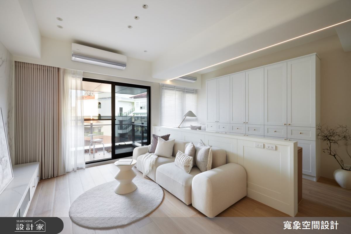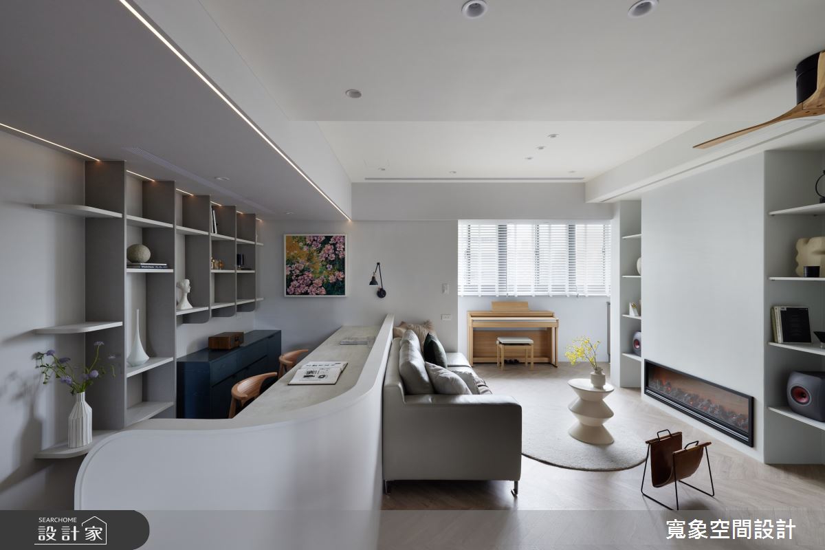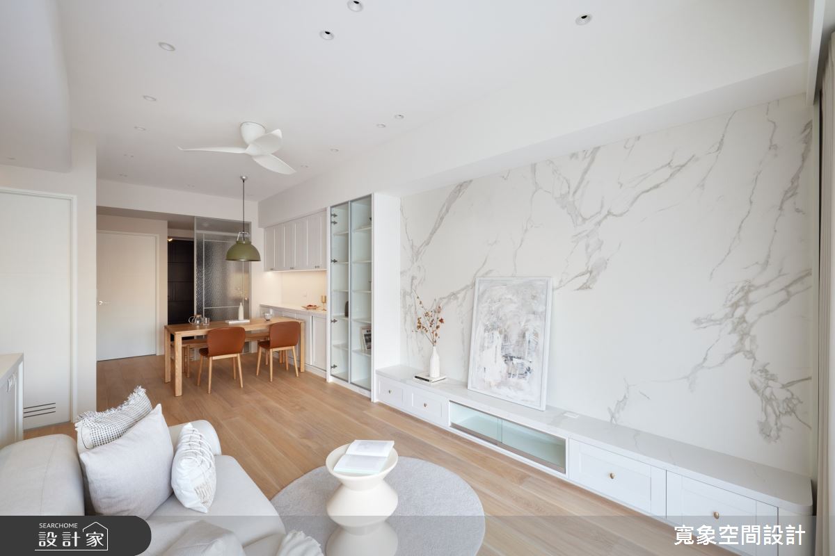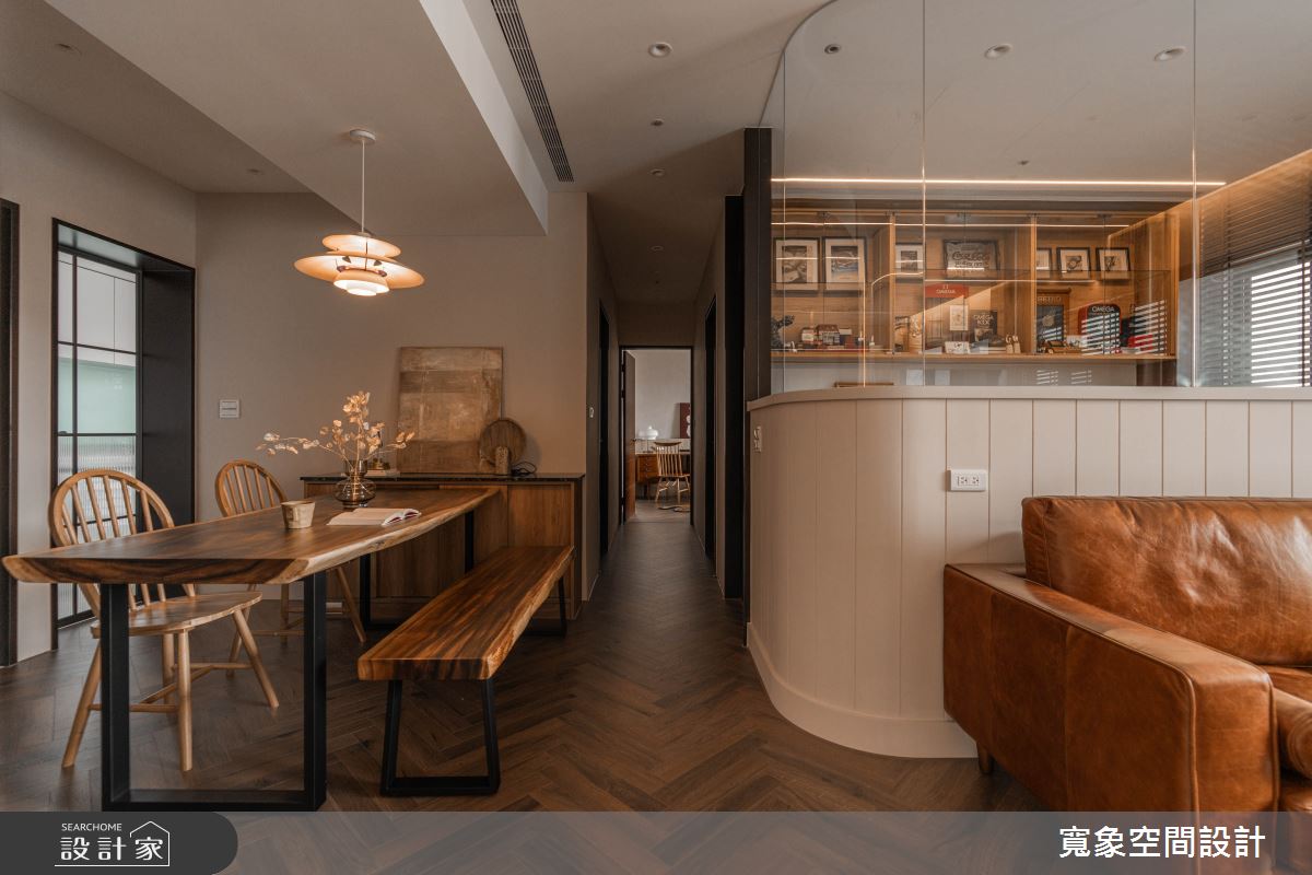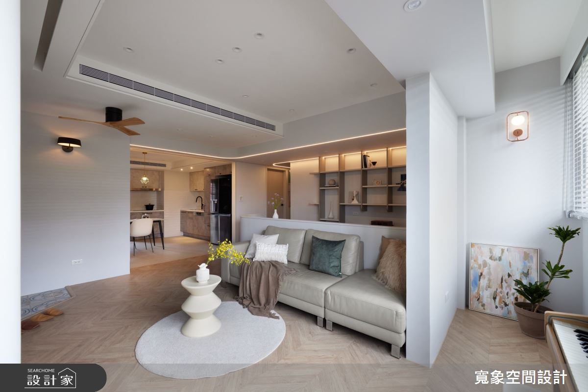 寬象空間設計以乳膠漆、超耐磨木地板、系統板材、大理石、磁磚、木百葉、石材、特殊塗料的搭配應用,呈現摩登復古風居家氛圍,將此間26.5坪、三房、單層、新成屋(5年以下)打造成舒適愜意的家庭空間,完成2位大人全家人的夢想之居。