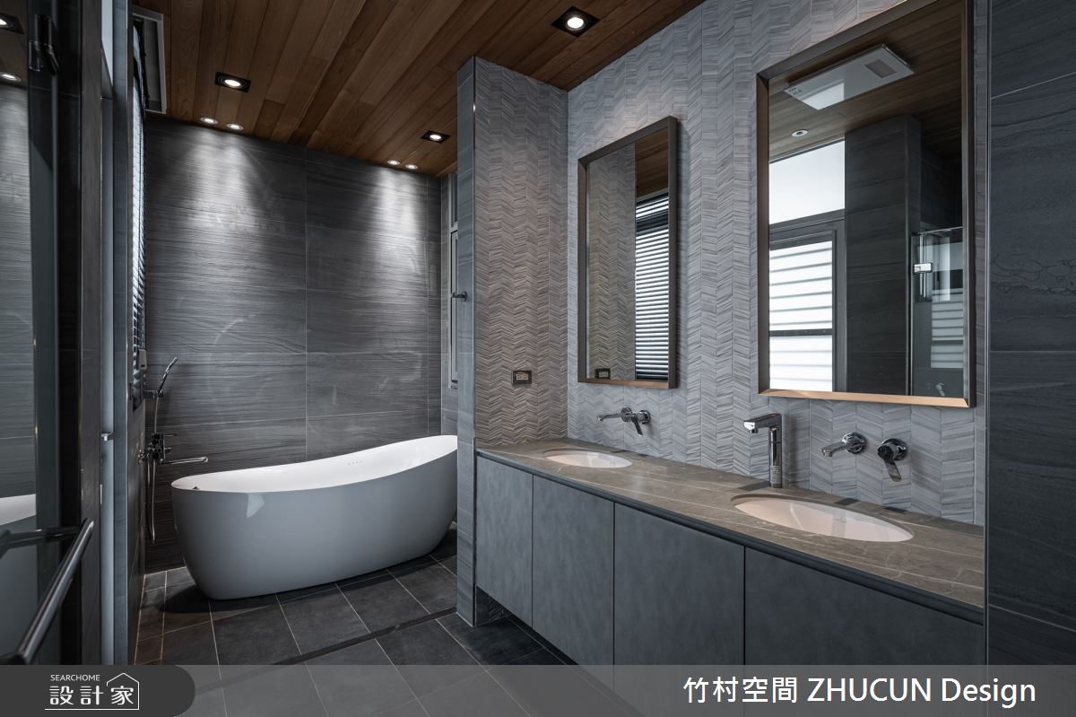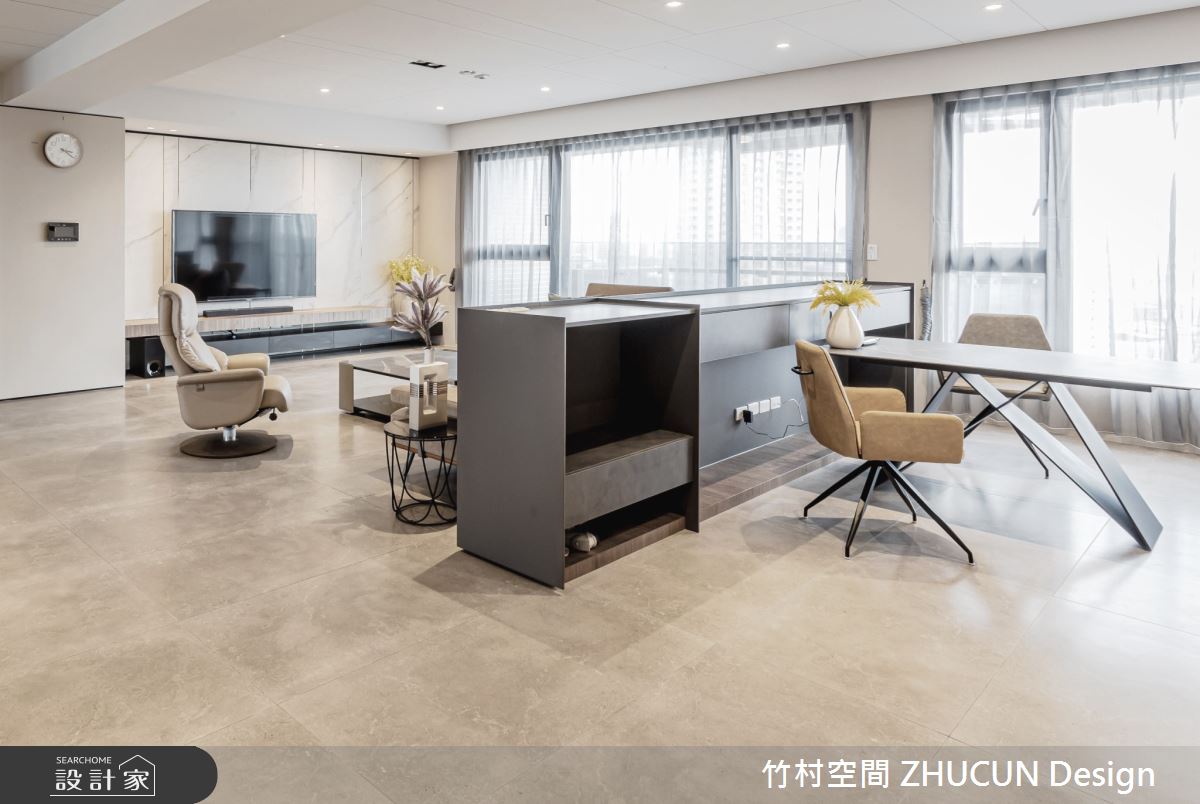 竹村空間以木紋磚、鐵件、木作貼皮、磁磚、壁布的搭配應用,呈現簡約風居家氛圍,將此間52坪、三房、單層、新成屋(5年以下)打造成舒適愜意的家庭空間,完成2位大人全家人的夢想之居。