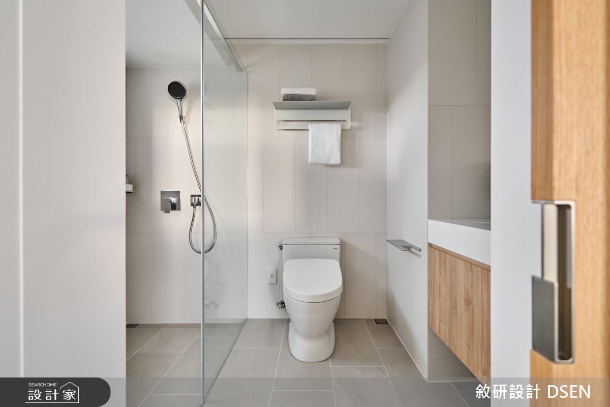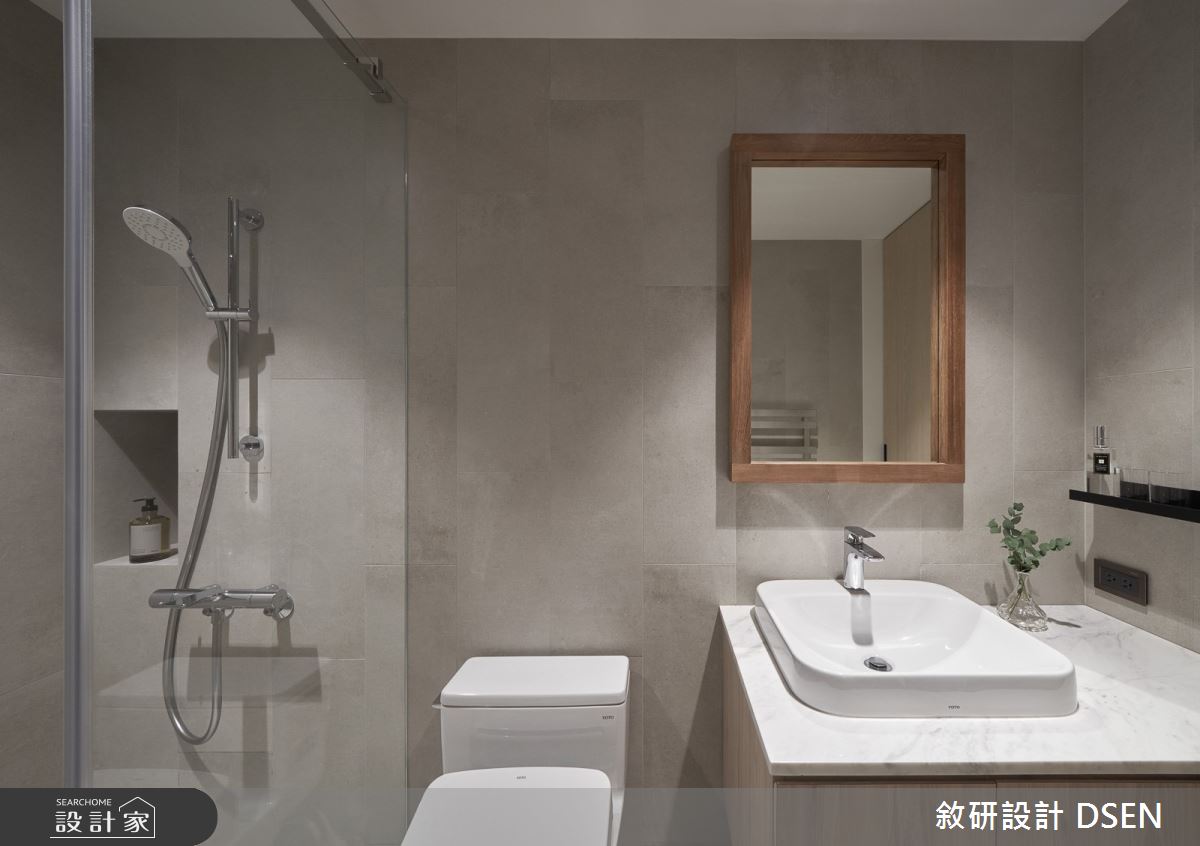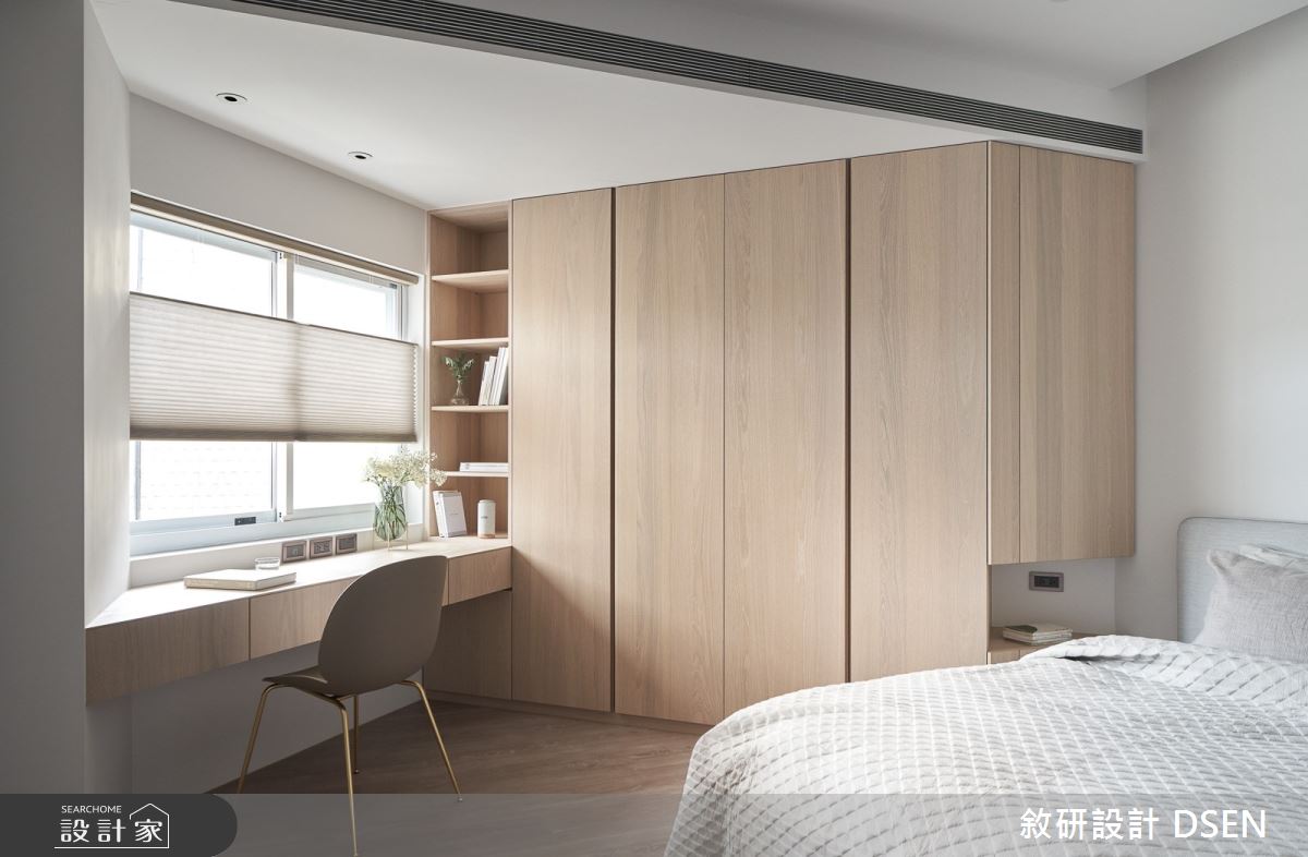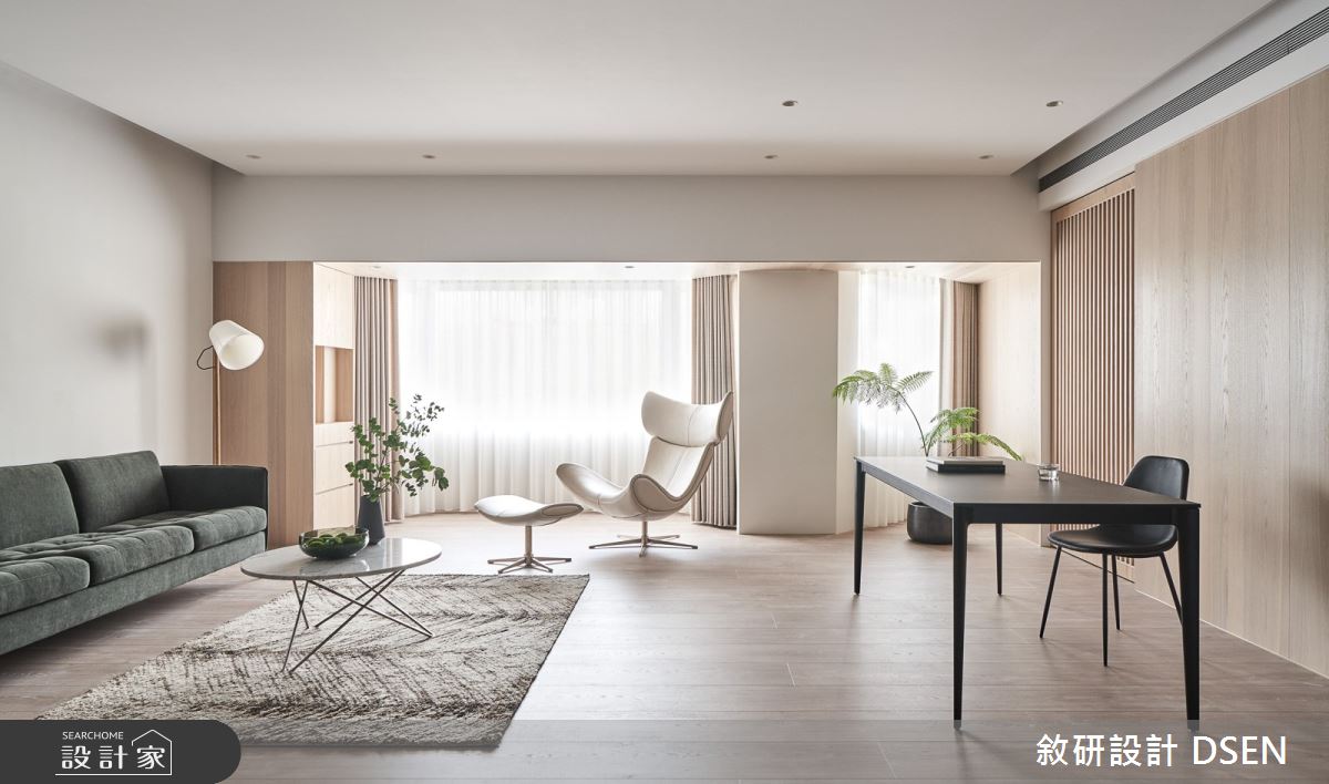 敘研設計有限公司以乳膠漆、海島型木地板、木地板、鐵件、灰鏡、木作貼皮、大理石、石材的搭配應用,呈現現代風居家氛圍,將此間32坪、兩房、單層、新成屋(5年以下)打造成舒適愜意的家庭空間,完成1位大人全家人的夢想之居。