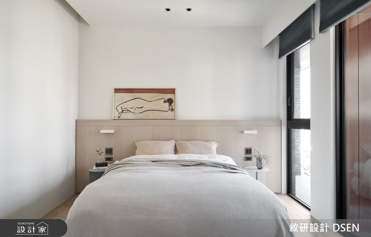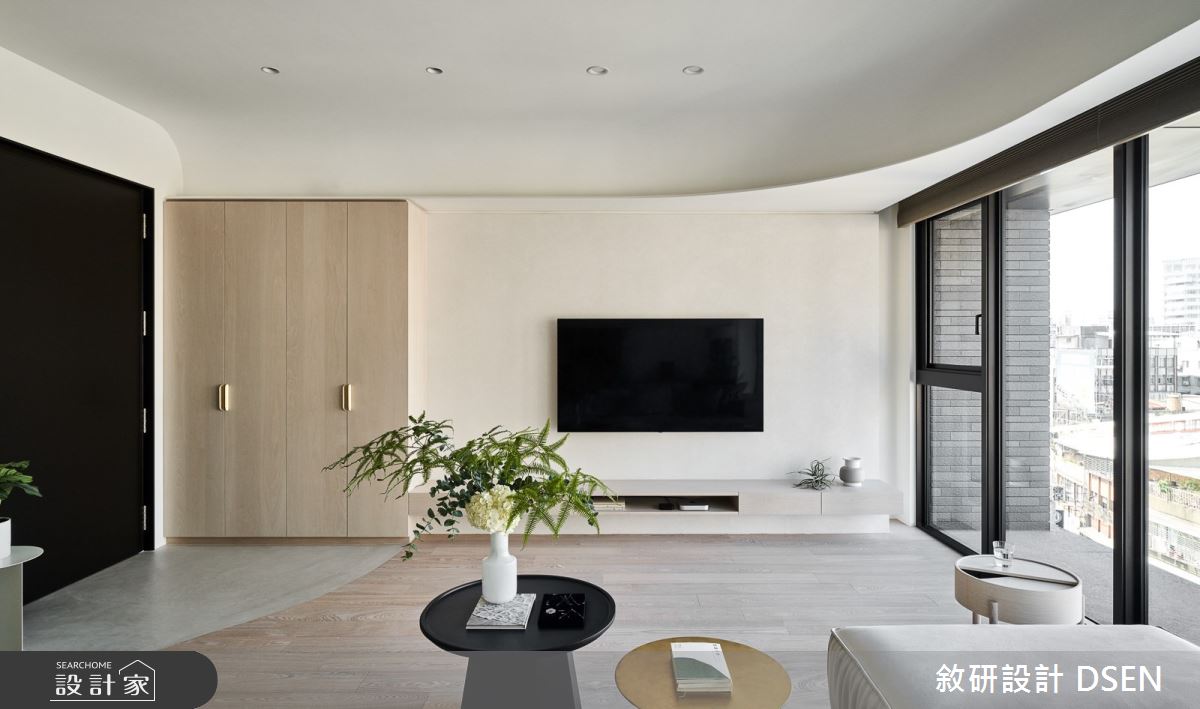 考量屋主喜愛栽種植物興趣,且相當講究生活品質,設計師盡可能發揮 40 坪屋況優勢,將陽光、空氣等不可或缺的自然元素帶進生活中,回歸純粹空間樣貌,再輔以建材特色,讓溫潤木的穩重特質主導簡約風設計,從呼吸空氣、生活氛圍到肌膚觸感,提供無微不至的舒適感。 此住宅格局優勢在於採光面佔比相當大,因此公領域窗戶皆運用落地窗,收攬充沛日光,從玄關踏進室內,一路望向餐廚、客廳與書房,視線皆流暢無阻,且光影由暗轉明豐富視覺感受,也順勢拉寬加深空間尺度。地坪、櫃體到牆面應用大量木質,透過深淺木色、大理石與鐵件元素穿插搭配,為生活染上溫暖、穩重、個性三種氣氛。另一特色是櫃體及立面設計,皆運用了弧面巧思,抹除空間中的銳利感,特別是廊道上書房玻璃面與鋼刷木皮,不同材質不對稱的弧型面,營造了趣味性且帶有延伸放大效果。另外,沙發旁、戶外陽台甚至主臥角落皆能看見中大型落地植栽身影,不但能營造活力感居家,還是裝飾佈置的重要角色。 小編的最愛 主臥床頭打上兩盞暖光,散發出細緻且靜謐的休息氣氛,不做滿的電視牆調整了格局動線,讓衛浴出口與衣帽間形成獨立領域,並利用兩者相連處,打造梳妝台,完備生活機能使用便利順手。
