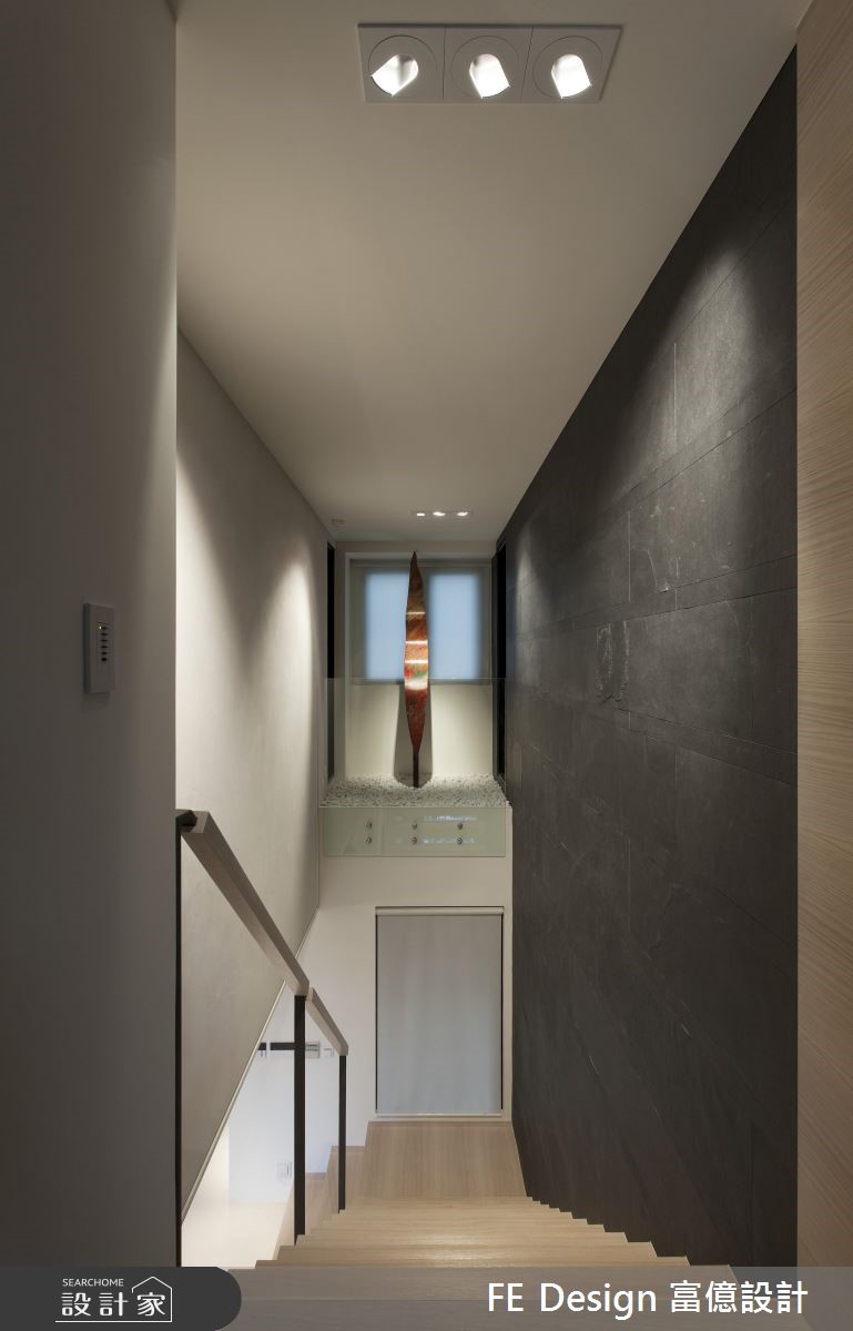 100 坪的現代風樓中樓,設計師承襲房子的地理優勢,以大面積挑高落地窗攬進好採光與優美景觀,並改變樓梯位置,透過格局的大動,讓整體空間更為開闊,快跟著小編一起來看看吧! 格局配置上,將客廳與餐廳、廚房連成一氣,使公共空間的阻隔降到最低,讓空間感往水平方向延展,而玻璃帷幕的落地窗設計,也拉高了垂直尺度,並以窗戶納入白天的好景觀,入夜後亦別有另一番風情;除了在一樓打造迎賓客廳之外,上層也額外規劃起居小客廳,並讓走道呈開放式規劃,連結上下樓層的挑高視野,讓每個場域享有不同的觀景視角;整體以簡潔大方的用色與低光澤的材料,締造低調高雅的品味,且妝點具有巧思的照明燈光,隱隱烘托典雅氛圍,豐富居家各個角落的獨特表情! 小編的最愛 樓梯以懸浮的概念進行打造,讓視覺重量減輕,並以溫潤木色暖化黑牆的生硬感,搭配燈光強化層次,讓樓梯不僅成為串聯樓層的結構,也形成生活中的絕佳裝飾!