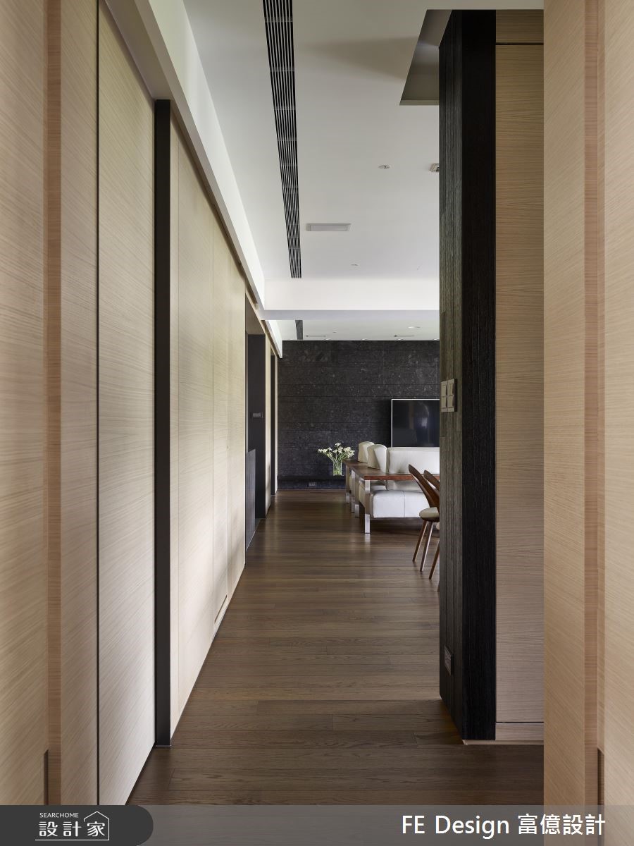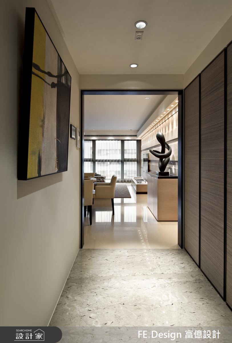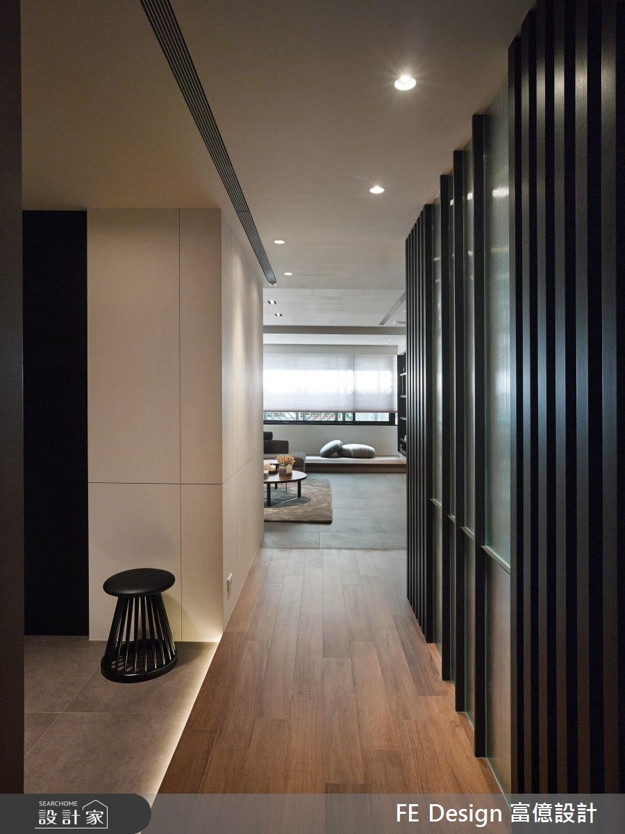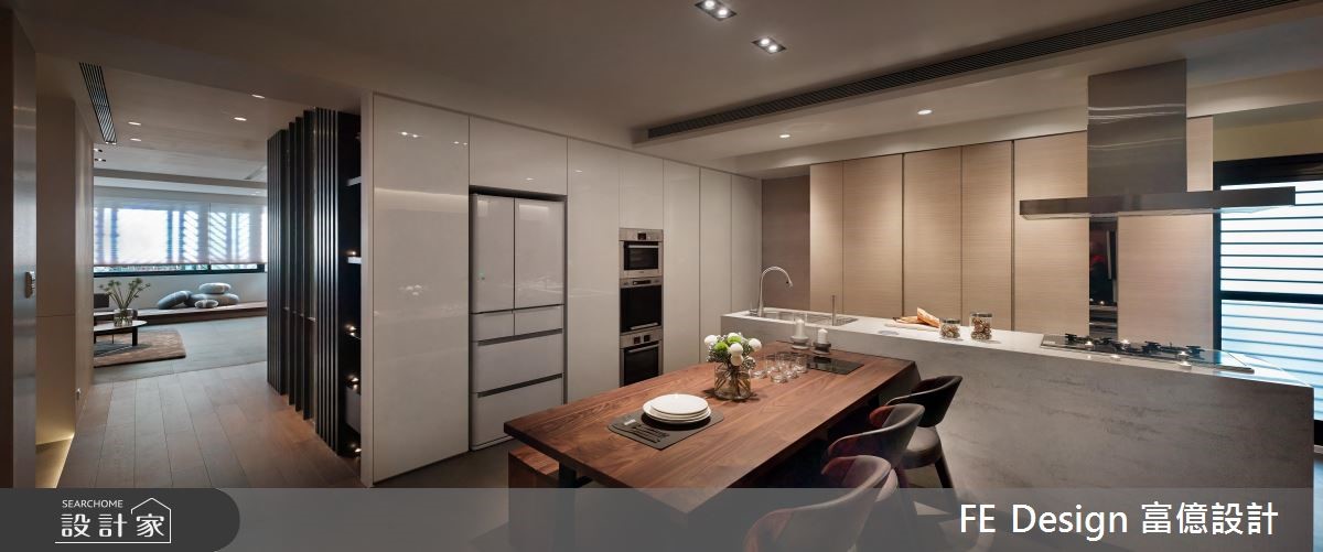 以現代風格結合古典氛圍的設計從玄關處牆面藝術品與椅凳的陳列就能感受到設計師的用心。沿著實木貼皮的牆面往內延伸是寬敞的客廳空間;開放式設計與客餐廳一字型排列讓採光能夠發會最大的效益。電視主牆將格狀櫃體鑲嵌其中,銜接電視後方的大理石面,展現低調的空間氣宇;訂製的長型淺灰沙發寬型柔軟的坐面提供一家三口舒服的休憩空間。在57坪大的新成屋裡,所有區域動線都是開放流暢地圍繞著公共區域安排,不需要經過複雜窄長的廊道,讓各場域能彼此獨立卻十分貼近,凸顯原始方正格局的優勢,讓一家三口可以在略帶古典風情的新居裡享受居家生活。