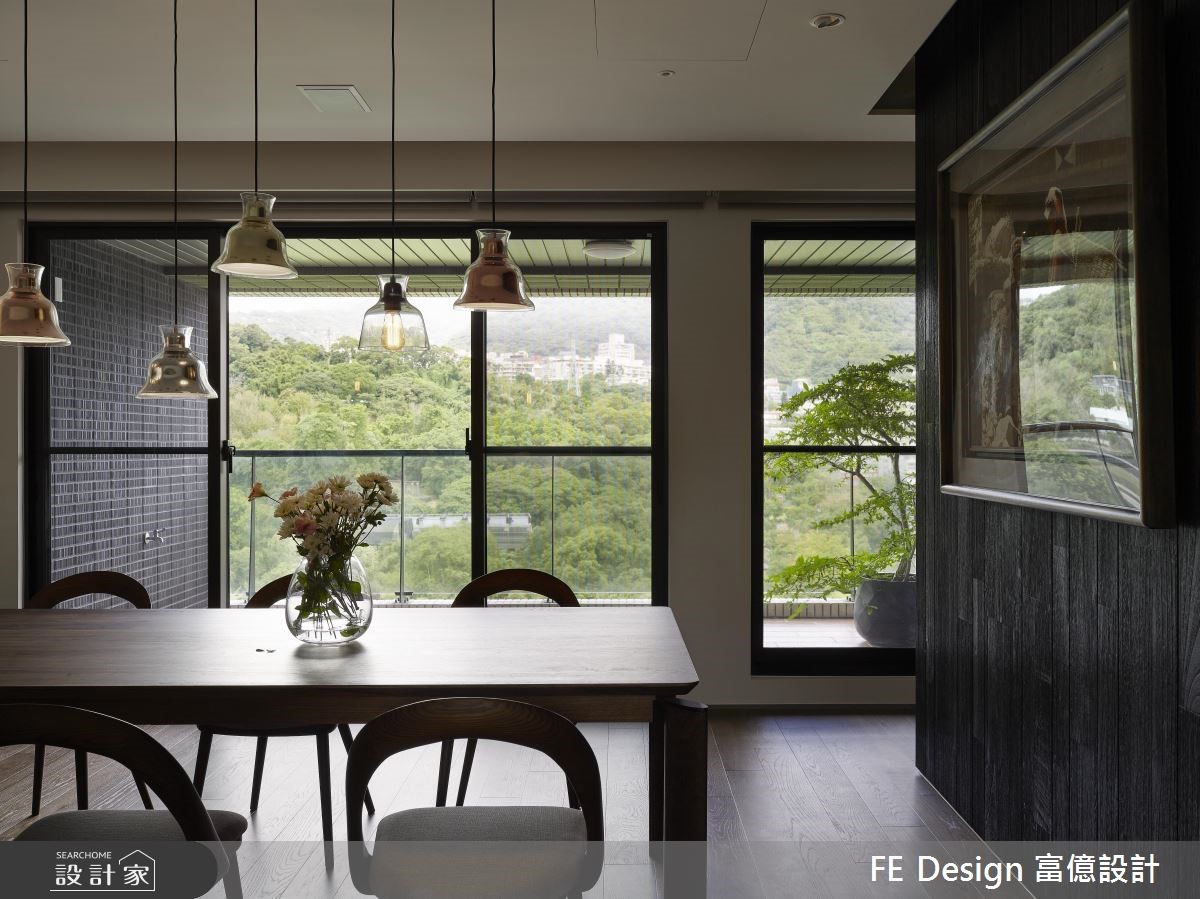 56 坪現代風居家,透過客廳、餐廳的大面開窗,讓室內可面對悠遠的山林綠地,隨時與美好山丼相伴,時而雲霧之中,時而藍天綠樹,時而彩虹大現,大自然的生息全都在生活中,透過規劃手法,把大自然的生息引進室內,促使內外的界線縮到最小,而視野無盡遼闊,並特意將主要的生活空間面向安排在面向窗外,如沙發、餐桌、廚房等等,室內建材則運用溫煦木皮、石材電視牆、木地板等作搭接,創造美好清新的空間氣場。