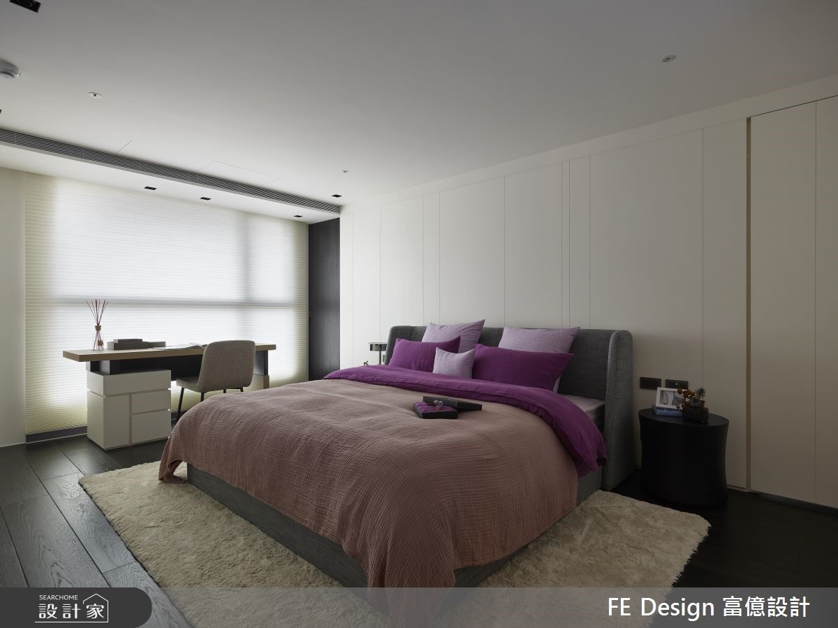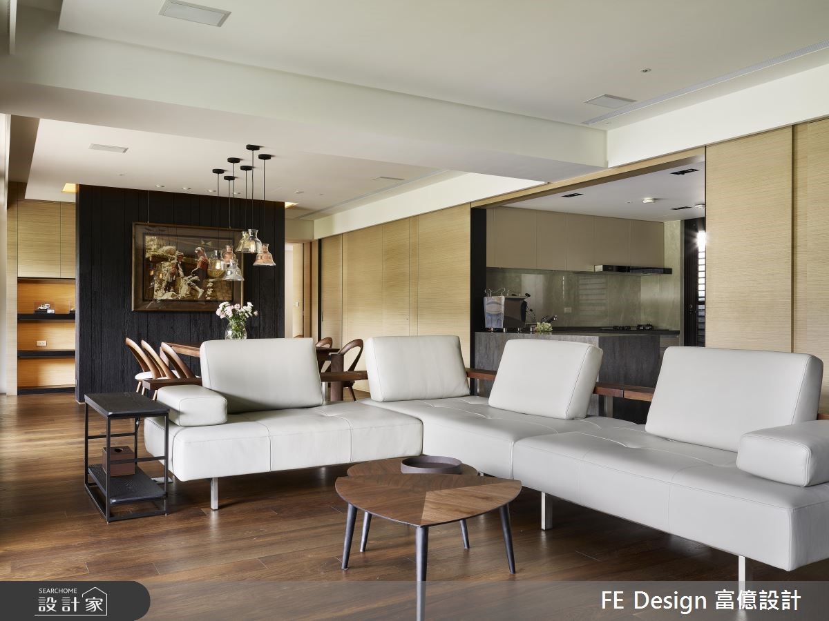 一望無際的遼闊視野為 56 坪現代風新居一大特色,室內以簡練大方為主軸,黑與白的對比搭配、精品展示間般的精緻光影,替日夜創造了截然不同的生活景況。長型公共空間,以開放設定讓客、餐廳使用者能同時收攬窗外好光景;L型沙發與白石紋電視牆,奠定了奢華與慵懶並俱的空間表情;L型廚房與立面深色系櫃體的連續安排,賦予空間低調時尚韻味;在客、餐之間微微落差的木質地坪,化身一處隱形書房,內凹設定、拉簾給予充分隱私。私領域極簡大方,延續公共空間的黑白配,還原空間的簡練型感,並透過大面開窗來凸顯好風景特色。