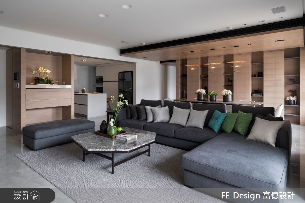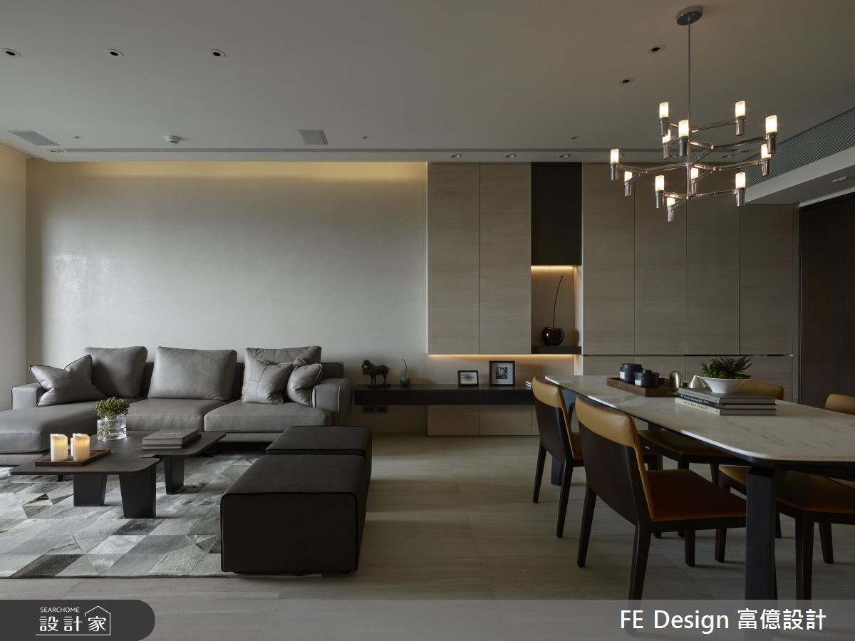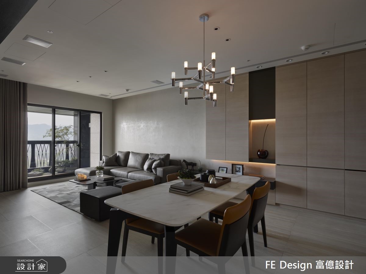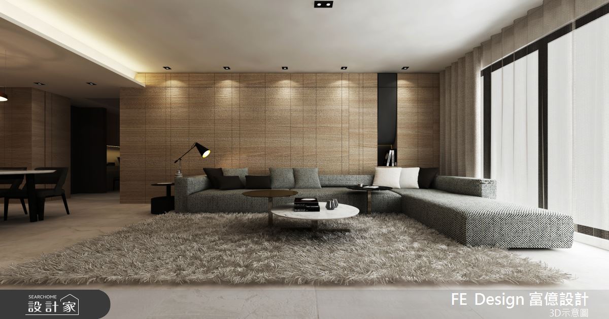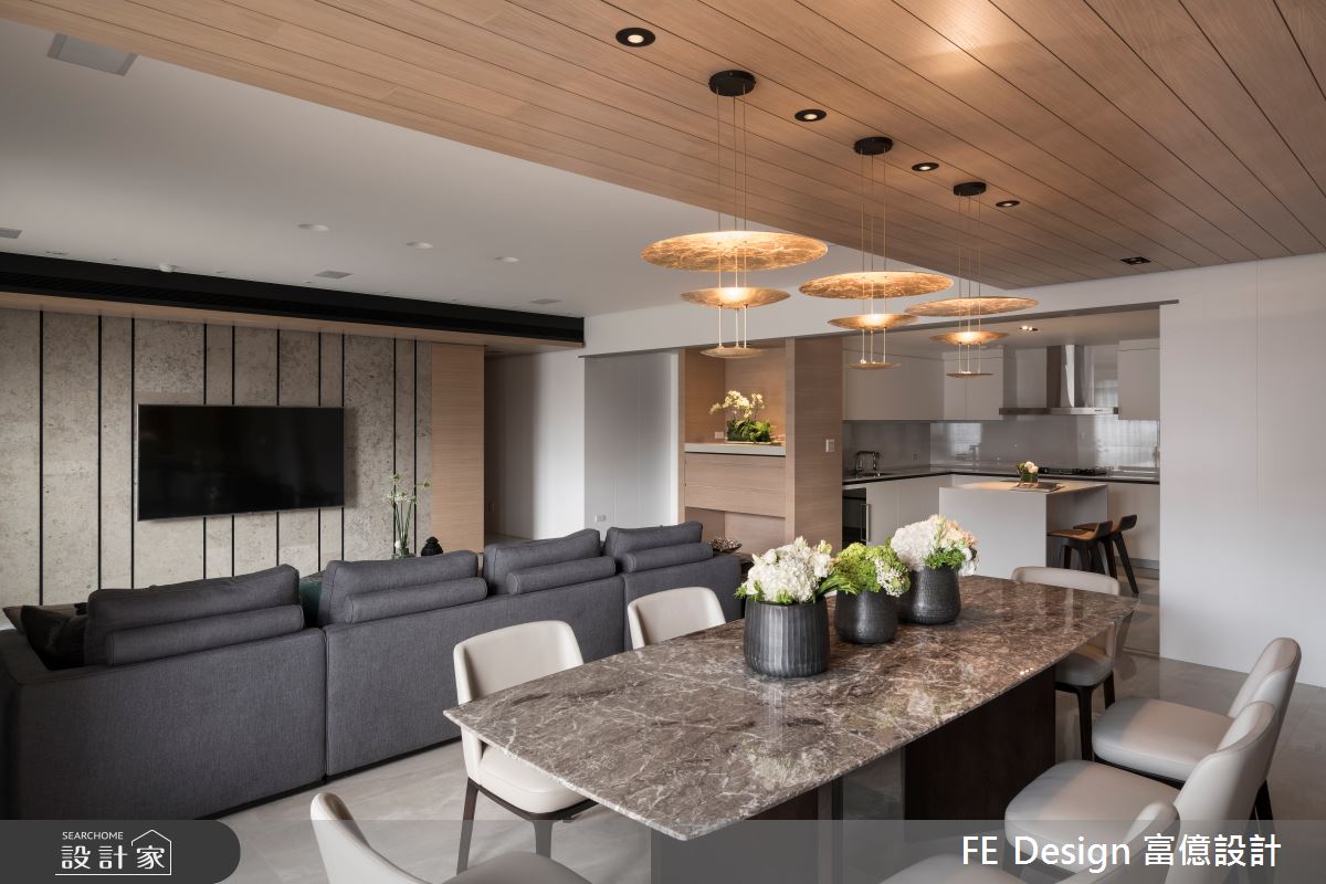來自富億空間設計的108坪現代風住宅案,屋主一家人共有2位大人、2位小孩,是一間單層毛胚屋的四房格局,設計師藉由建材以壁紙、木地板、石英磚/拋光石英磚、不鏽鋼、鐵件、灰鏡、茶玻、烤玻、鍍鈦金屬、木作貼皮、烤漆、大理石、磁磚、樂土、人造石、賽麗石、皮革、石材、繃布、噴漆、噴砂玻璃、特殊漆的搭配應用,實現一家人的理想生活。