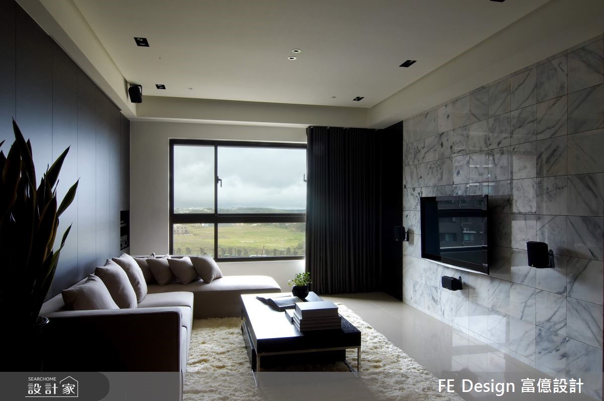 一望無際的遼闊視野為 56 坪現代風新居一大特色,室內以簡練大方為主軸,黑與白的對比搭配、精品展示間般的精緻光影,替日夜創造了截然不同的生活景況。長型公共空間,以開放設定讓客、餐廳使用者能同時收攬窗外好光景;L型沙發與白石紋電視牆,奠定了奢華與慵懶並俱的空間表情;L型廚房與立面深色系櫃體的連續安排,賦予空間低調時尚韻味;在客、餐之間微微落差的木質地坪,化身一處隱形書房,內凹設定、拉簾給予充分隱私。私領域極簡大方,延續公共空間的黑白配,還原空間的簡練型感,並透過大面開窗來凸顯好風景特色。