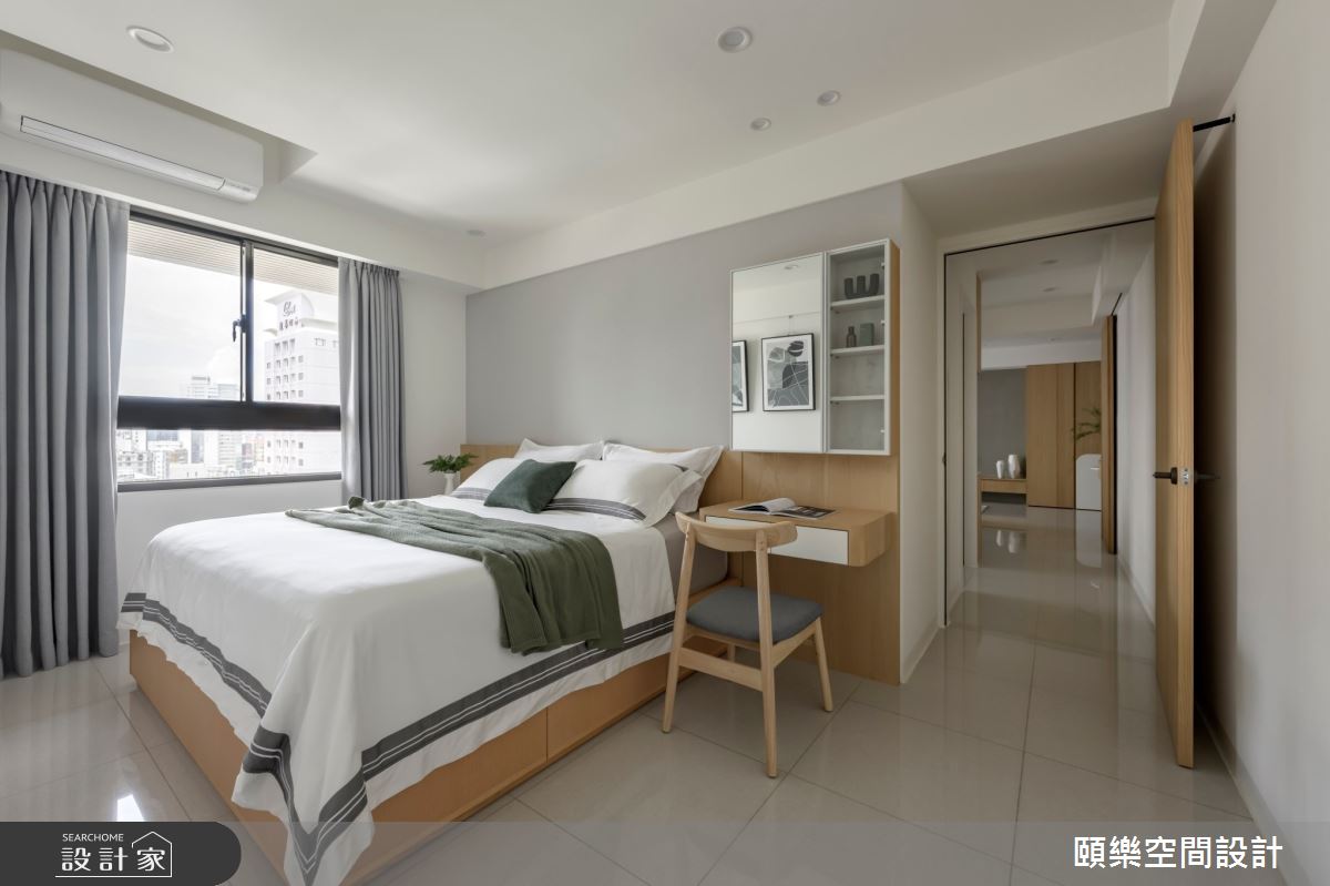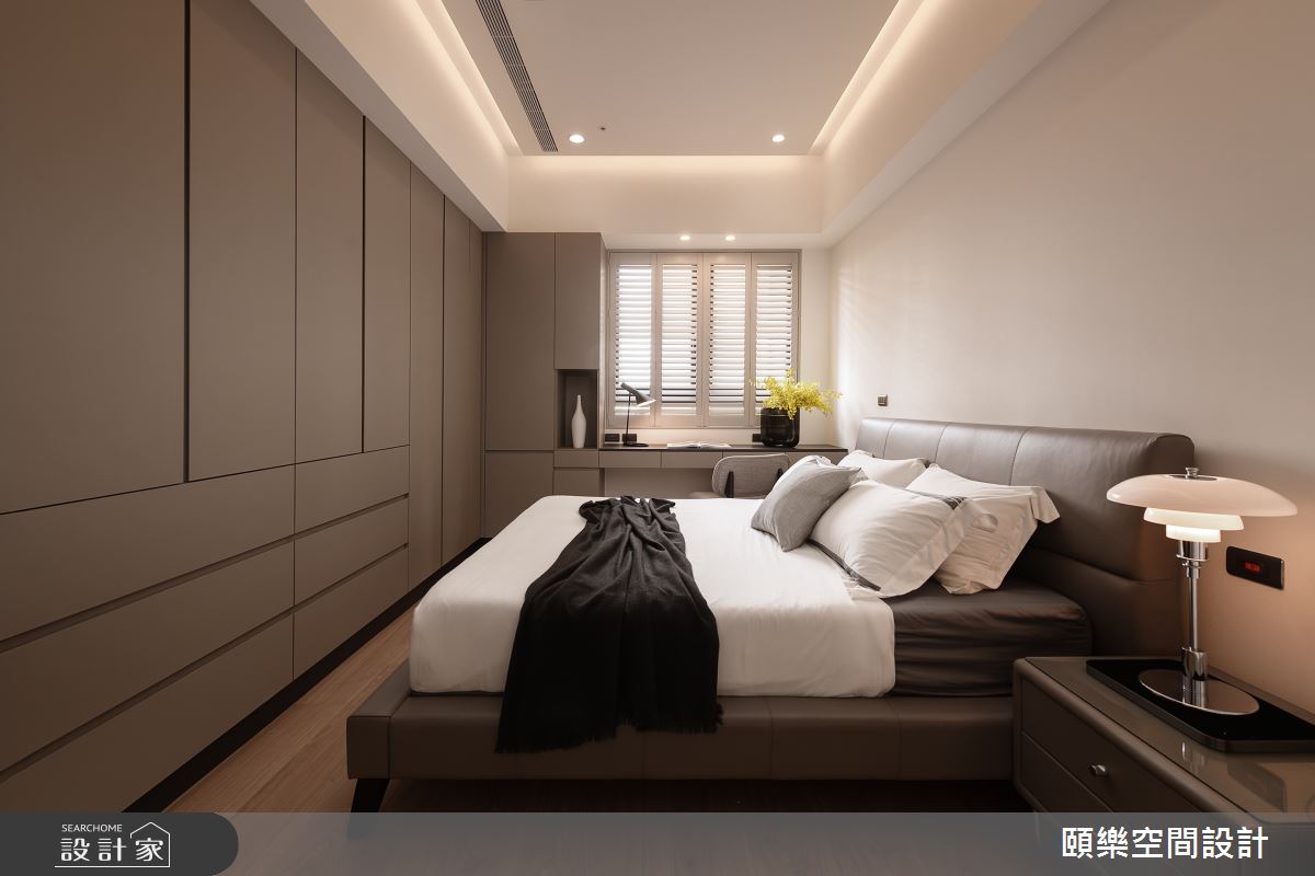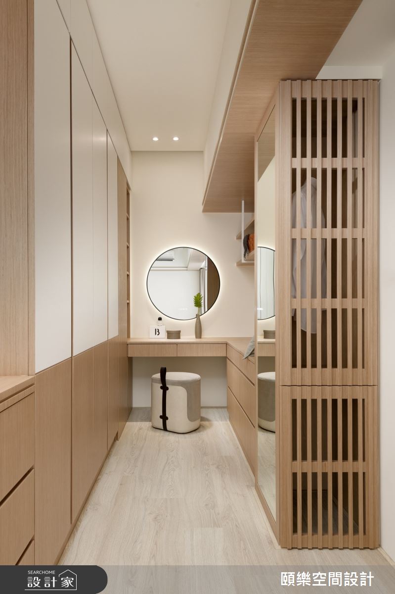 頤樂空間設計以乳膠漆、超耐磨木地板、灰鏡、烤漆、系統板材、木百葉的搭配應用,呈現現代風居家氛圍,將此間35坪、三房、單層、新成屋(5年以下)打造成舒適愜意的家庭空間,完成1位大人全家人的夢想之居。