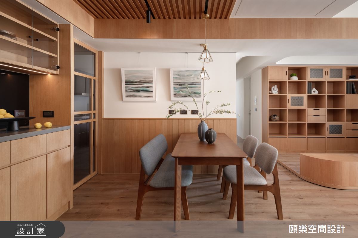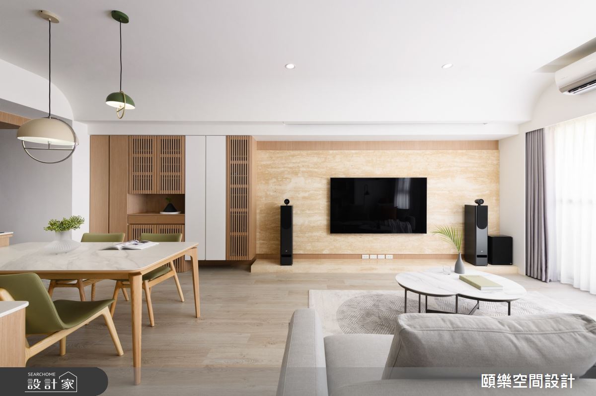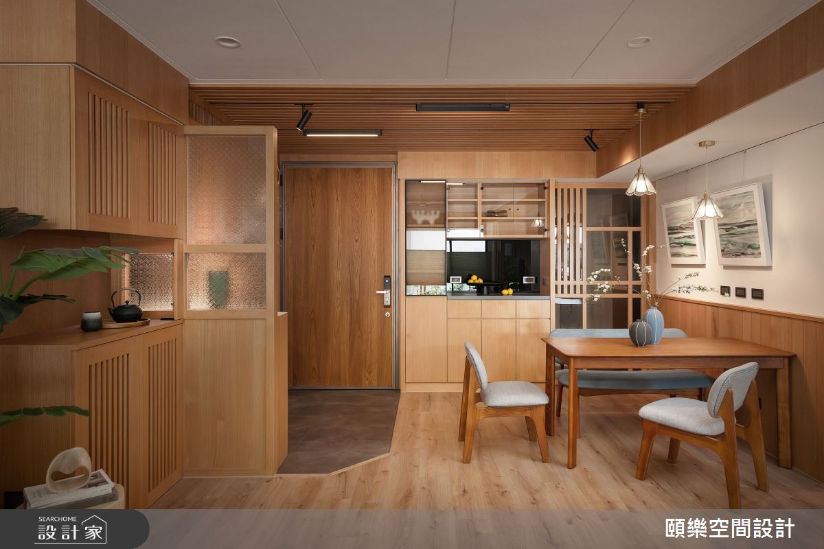 頤樂空間設計以乳膠漆、超耐磨木地板、鋼刷木皮、木百葉、賽麗石、石材、噴漆、海棠花玻璃、洞石、實木鋼刷木皮的搭配應用,呈現日式風居家氛圍,將此間35坪、四房、單層、新成屋(5年以下)打造成舒適愜意的家庭空間,完成全家人的夢想之居。