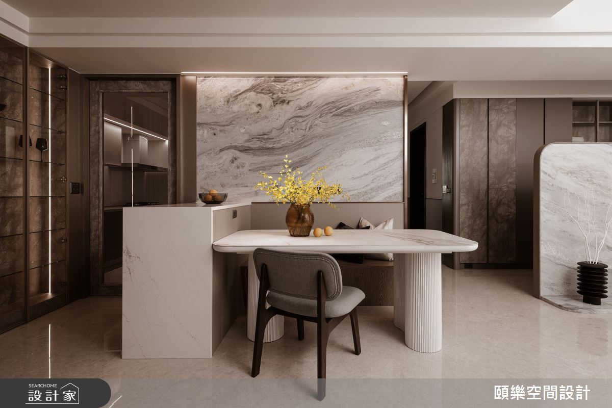 來自頤樂空間設計的45坪奢華風住宅案,屋主一家人共有2位大人、2位小孩,是一間單層預售屋的四房格局,設計師藉由建材以乳膠漆、超耐磨木地板、茶玻、鍍鈦金屬、木作貼皮、烤漆、鋼刷木皮、系統板材、大理石、磁磚、木百葉、賽麗石、石材、噴砂玻璃的搭配應用,實現一家人的理想生活。