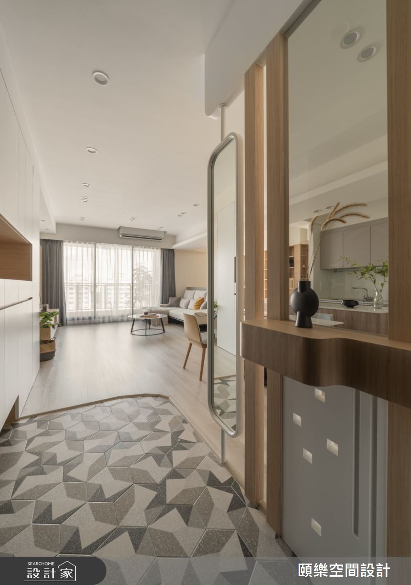 頤樂空間設計以乳膠漆、超耐磨木地板、灰鏡、烤漆、系統板材、木百葉的搭配應用,呈現現代風居家氛圍,將此間35坪、三房、單層、新成屋(5年以下)打造成舒適愜意的家庭空間,完成1位大人全家人的夢想之居。