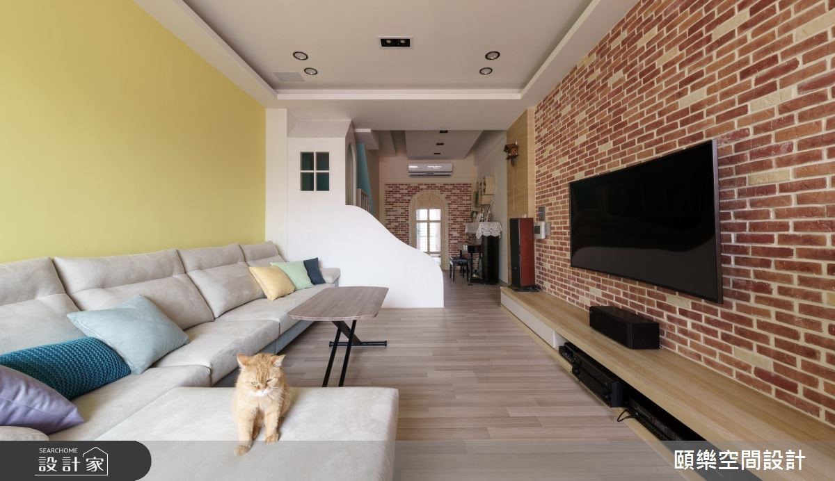熱鬧開朗的一家五口與兩隻貓,共居這間 30 坪的長型屋,設計師透過文化石和繽紛色彩裝飾居家,同時特別打造小孩與貓咪的遊樂區域,讓空間充滿全家人的歡笑聲。 由於家中孩子都是學齡前,因此設計師規劃流暢的動線,並使用超耐磨木地板,加上可移動家具,讓孩子可以在地上安全地活動。客廳的電視牆運用紅白交錯的文化石,營造宛如超級瑪莉的磚塊意象,與拱門牆面的材質相互輝映,創造充滿童趣的立面質感。 設計師利用樓梯下方的畸零空間,打造三個孩子專屬的小城堡,斜度適中的溜滑梯,使孩子能夠自由上下玩耍。而鋼琴後方的白牆,則設置蜂巢狀的貓跳台,讓整個區域變成人貓共處的小型遊樂園。主臥透過一道拉門分隔木質陽台,自然清新的陽台成為孩子另一處遊戲空間。 小編的最愛 客廳是家人互動的重要核心,簡單的沙發與擺設,給一家五口更多的相處空間,也能與貓咪融洽地生活。