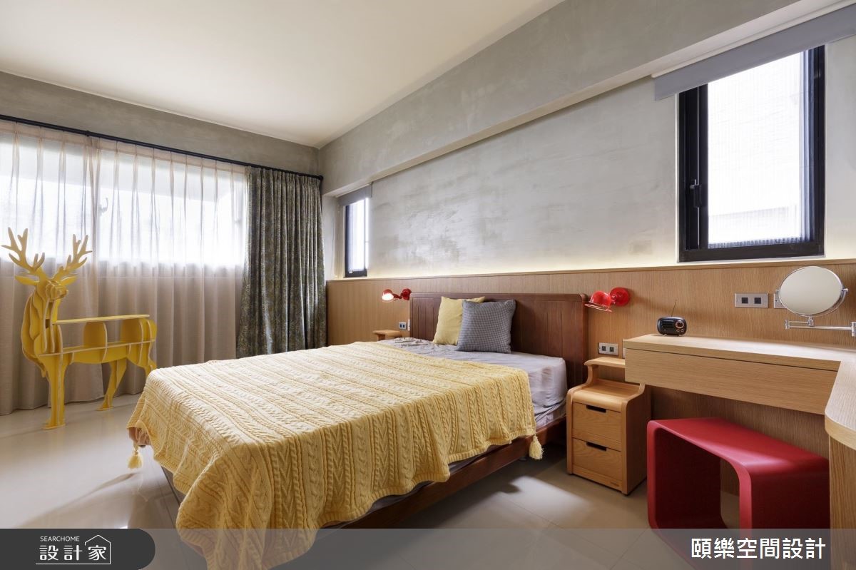 頤樂空間設計以乳膠漆、超耐磨木地板、茶玻、鍍鈦金屬、木作貼皮、烤漆、鋼刷木皮、系統板材、大理石、磁磚、木百葉、賽麗石、石材、噴砂玻璃的搭配應用,呈現簡約風居家氛圍,將此間45坪、四房、單層、預售屋打造成舒適愜意的家庭空間,完成2位大人、2位小孩全家人的夢想之居。