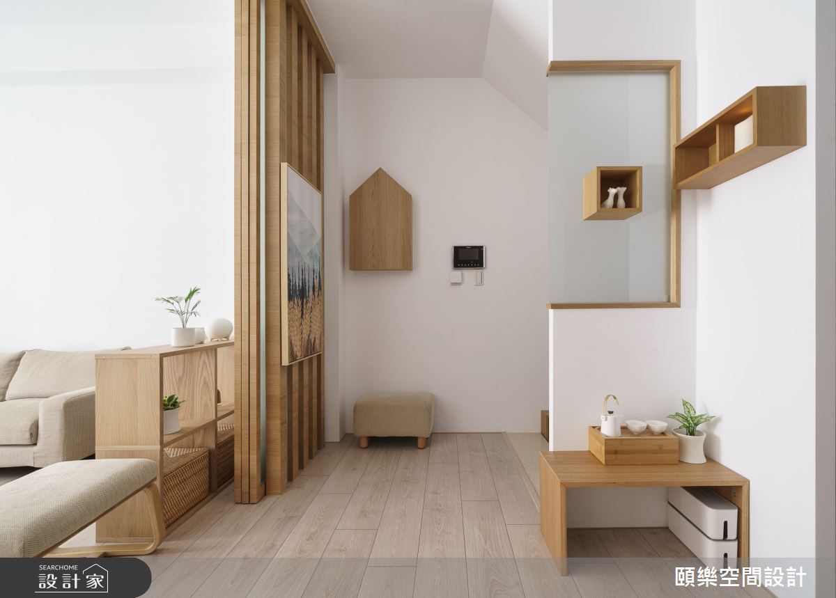 頤樂空間設計以乳膠漆、超耐磨木地板、鋼刷木皮、木百葉、賽麗石、石材、噴漆、海棠花玻璃、洞石、實木鋼刷木皮的搭配應用,呈現日式風居家氛圍,將此間35坪、四房、單層、新成屋(5年以下)打造成舒適愜意的家庭空間,完成全家人的夢想之居。
