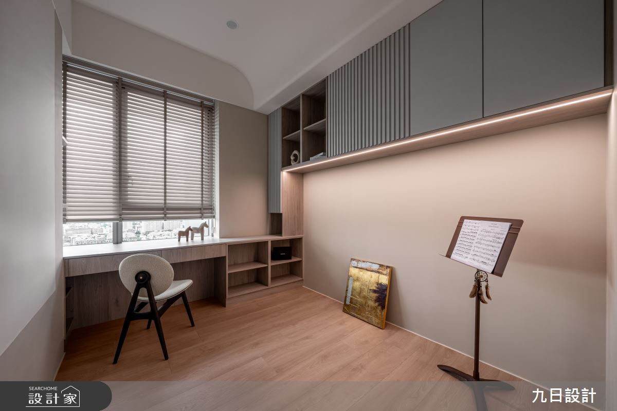 九日設計以油漆、木作、系統、玻璃磚、燈條、水磨石、藝術塗料的搭配應用,呈現侘寂風居家氛圍,將此間40坪、三房、單層、新成屋(5年以下)打造成舒適愜意的家庭空間,完成全家人的夢想之居。