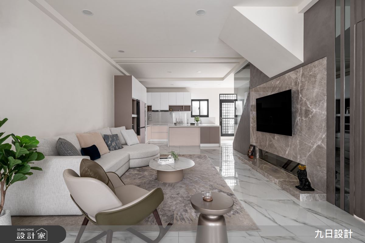 九日室內裝修設計以木作、系統板材、油漆、鋁框玻璃、烤玻、鐵件、義大利塗料的搭配應用,呈現現代輕奢風居家氛圍,將此間48坪、五房、透天別墅、新成屋(5年以下)打造成舒適愜意的家庭空間,完成3位大人、2位小孩全家人的夢想之居。