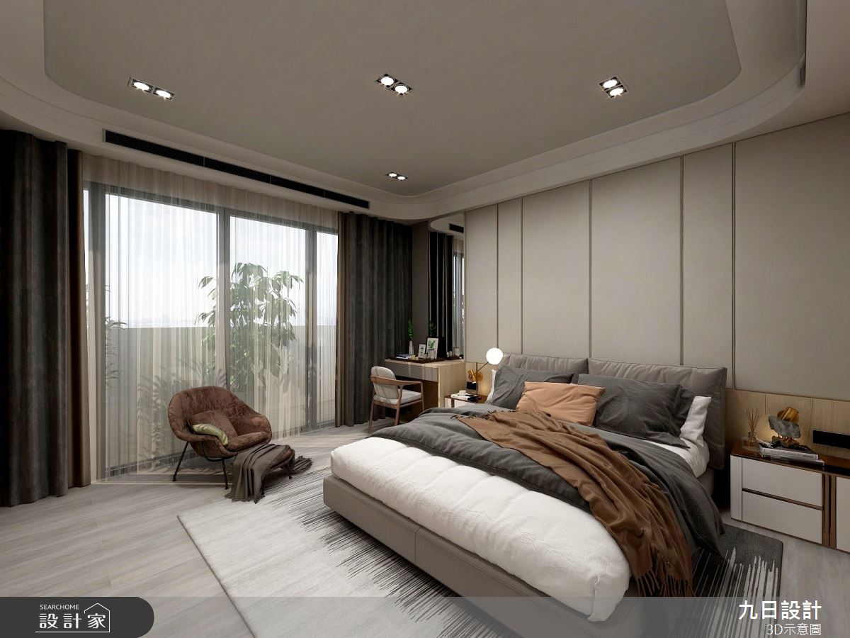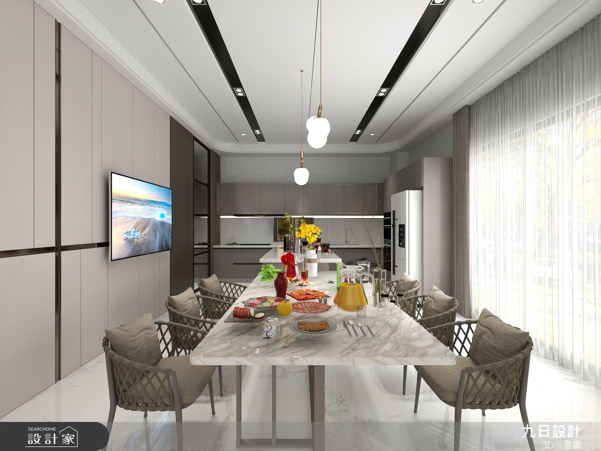 九日設計以系統櫃、木作、油漆、鐵件、鋁框、藝術塗料、大理石、壁紙的搭配應用,呈現現代風居家氛圍,將此間110.5坪、四房、透天別墅、新成屋(5年以下)打造成舒適愜意的家庭空間,完成全家人的夢想之居。