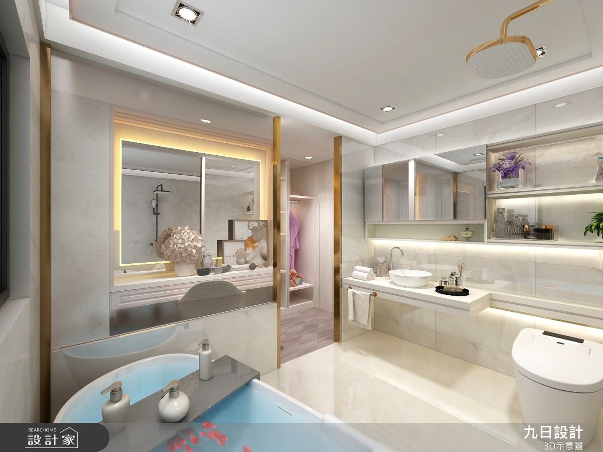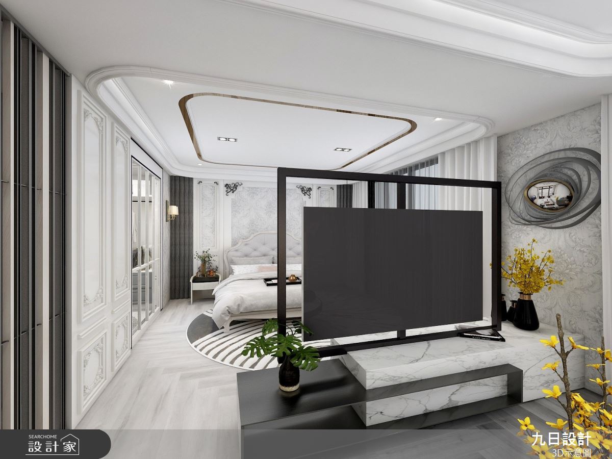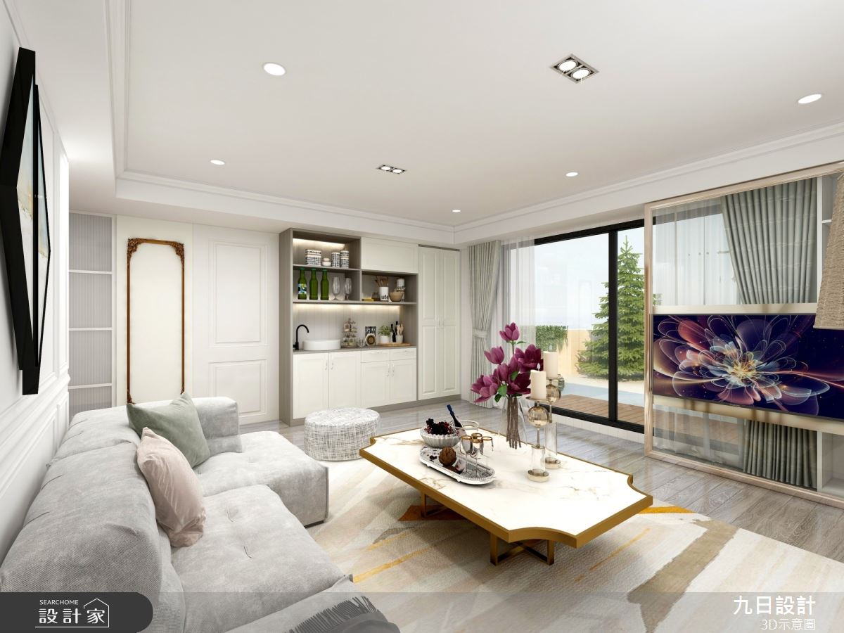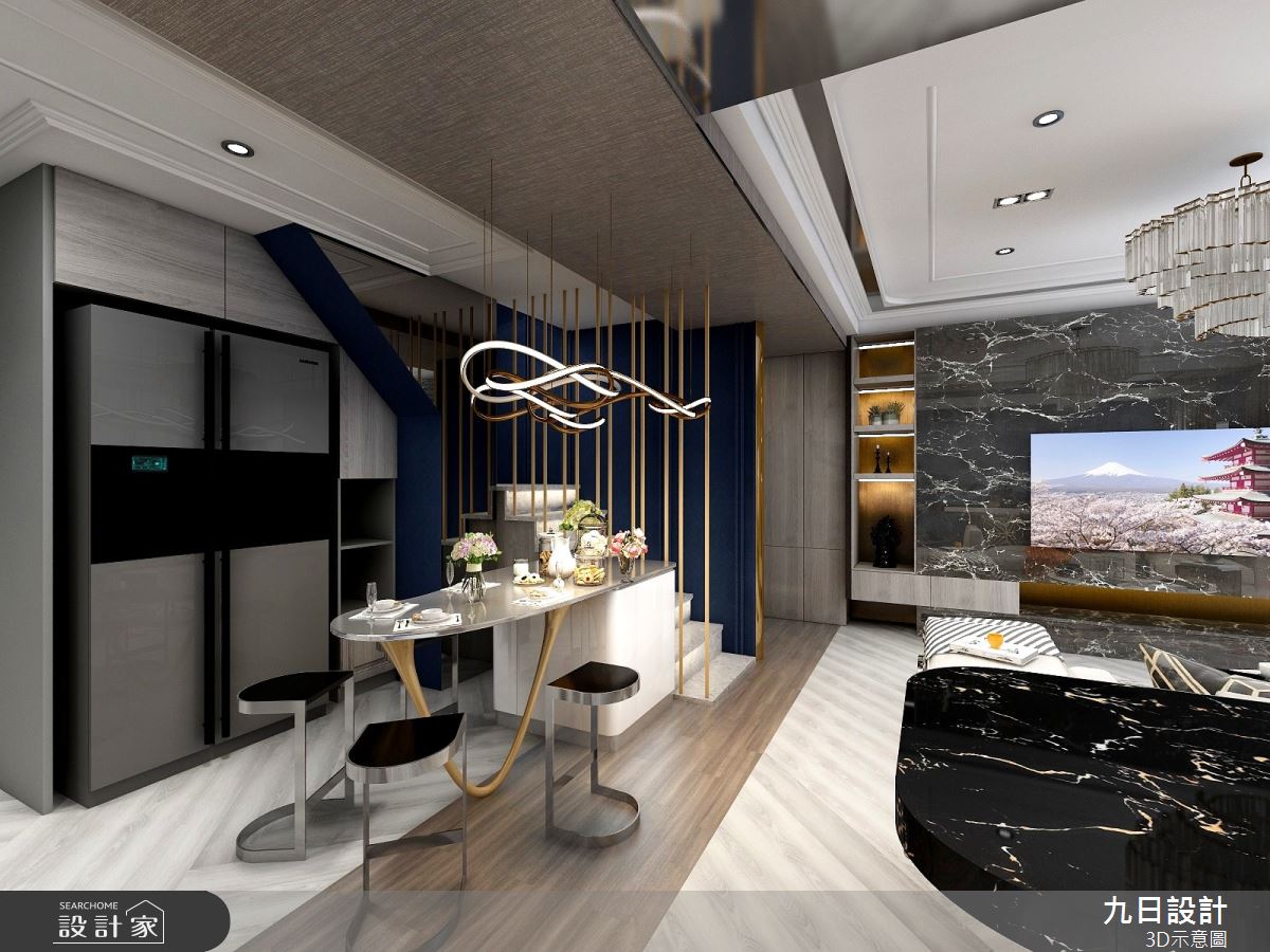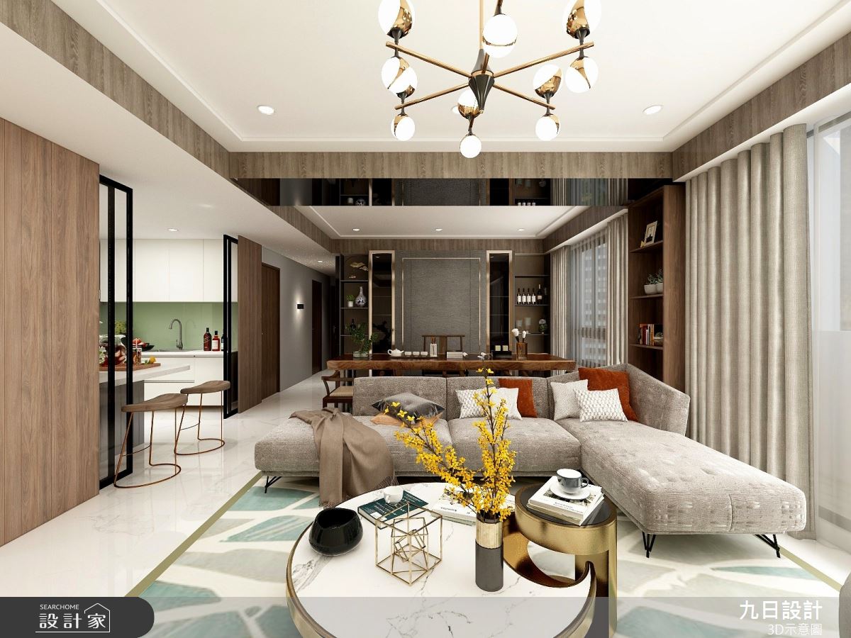 由九日設計精心規劃的100坪四房住宅空間,家庭成員一共有2位大人、2位小孩。因應屋主需求,設計師運用現代美式輕奢風作為主軸,搭配壁紙、鐵件、烤漆、大理石、軌道燈、藝術塗料、系統櫃、鍍鈦、玻璃、石英石、大板磚、烤漆玻璃、繃布、條燈、磁吸式軌道燈,打造全家人的夢想家居。