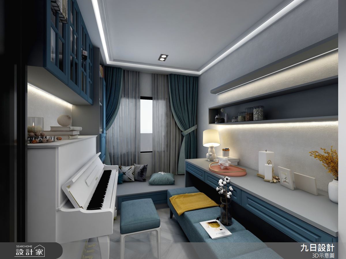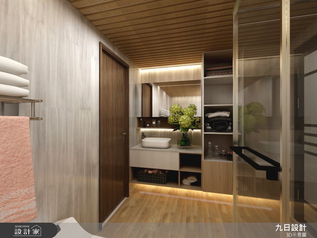九日設計以集成角材、矽酸鈣板、鐵件、石材、御影石板、木地板、系統櫃的搭配應用,呈現混搭風居家氛圍,將此間79坪、四房、樓中樓、新成屋(5年以下)打造成舒適愜意的家庭空間,完成2位大人、1位小孩全家人的夢想之居。
