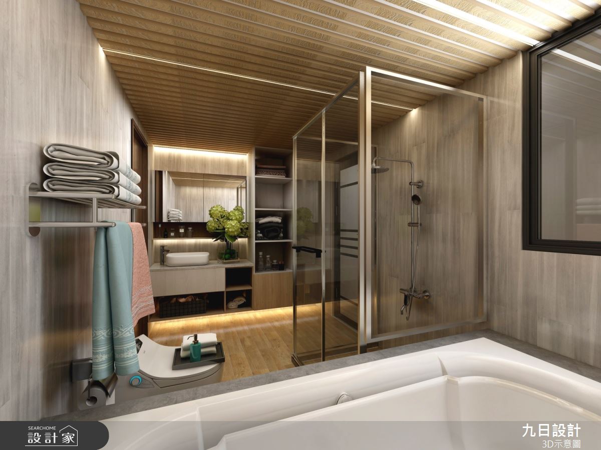 本案為九日設計的90坪混搭風新成屋(5年以下)設計作品,格局為樓中樓四房的居住空間。全室建材的搭配,應用集成角材、矽酸鈣板、鐵件、石材、實木、木地板、長虹玻璃、系統櫃,展現溫馨的居家氛圍。