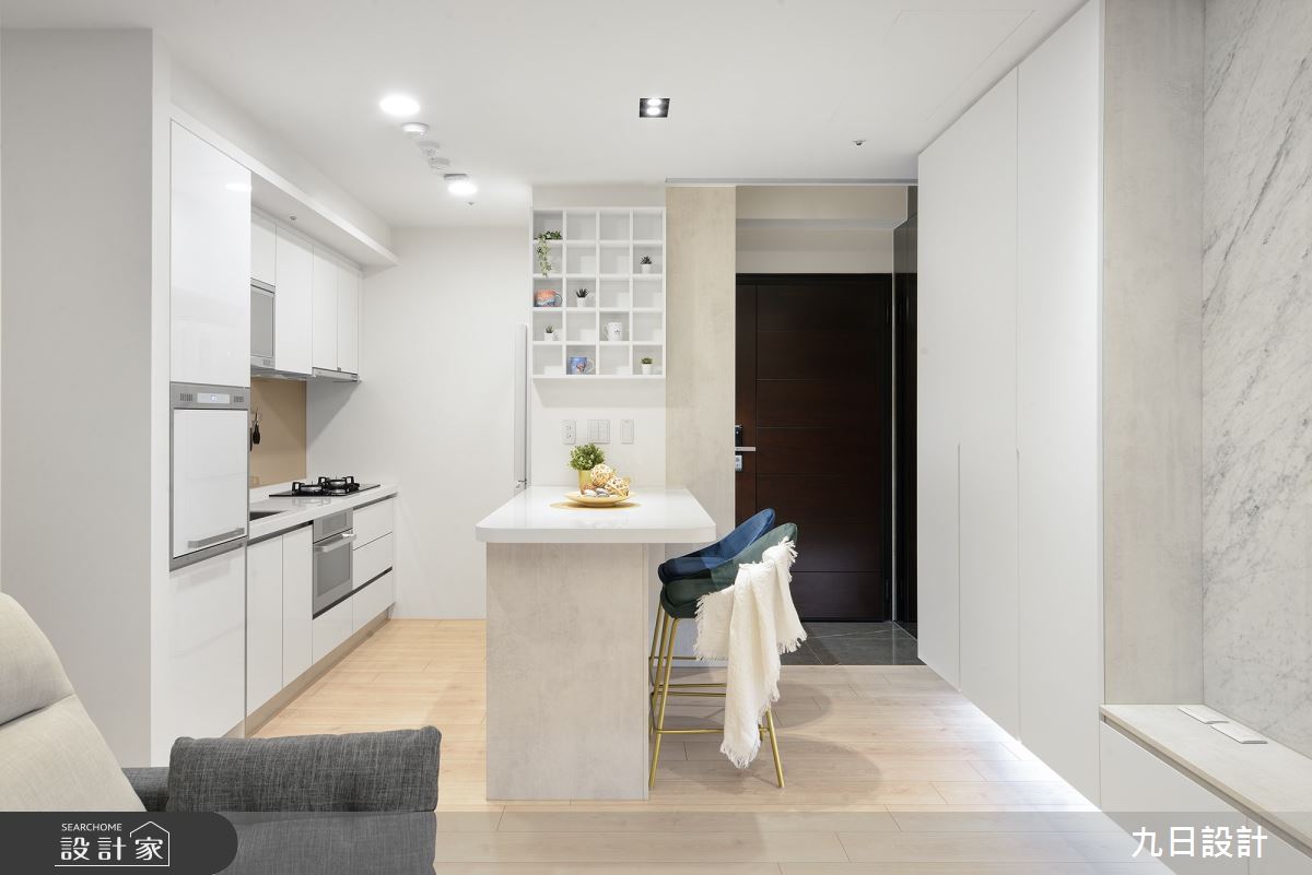 來自九日設計的21坪混搭風住宅案,是一間單層新成屋(5年以下)的兩房格局,設計師藉由建材以系統櫃、木作、矽酸鈣板、油漆、磁磚、鐵件、石材、長虹玻璃、灰玻的搭配應用,實現一家人的理想生活。