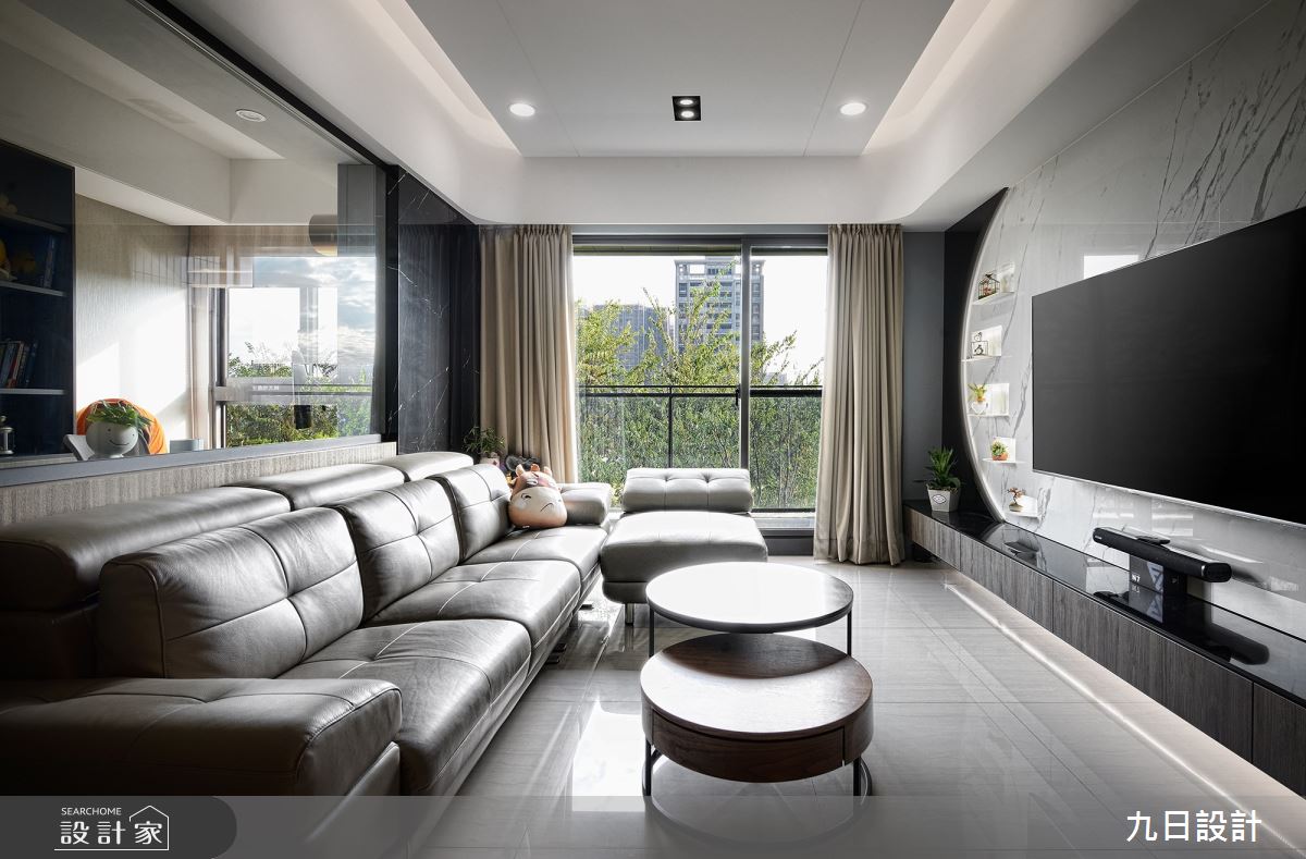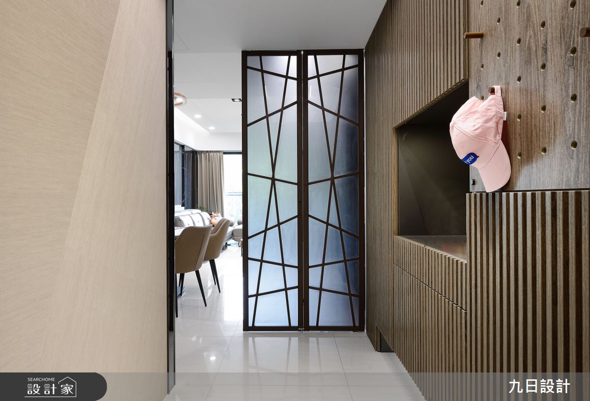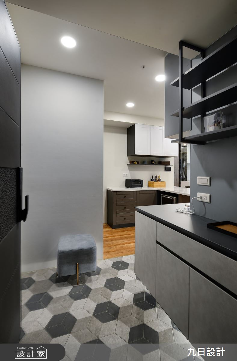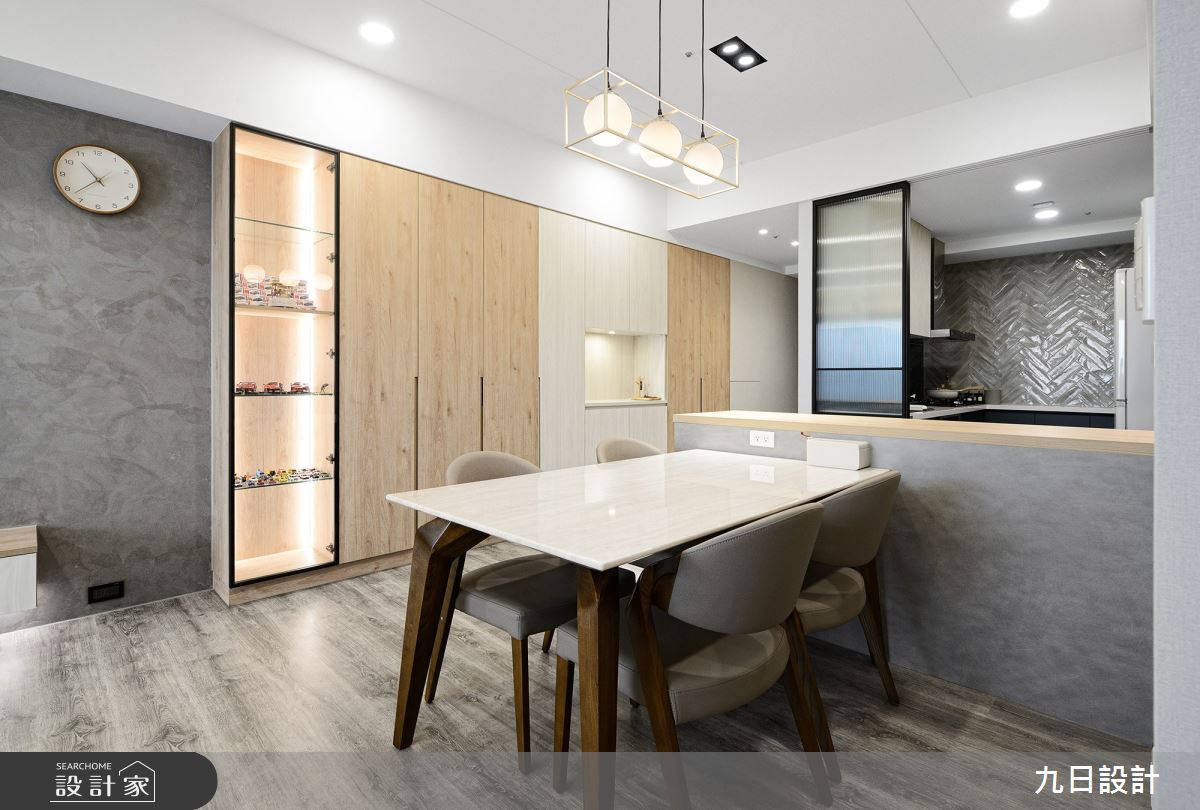 九日設計以薄板磚、鐵件、木作、塗料、玻璃、系統櫃、壁紙、金屬的搭配應用,呈現混搭風居家氛圍,將此間28坪、三房、單層、新成屋(5年以下)打造成舒適愜意的家庭空間,完成3位大人全家人的夢想之居。