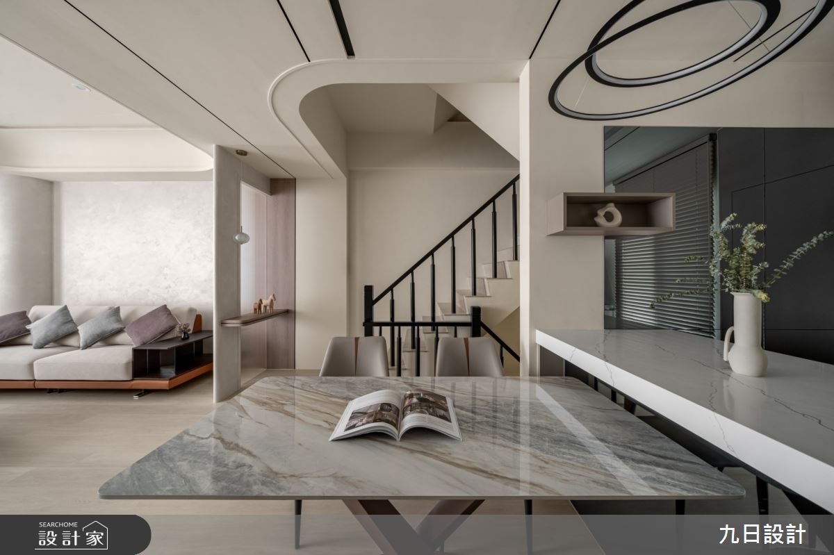 九日設計以壁紙、木作、系統、藝術漆、SPC地板、玻璃的搭配應用,呈現混搭風居家氛圍,將此間35坪、四房、透天別墅、新成屋(5年以下)打造成舒適愜意的家庭空間,完成2位大人全家人的夢想之居。