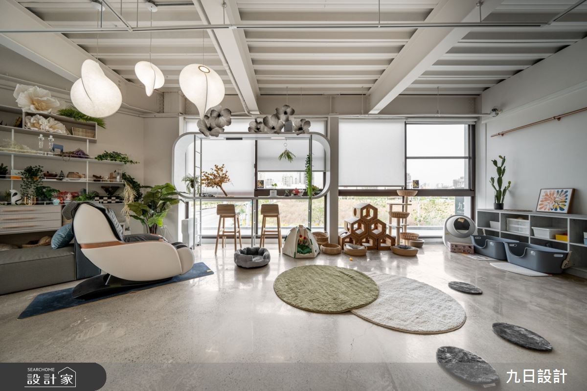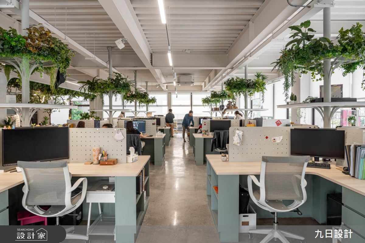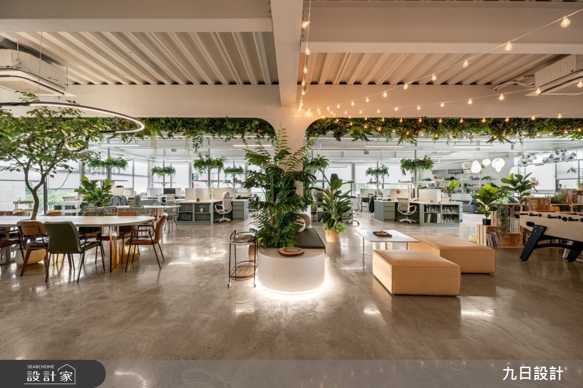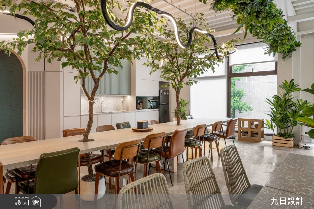 九日設計以鐵件、木作、藝術漆、玻璃、系統板、智能燈具、空心磚、波隆地毯、晶化地坪、綠植造景的搭配應用,呈現混搭藝術風格的風格氣息,將此間150坪中古屋(5~15年)優雅詮釋成舒適愜意的商業空間。