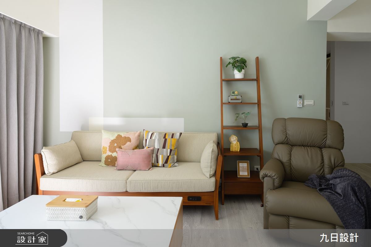 九日設計以木作、系統櫃、油漆、磁磚、玻璃、人造石、石塑地板的搭配應用,呈現混搭風居家氛圍,將此間23坪、三房、單層、老屋(16~30年)打造成舒適愜意的家庭空間,完成2位大人全家人的夢想之居。