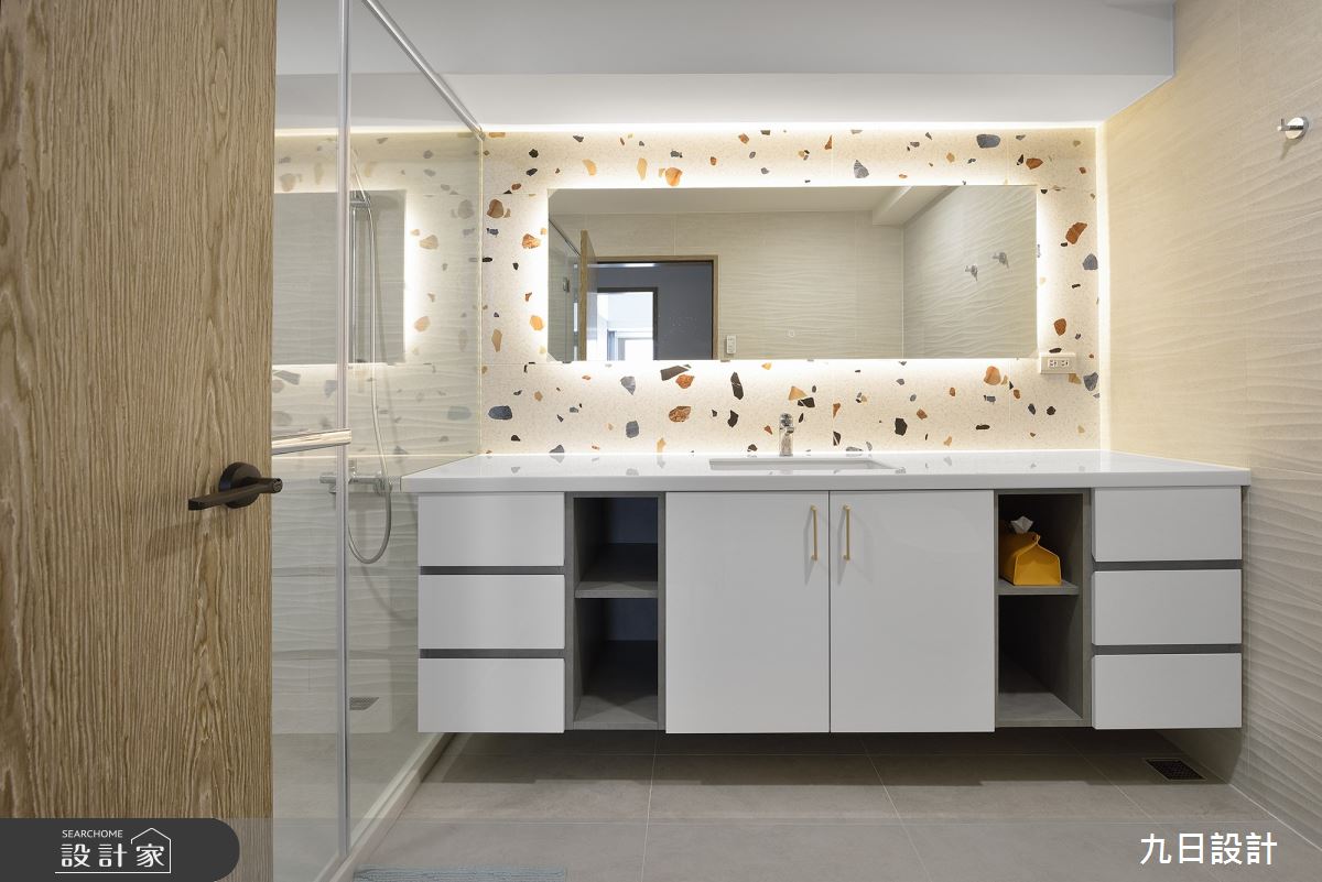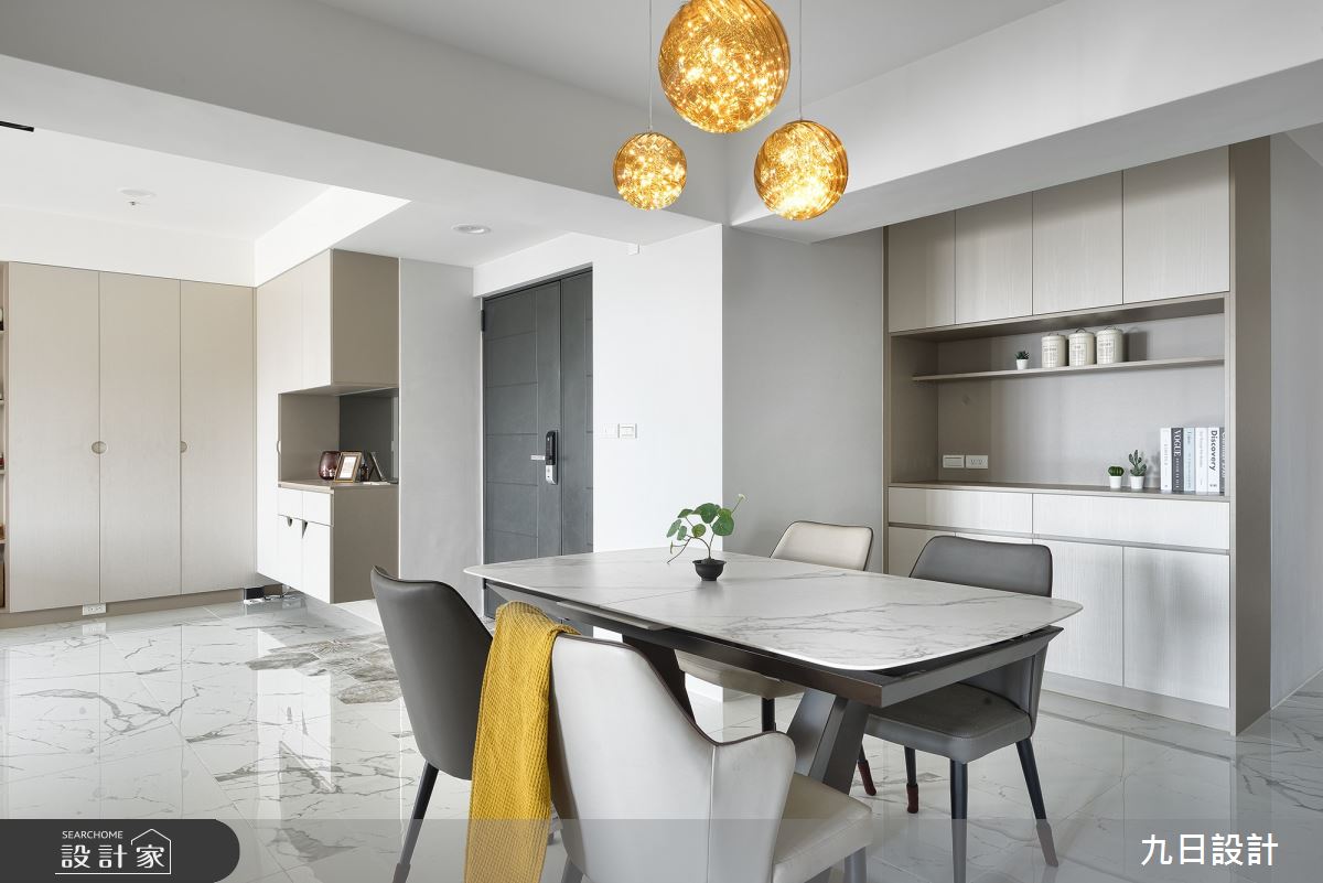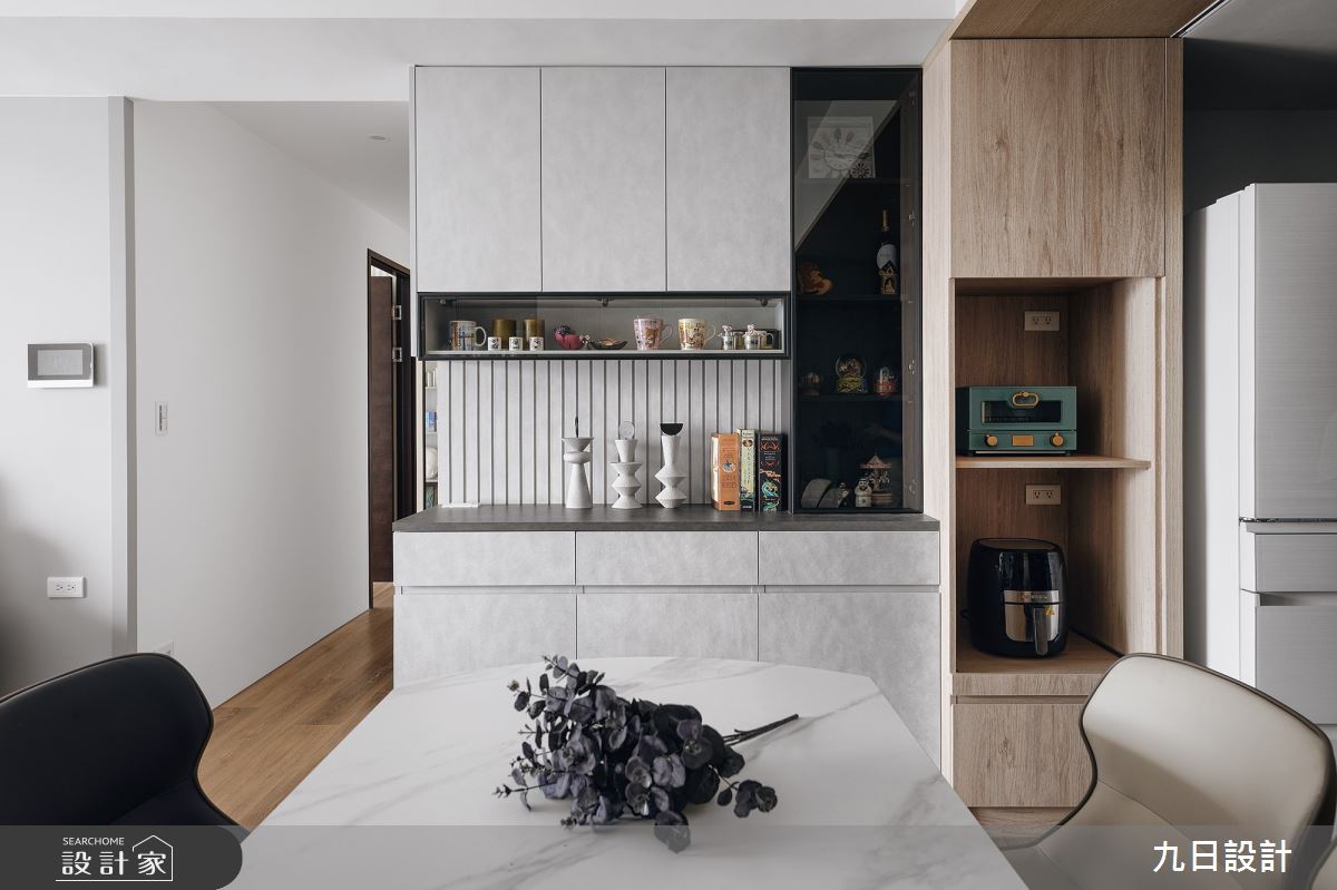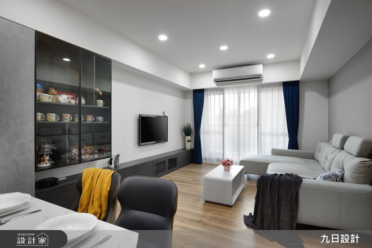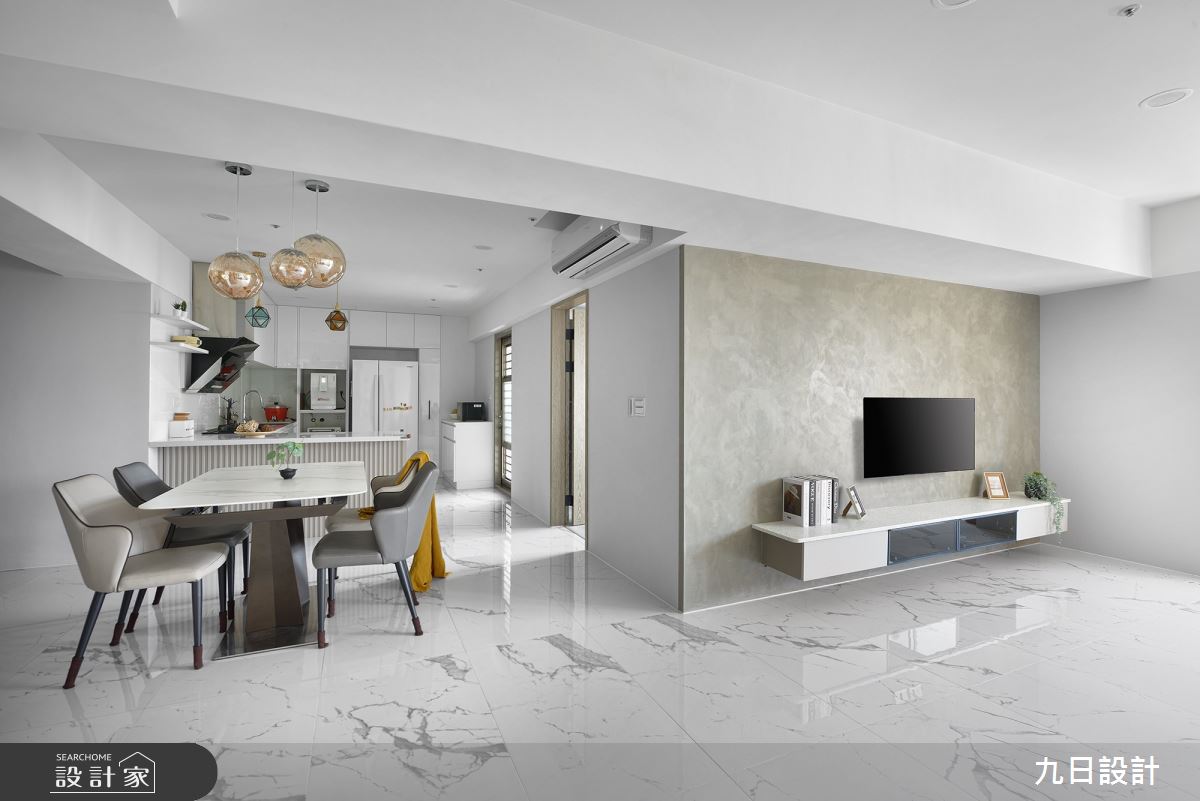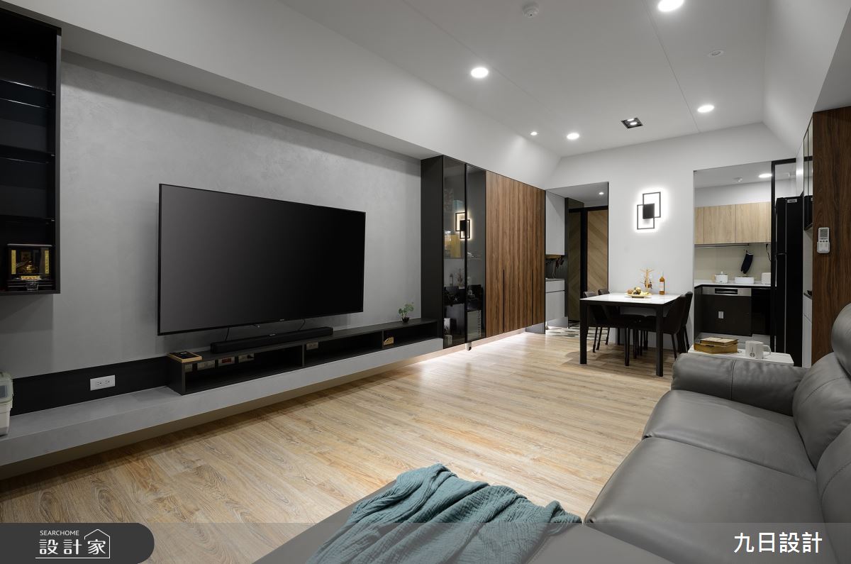 九日設計以木作、系統櫃、特殊漆、油漆、玻璃、壁紙、水磨石的搭配應用,呈現現代風居家氛圍,將此間23坪、三房、單層、新成屋(5年以下)打造成舒適愜意的家庭空間,完成2位大人全家人的夢想之居。