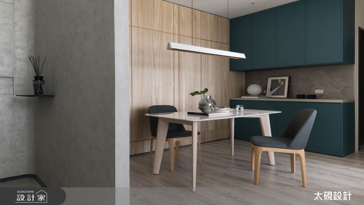 太硯設計以鐵件、超耐磨木地板、梧桐木皮、樂土、六角花磚、系統板材的搭配應用,呈現現代風居家氛圍,將此間23坪、三房、單層、新成屋(5年以下)打造成舒適愜意的家庭空間,完成2位大人、1位小孩全家人的夢想之居。
