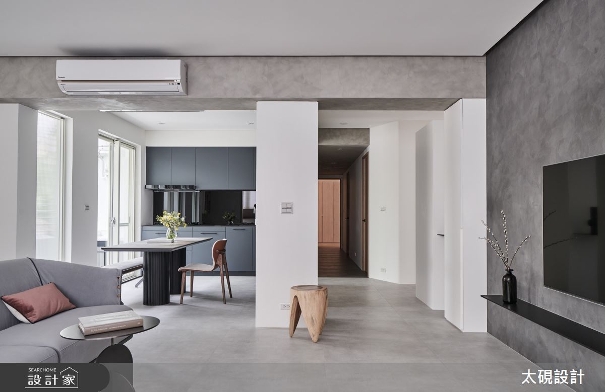 來自太硯設計的43坪現代風住宅案,屋主一家人共有2位大人、1位小孩,是一間單層老屋(50年以上)的三房格局,設計師藉由建材以乳膠漆、超耐磨木地板、鐵件、樂土、薄板的搭配應用,實現一家人的理想生活。