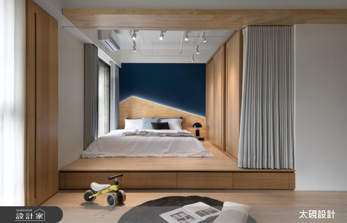 16 坪休閒風居宅,屋主為一對年輕工程師夫妻,即將迎來二寶的他們,希望把最好的留給小孩們,期待他們的童年環境,能任意揮灑創意且自由無拘束。考量小坪數的最大化應用,讓主臥結合公領域變身多功能大遊戲區,設計師創新思維與屋主開放心態的完美配合,成就屬於他們一家人的自由年代。 畸零、轉角多的新成屋,其實採光良好且擁有絕佳自然山景,為展現屋況優勢及發揮小坪數空間,格局調整上最大變更即為拆除主臥門片,僅以拉簾及架高地坪區隔,不但引來優秀光源,串聯客廳即變身開放式大遊戲區,提供小小孩們舒適且開放的環境。另外一間獨立房,目前為夫妻工作書房,日後也能因應小孩成長而作變更。收納設計上以輕盈量體呈現,從一進門的玄關的格柵掛勾、大型開放收納設計、電視牆不落地層架,到餐櫥櫃門的隱形把手設計,整頓乾淨俐落視覺,也兼具了造型美觀。而電視牆收納櫃高度悉心考量,配合兒童桌椅收納尺寸,方便收整也能訓練小孩培養收拾好習慣。 小編的最愛 電視牆灰質主色彩,跳脫大量木色家具視覺,屋主夫婦嚮往的休閒氣息冉冉而升;白天開放成為遊戲區一隅的主臥,著眼於背牆造型設計,一道簡潔俐落的山字型造型,透過間接光源及公爵藍巧思,替休閒風設計注入活潑氣氛。